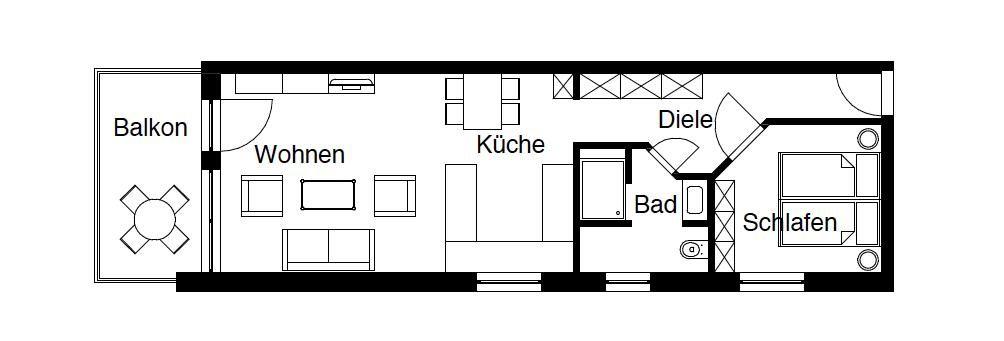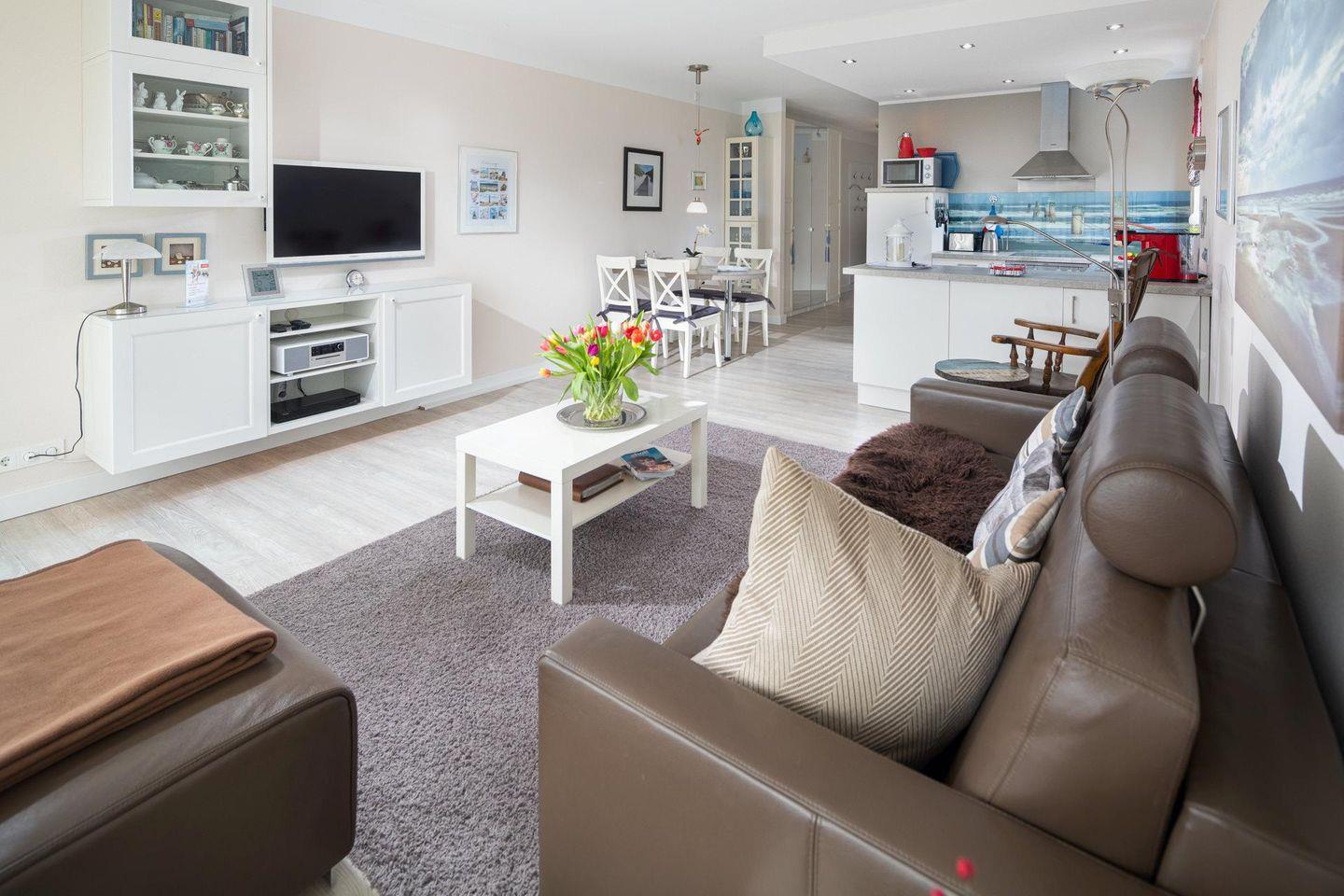 Die Wohnung selbst zeichnet sich durch die helle und lichtdurchflutete Einrichtung aus. Das kleine, aber gemütliche Schlafzimmer ist mit einem Doppelbett (1,60m x 2,00m) ausgestattet. Das Wohnzimmer integriert einen sehr gut ausgestatteten Küchenbereich. Das moderne Bad der Wohnung ist mit einem WC, einem Handwaschbecken und einer Dusche ausgestattet. Eine Besonderheit ist der integrierte "Sunshower" in der Duschkabine. Zudem verfügt die Wohnung über einen ca. 8 qm großen Südbalkon.