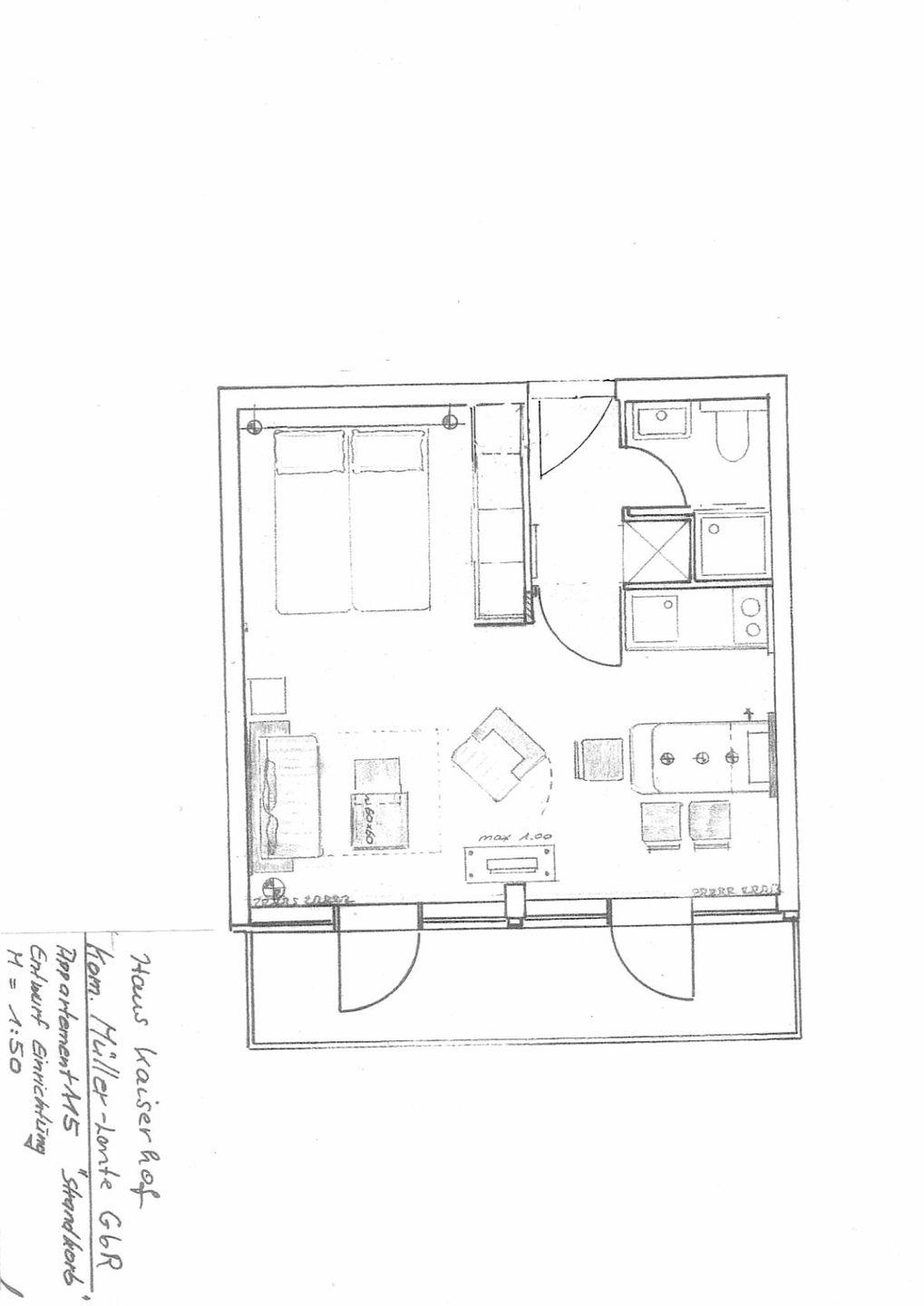 Die Wohnung wurde hell und mit Naturfarben eingerichtet. Das Wohn-Schlafzimmer wurde mit einem Doppelbett ausgestattet. Die Küchenzeile ist sehr gut ausgestattet, verfügt aber über keinen Backofen, dafür ist eine Mikrowelle vorhanden. Der Balkon mit einem seitlichen Blick auf das Meer ist das kleine Highlight der Wohnung. Im Apartmenthaus "Kaiserhof" stehen den Bewohnern eine Waschmaschine und ein Wäschetrockner (beide mit Münzeinwurf) zur Verfügung. Zusätzlich steht eine Sauna bereit, die ebenfalls gegen Münzeinwurf nutzbar ist. Es ist zu beachten, dass das Schwimmbad aufgrund eines technischen Defektes geschlossen ist. Fahrräder können vor dem Haus (Nordseite) oder im Fahrradraum abgestellt werden. Hier darf auch der vierbeinige Freund mitkommen, denn die Ferienwohnung heißt auch Hunde herzlich willkommen. Erlaubt ist maximal 1 Hund (Höhe maximal kniehoch). Die Hundewiese befindet sich in der Nähe des Fährhafens (kein Leinenzwang).