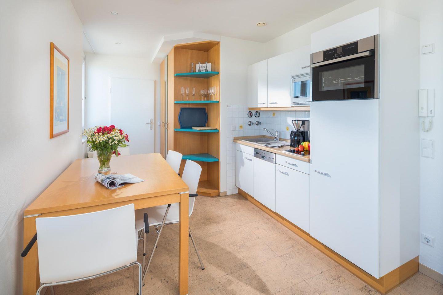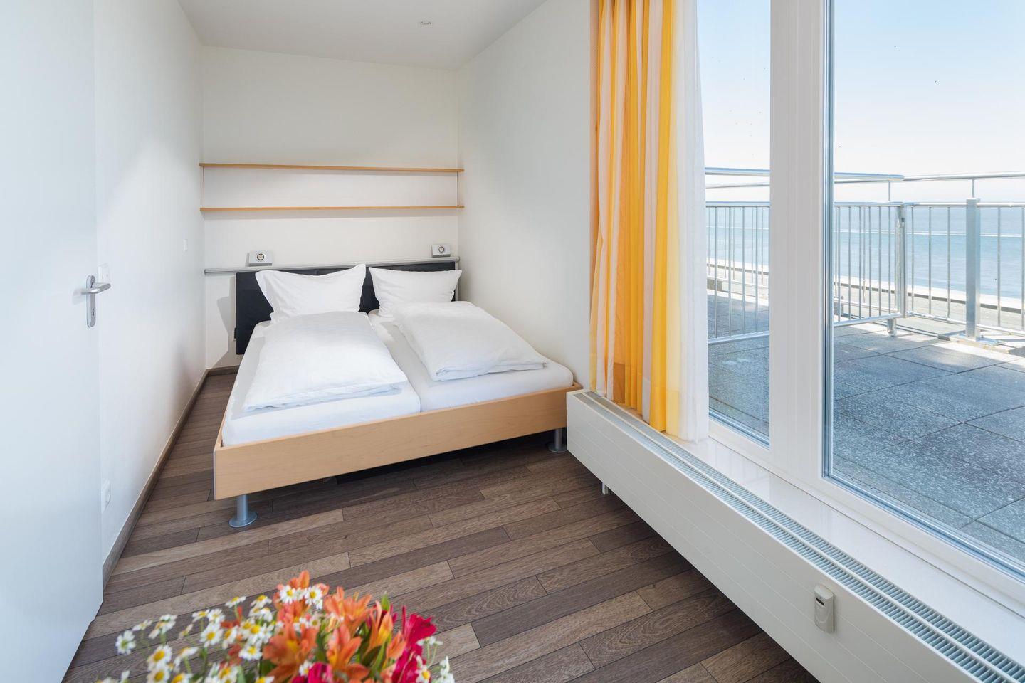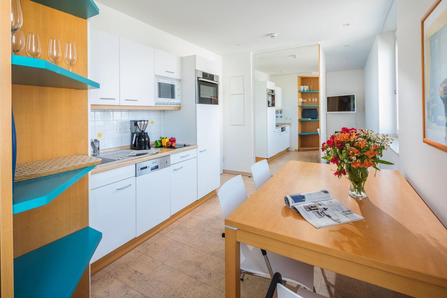 Die Wohnung im Penthouse verfügt über einen Küchen-/Essbereich, ein Wohn-/Schlafzimmer mit einem Doppelbett und einer Schlafcouch sowie ein Badezimmer mit Dusche und WC. Die umlaufende Terrasse ist das Highlight der Wohnung und bietet einen Panoramablick direkt auf das Meer. Im Apartmenthaus "Kaiserhof" stehen den Bewohnern eine Waschmaschine und ein Wäschetrockner (beide mit Münzeinwurf) zur Verfügung. Zusätzlich steht eine Sauna bereit, die ebenfalls gegen Münzeinwurf nutzbar ist. Es ist zu beachten, dass das Schwimmbad aufgrund eines technischen Defektes geschlossen ist. Fahrräder können vor dem Haus (Nordseite) oder im Fahrradraum abgestellt werden. Hier darf auch der vierbeinige Freund mitkommen, denn die Ferienwohnung heißt auch Hunde herzlich willkommen. Erlaubt ist maximal 1 Hund (Höhe maximal kniehoch). Die Hundewiese befindet sich in der Nähe des Fährhafens (kein Leinenzwang).