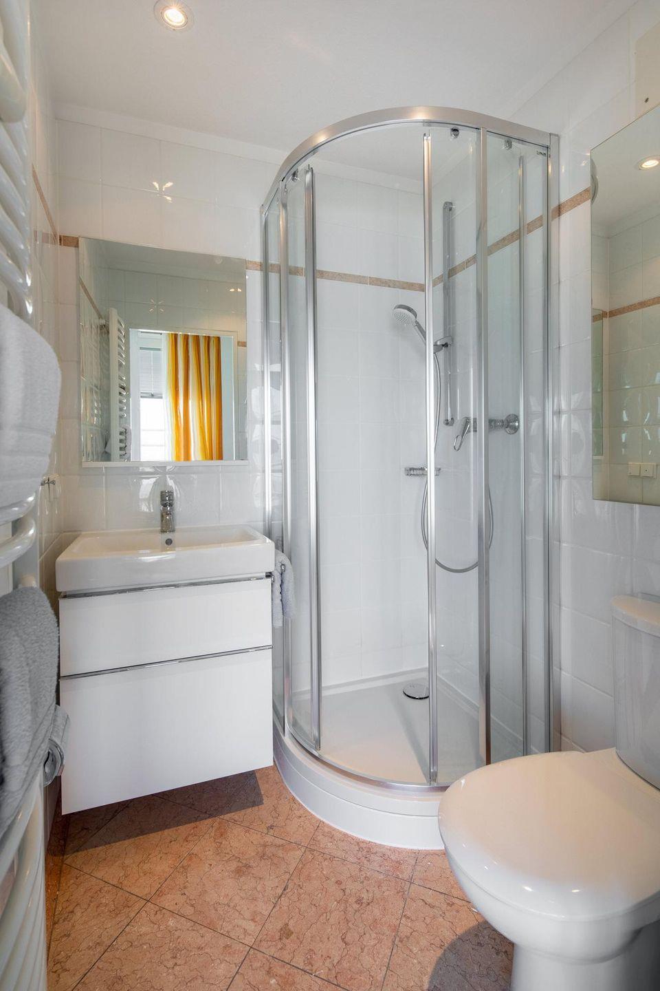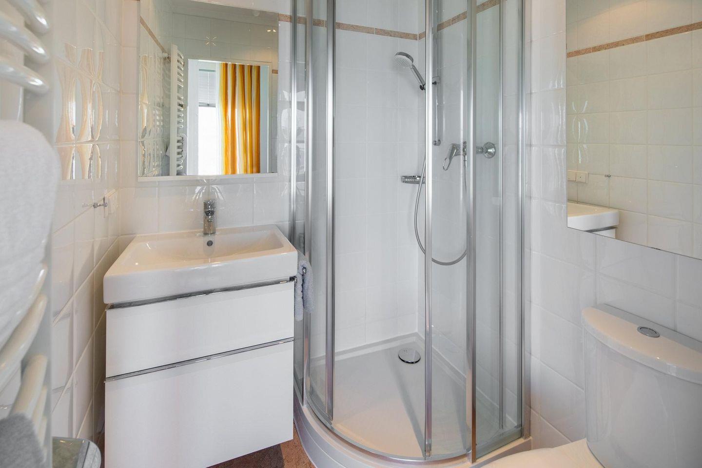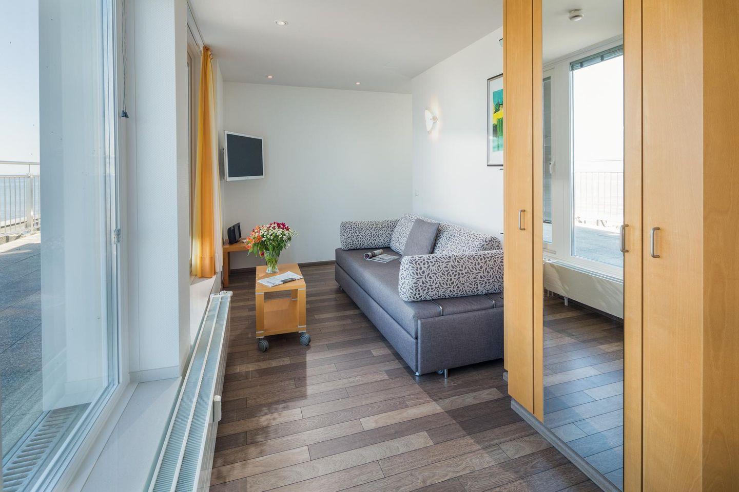 Die Wohnung im Penthouse verfügt über einen Küchen-/Essbereich, ein Wohn-/Schlafzimmer mit einem Doppelbett und einer Schlafcouch sowie ein Badezimmer mit Dusche und WC. Die umlaufende Terrasse ist das Highlight der Wohnung und bietet einen Panoramablick direkt auf das Meer. Im Apartmenthaus "Kaiserhof" stehen den Bewohnern eine Waschmaschine und ein Wäschetrockner (beide mit Münzeinwurf) zur Verfügung. Zusätzlich steht eine Sauna bereit, die ebenfalls gegen Münzeinwurf nutzbar ist. Es ist zu beachten, dass das Schwimmbad aufgrund eines technischen Defektes geschlossen ist. Fahrräder können vor dem Haus (Nordseite) oder im Fahrradraum abgestellt werden. Hier darf auch der vierbeinige Freund mitkommen, denn die Ferienwohnung heißt auch Hunde herzlich willkommen. Erlaubt ist maximal 1 Hund (Höhe maximal kniehoch). Die Hundewiese befindet sich in der Nähe des Fährhafens (kein Leinenzwang).