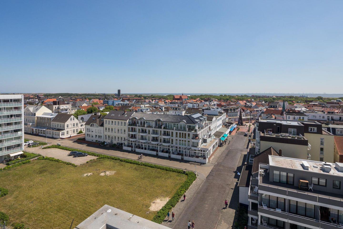 Die Ferienwohnung "Kaiserhof 96 (Penthouse)" befindet sich im Apartmenthaus "Kaiserhof", das an der Ecke Bismarckstraße und Kaiserstraße liegt. Das Haus liegt direkt am Meer, nur wenige Schritte vom Strand entfernt. Die Wohnung befindet sich im achten Stock und bietet Platz für bis zu 2 Personen. Im Haus gibt es einen Fahrstuhl.
