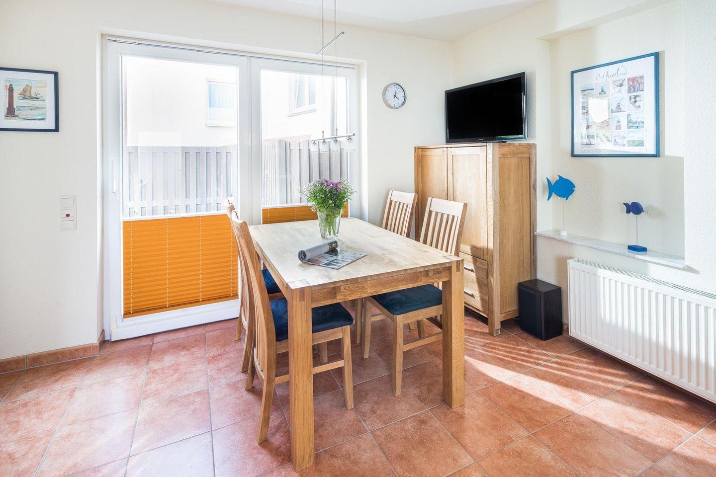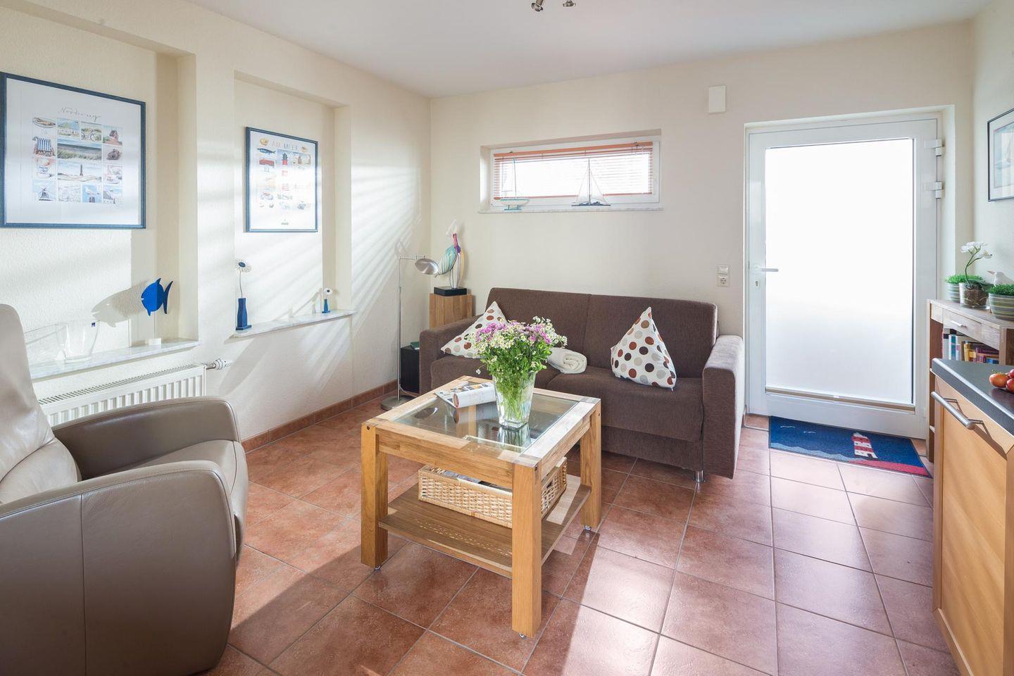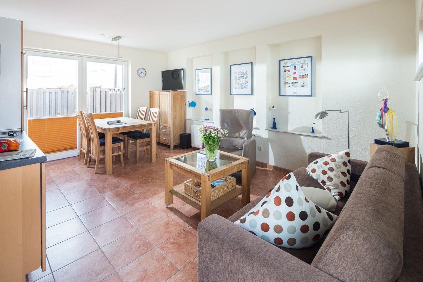 Die Inneneinrichtung der Ferienwohnung "Insel-Sonne" ist hell gestaltet. Der Wohnraum ist mit Fliesen ausgelegt. Sämtliche Fenster- und Türöffnungen sind mit Plissees ausgestattet. Im Wohnbereich befindet sich ein Schlafsofa mit einer Matratze. Zudem befinden sich dort ein Flachbildschirm, ein DVD-Player und eine HiFi-Anlage. Das Schlafzimmer ist mit einem Doppelbett ausgestattet. Die Küchenzeile befindet sich im Wohnbereich und beinhaltet alle notwendigen Utensilien, ist jedoch ohne Backofen ausgestattet worden. Ein Highlight der Ferienwohnung ist die umzäunte Süd/Ost Terrasse. Diese Terrasse ist mit einer Markise und Gartenmöbeln ausgestattet. Hunde sind hier nicht erlaubt.