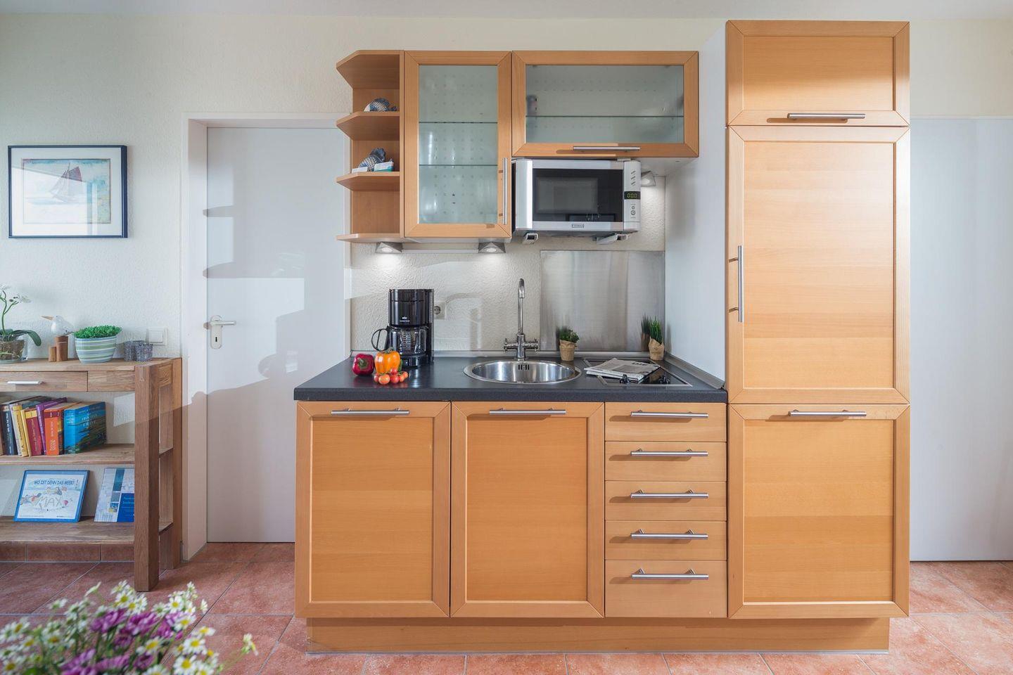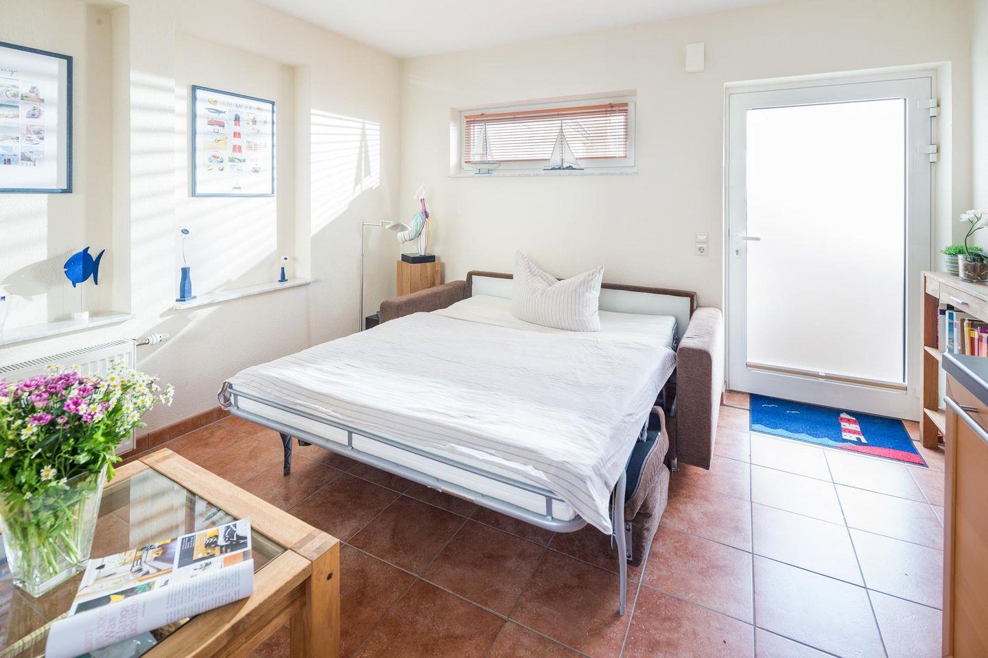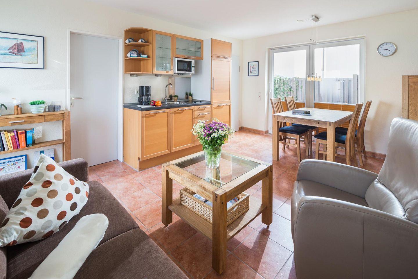 Die Inneneinrichtung der Ferienwohnung "Insel-Sonne" ist hell gestaltet. Der Wohnraum ist mit Fliesen ausgelegt. Sämtliche Fenster- und Türöffnungen sind mit Plissees ausgestattet. Im Wohnbereich befindet sich ein Schlafsofa mit einer Matratze. Zudem befinden sich dort ein Flachbildschirm, ein DVD-Player und eine HiFi-Anlage. Das Schlafzimmer ist mit einem Doppelbett ausgestattet. Die Küchenzeile befindet sich im Wohnbereich und beinhaltet alle notwendigen Utensilien, ist jedoch ohne Backofen ausgestattet worden. Ein Highlight der Ferienwohnung ist die umzäunte Süd/Ost Terrasse. Diese Terrasse ist mit einer Markise und Gartenmöbeln ausgestattet. Hunde sind hier nicht erlaubt.
