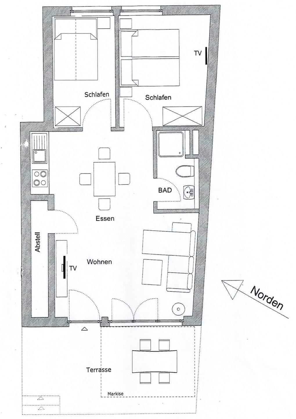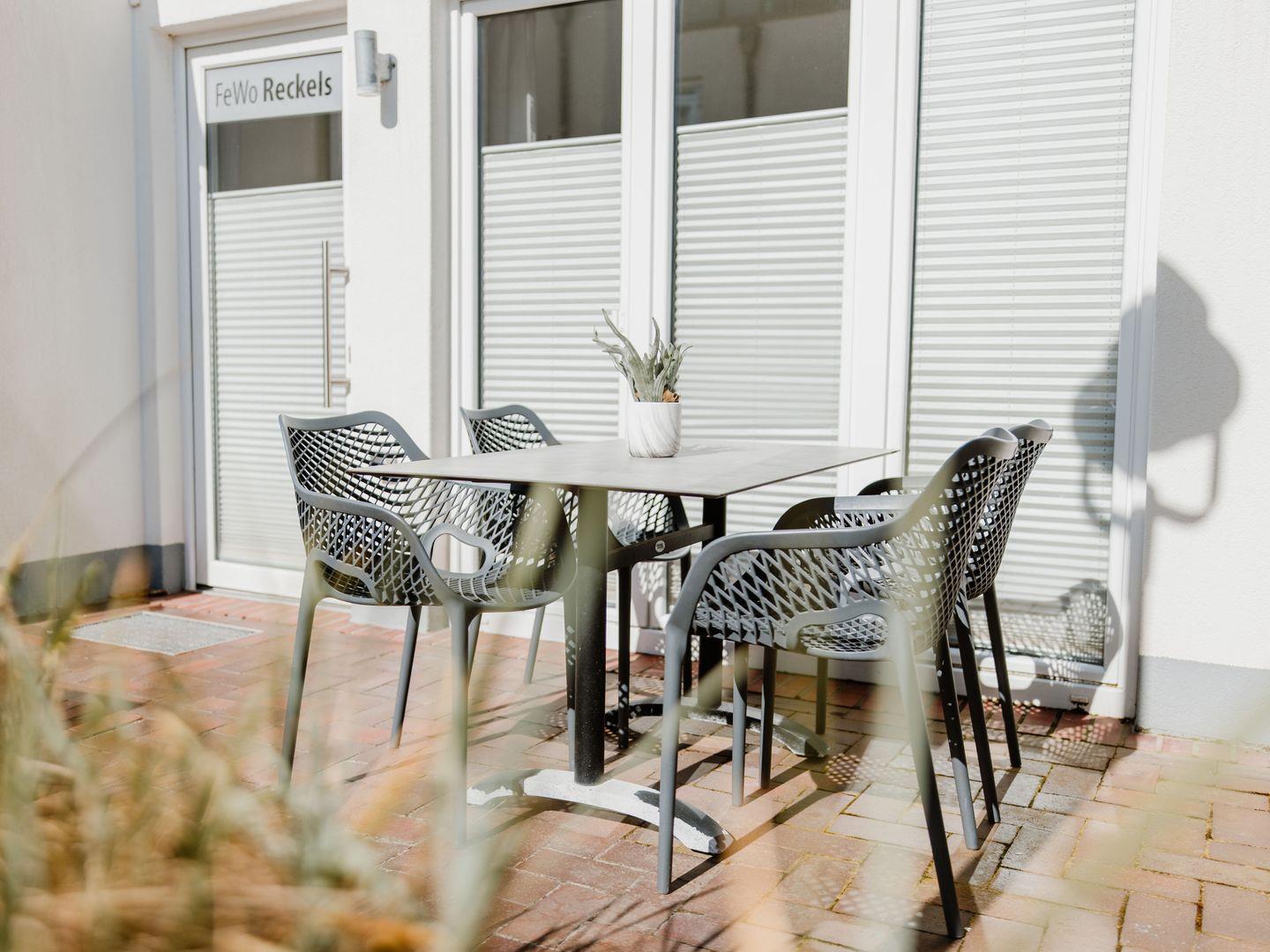 Das Ferienapartment wurde kürzlich renoviert und mit hochwertigen Möbeln neu eingerichtet. Die Wohnung verfügt über einen Wohnraum mit einer gut ausgestatteten Küchenzeile und zwei Schlafzimmer mit je einem Doppelbett (1,80m x 2,00m und 1,40m x 2,00m). Ein Highlight der Wohnung "Reckels" ist die Terrasse in Süd-West-Ausrichtung (ausgestattet mit einer großen Markise). Eine Waschmaschine befindet sich im Waschraum. Der Schlüssel zu dem Raum befindet sich am Schlüsselbund (Zugang über Knyphausenstr. 26/ Haupteingang). Hunde sind in dieser Wohnung nicht erlaubt.