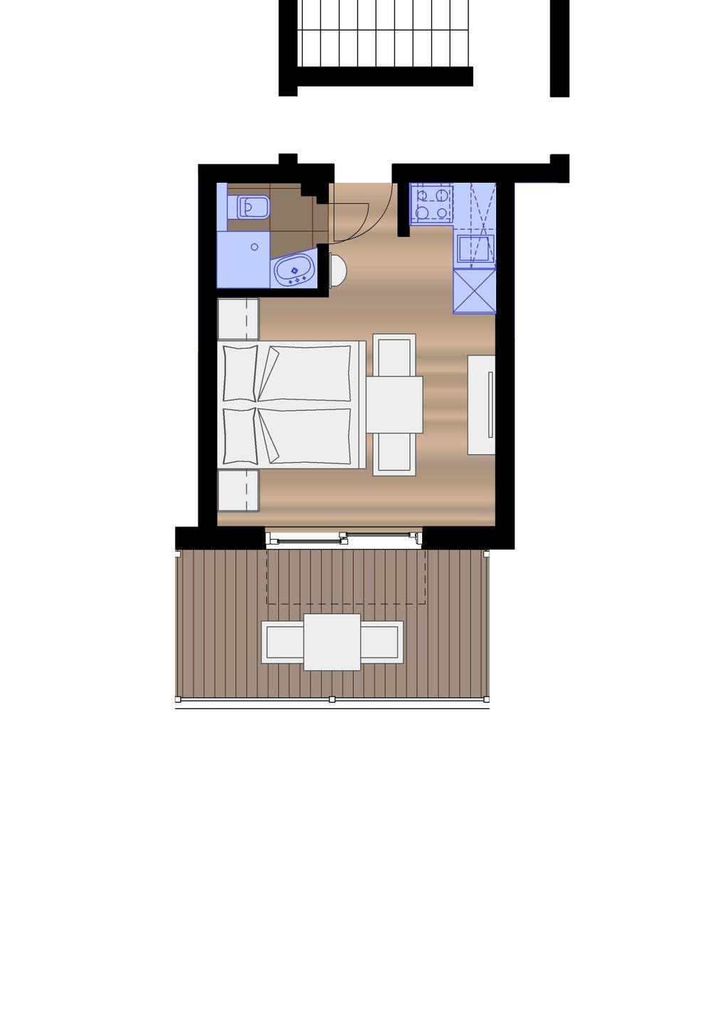 Die Wohnung verfügt über ein kombiniertes Wohn- und Schlafzimmer mit einem Doppelbett. Die Küchenzeile ist mit allen notwendigen Geräten und Utensilien ausgestattet. Das Badezimmer ist modern gestaltet und verfügt über eine Dusche und ein WC. Ein Highlight der Wohnung ist der 9 Quadratmeter große Balkon. Waschmaschine und Wäschetrockner befinden sich im Haus und stehen (für die gemeinschaftliche Nutzung gegen Münzeinwurf) zur Verfügung, was besonders für längere Aufenthalte von Vorteil ist. Hunde sind in dieser Ferienwohnung nicht erlaubt.