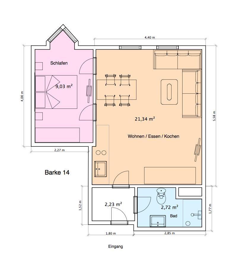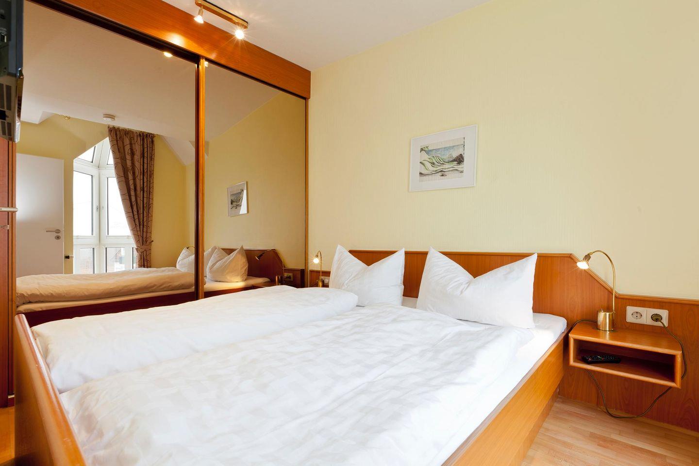 Das Schlafzimmer verfügt über ein Doppelbett (1,80m x 2,00m). Im Wohnzimmer sind dazu noch zwei Schrankbetten vorhanden. Weiter befindet sich im Wohnzimmer ein Blu-ray Player, der nicht nur Filme, sondern auch CDs und DVDs abspielen kann. Die Küche wurde mit einer Spülmaschine, einer Mikrowelle und einer Kaffeemaschine ausgestattet. Die gemeinschaftlich nutzbare Waschmaschine und der Wäschetrockner erfordern den Einwurf von Münzen. Die Wohnung ist groß genug für bis zu vier Personen und ist optimal für Familien, Paare oder Freunde. Hunde sind in dieser Wohnung nicht erlaubt.