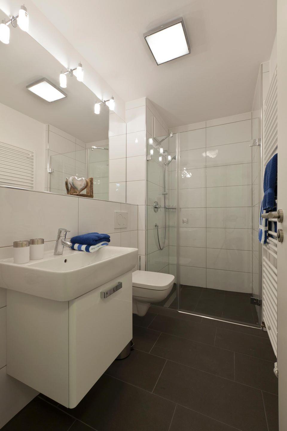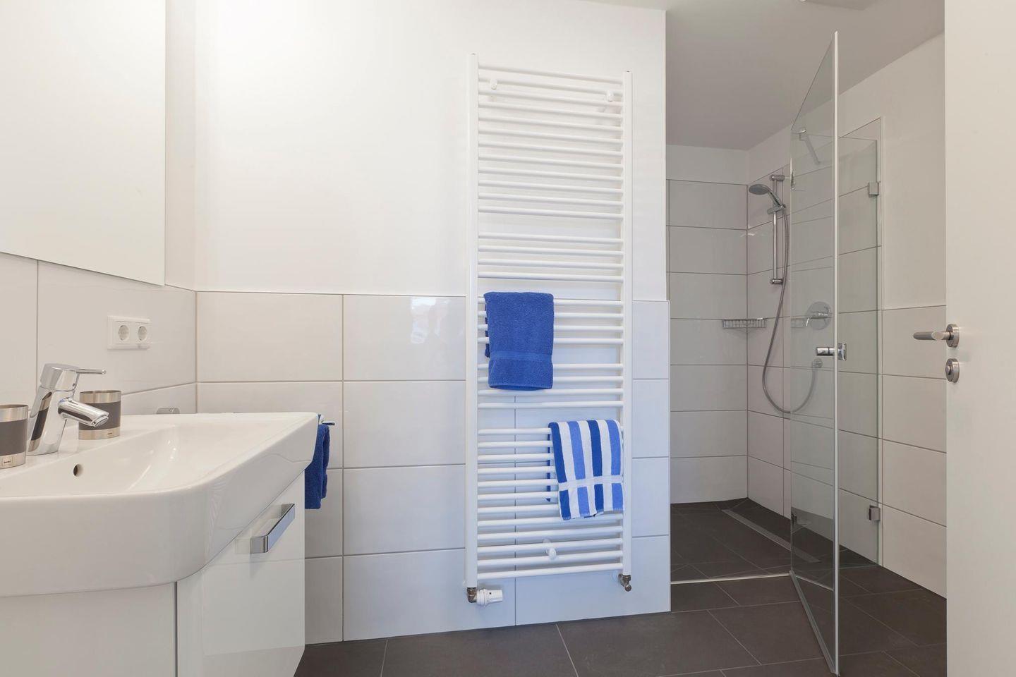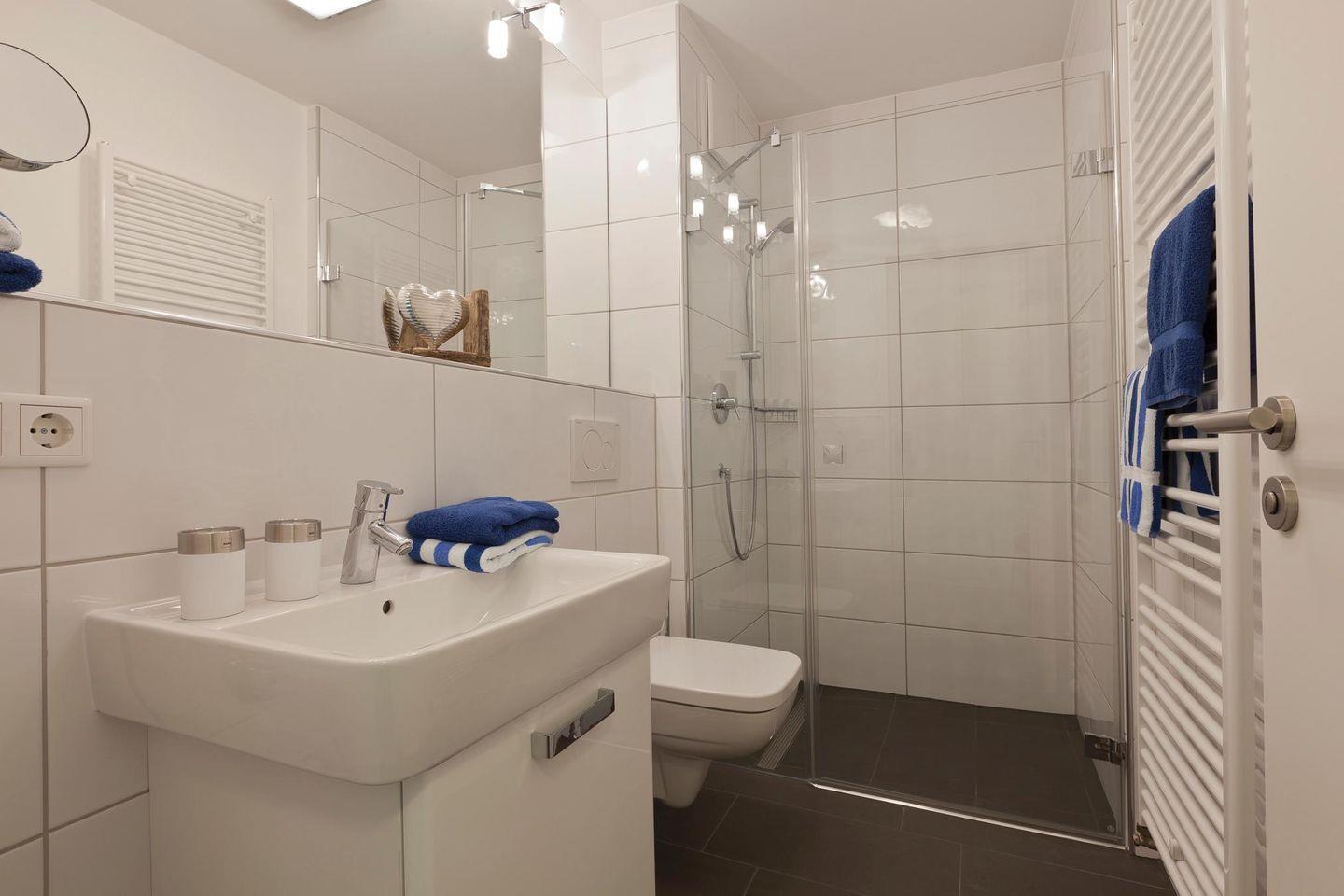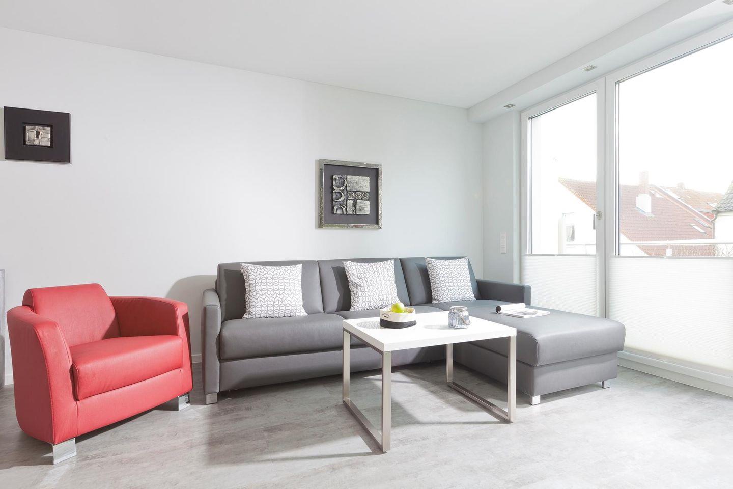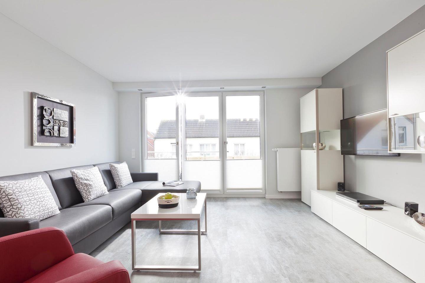 Auf 72 qm Wohnfläche sind zwei Schlafzimmer, ein Wohnzimmer mit integriertem Küchen- und Essbereich sowie zwei Bäder vorhanden. Jedes Schlafzimmer ist mit einem Doppelbett ausgestattet, wobei eines davon mit einer Länge von 2,20 m auch für größere Menschen geeignet ist. Die Couch im Wohnzimmer verfügt über eine Schlaffunktion, die einen zusätzlichen Schlafplatz bietet. Alle Schlafzimmer sind mit einem Fernseher ausgestattet, während das Wohnzimmer noch zusätzlich einen DVD-Player und einen Safe bietet. Die Wohnung verfügt über zwei Terrassen, von denen eine mit einer Markise ausgestattet ist. Für Fahrräder stehen überdachte Abstellmöglichkeiten am Haus zur Verfügung. Waschmaschine und Wäschetrockner befinden sich im Haus und stehen (für die gemeinschaftliche Nutzung gegen Gebühr) zur Verfügung, was besonders für längere Aufenthalte von Vorteil ist. Hunde sind in dieser Ferienwohnung nicht erlaubt.