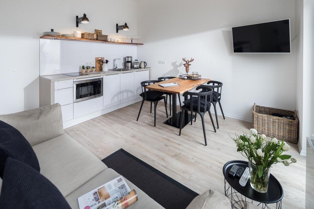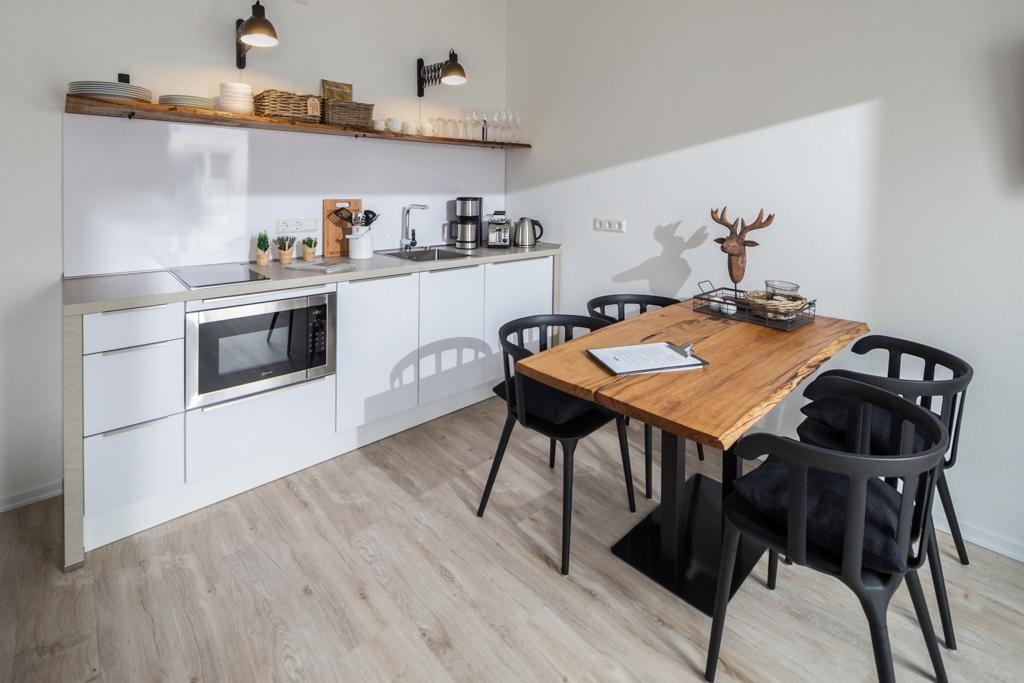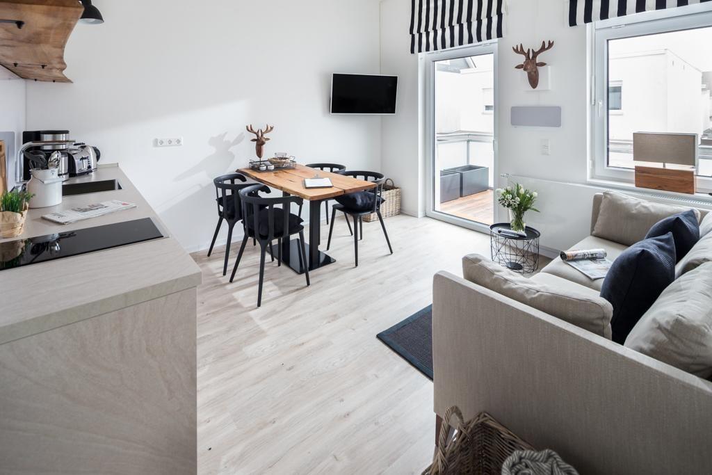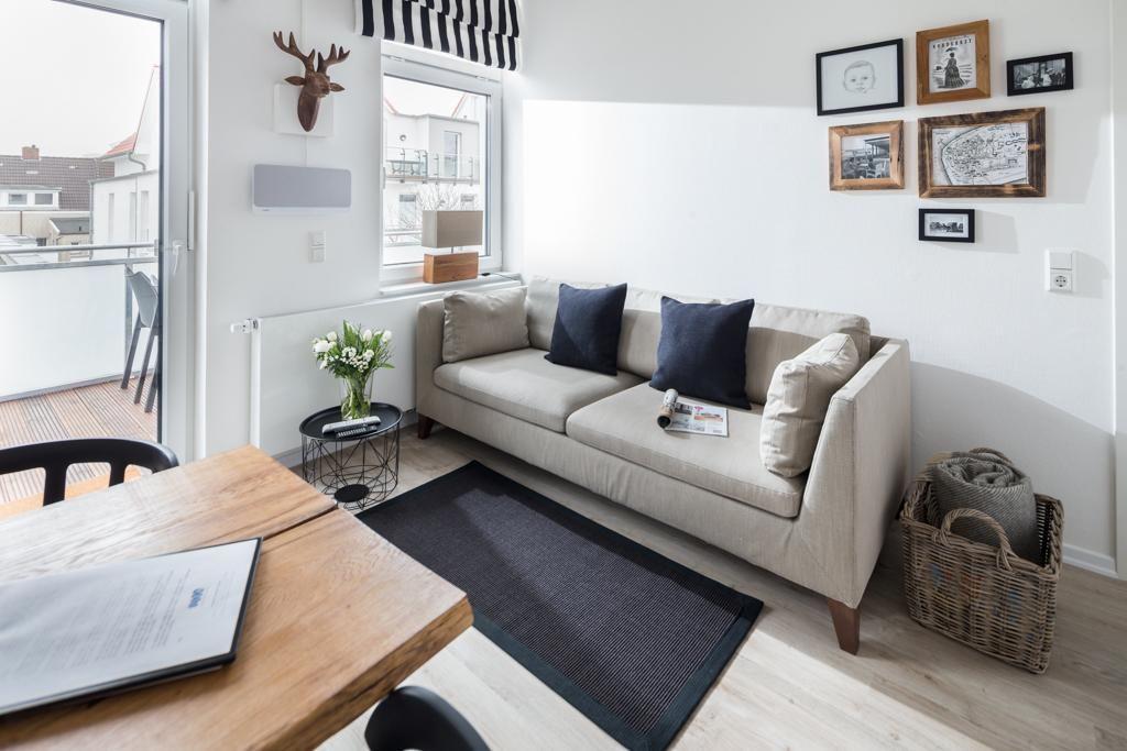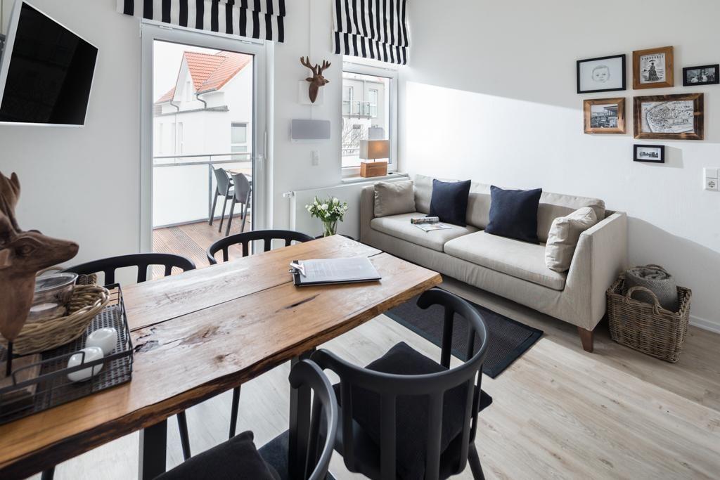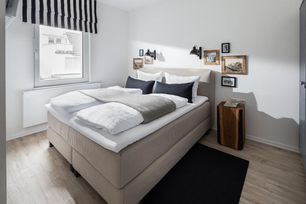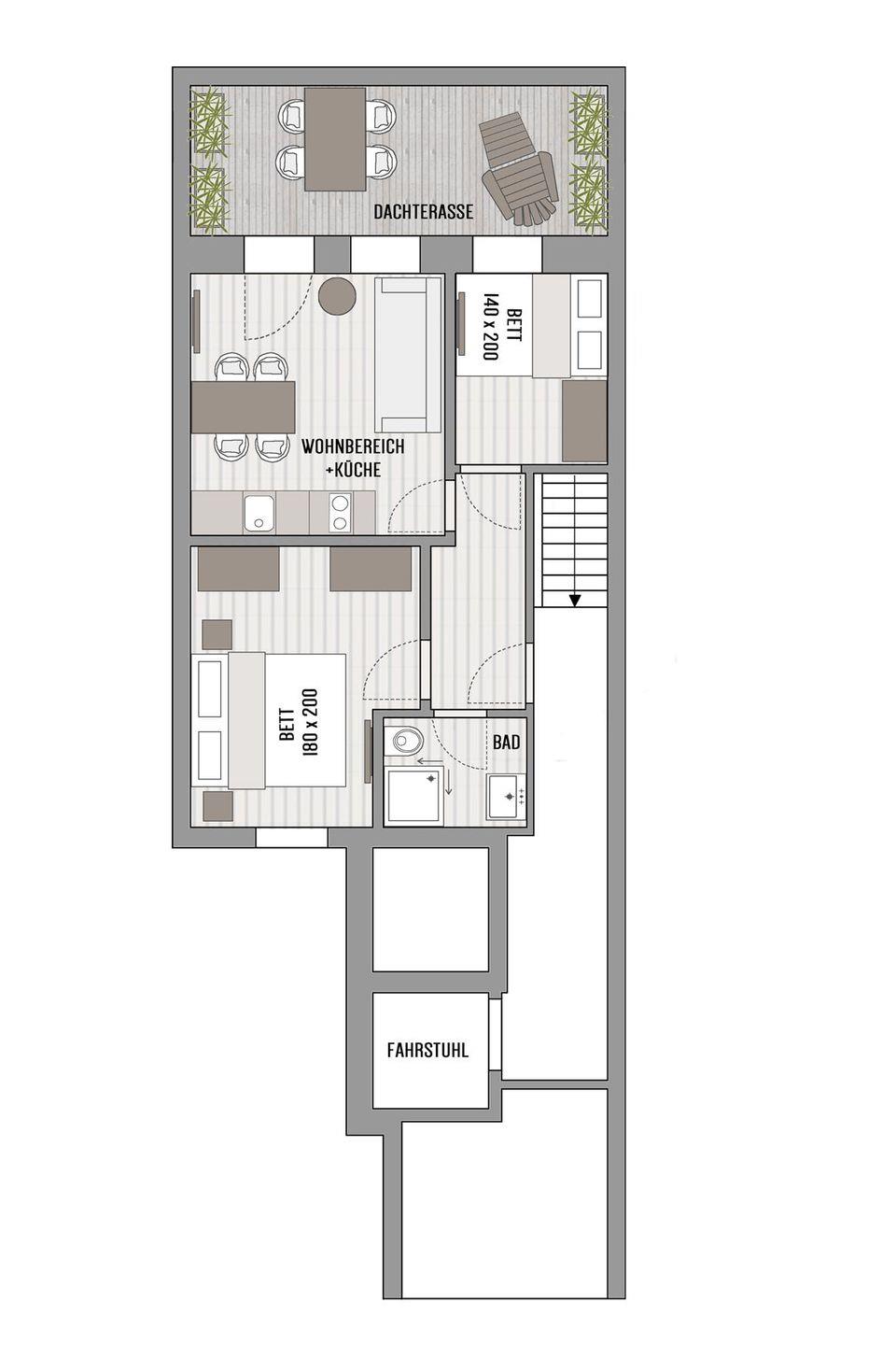 Die Wohnung ist neu und modern eingerichtet. Warme Farben, viel Holz und natürliche Stoffe dominieren den Einrichtungsstil. Die Wohnung hat zwei separate Schlafzimmer, die jeweils mit einem Boxspringbett ausgestattet sind. Zudem bietet die Wohnung ein Wohnzimmer mit offenem Küchen-/Essbereich. Ein Highlight der Wohnung ist die Dachterrasse mit einer Sitzgruppe und einer Liege. Die Wohnung verfügt über einen Glasfaseranschluss mit guter Übertragungsqualität. Im Hof bietet ein Schuppen Platz zum Abstellen von Fahrrädern oder auch eines Kinderwagens. Hunde sind in dieser Ferienwohnung nicht erlaubt.