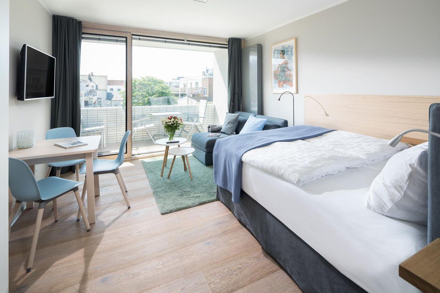 Das "Kleine Glück" ist eine helle, lichtdurchflutete 1-Raum-Wohnung, die durch ihr großes Panorama-Schiebefenster besticht. Die Wohnung wurde renoviert und mit hellen und natürlichen Farben eingerichtet. Der Boden ist mit schönen, massiven, weiß gebleichten Eichendielen ausgelegt. Der Wohn-Schlafraum ist mit einem Boxspringbett (1,60m x 2,00m) eingerichtet. Das moderne Badezimmer mit Dusche und WC ist funktional und modern gestaltet. Die maßgefertigte Küche ist gut ausgestattet. Ein Highlight der Wohnung "Kleines Glück" ist der 5,25 qm große Balkon, der nach Süd-Westen ausgerichtet ist. Haustiere sind hier nicht erlaubt.