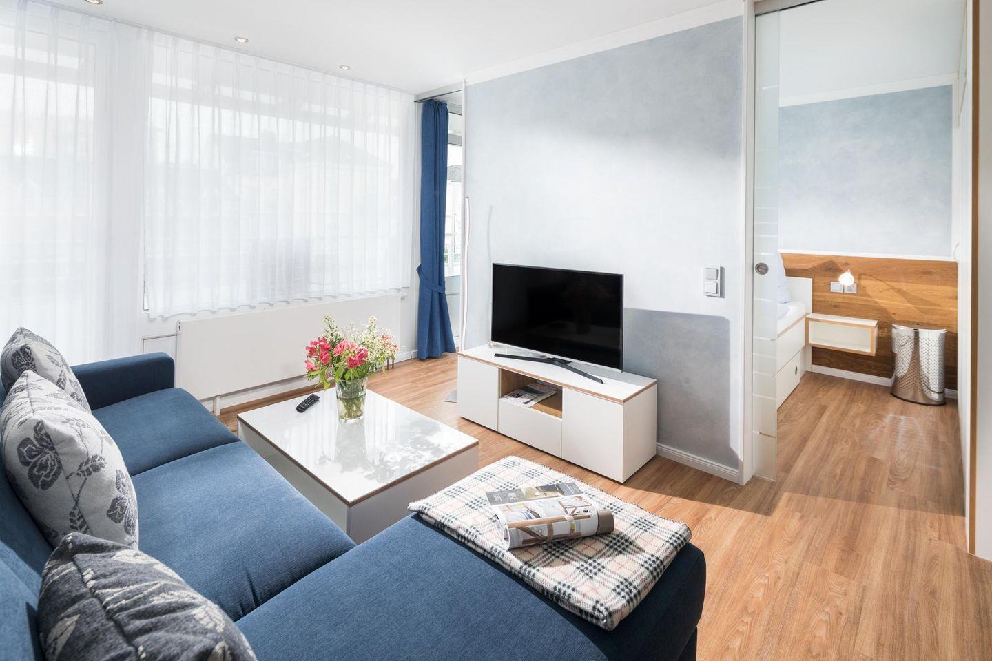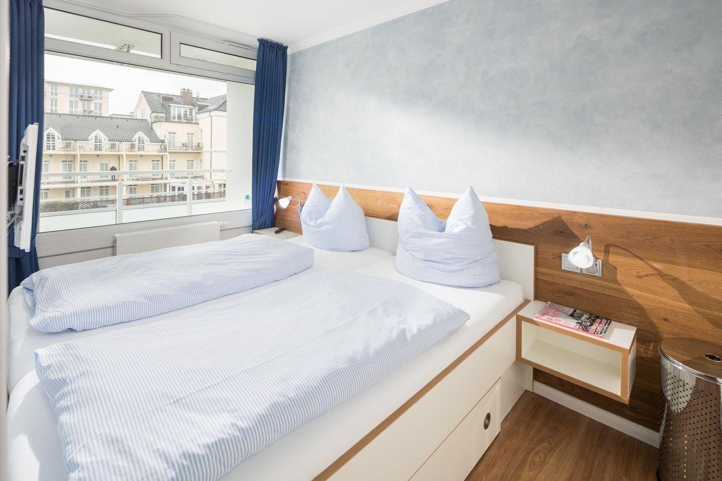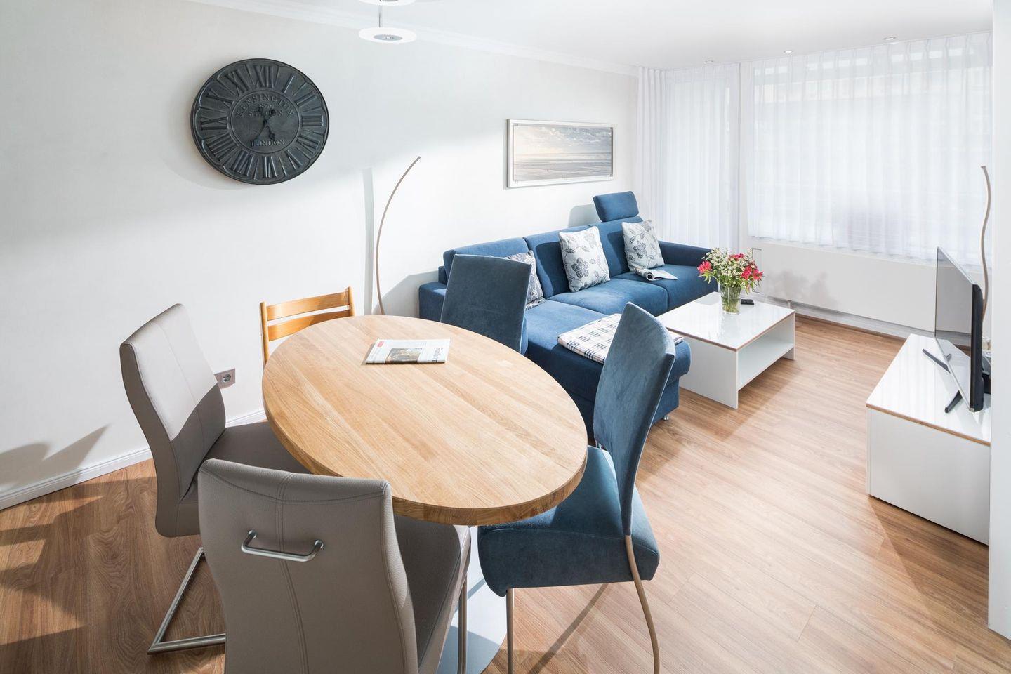 Die Wohnung Nr. 98 wurde kürzlich komplett erneuert und saniert. Die Möbel sind maßgeschneidert und bei der Einrichtung wurde Wert auf helle und maritime Farben gelegt. Das Wohn- und Schlafzimmer ist mit einem Doppelbett ausgestattet und die kleine Küchenecke ist sehr gut ausgestattet. Für eine dritte und gegebenenfalls vierte Person steht eine ausziehbare Schlafcouch mit einer Breite von 160 cm zur Verfügung. Der Balkon der Wohnung ist zur Landseite nach Osten ausgerichtet. Waschmaschine und Wäschetrockner befinden sich im Haus und stehen (für die gemeinschaftliche Nutzung gegen Münzeinwurf) zur Verfügung, was besonders für längere Aufenthalte von Vorteil ist. Hunde sind in dieser Ferienwohnung erlaubt. Erlaubt ist maximal 1 Hund (Höhe maximal kniehoch). Die Hundewiese befindet sich in der Nähe des Fährhafens (kein Leinenzwang).