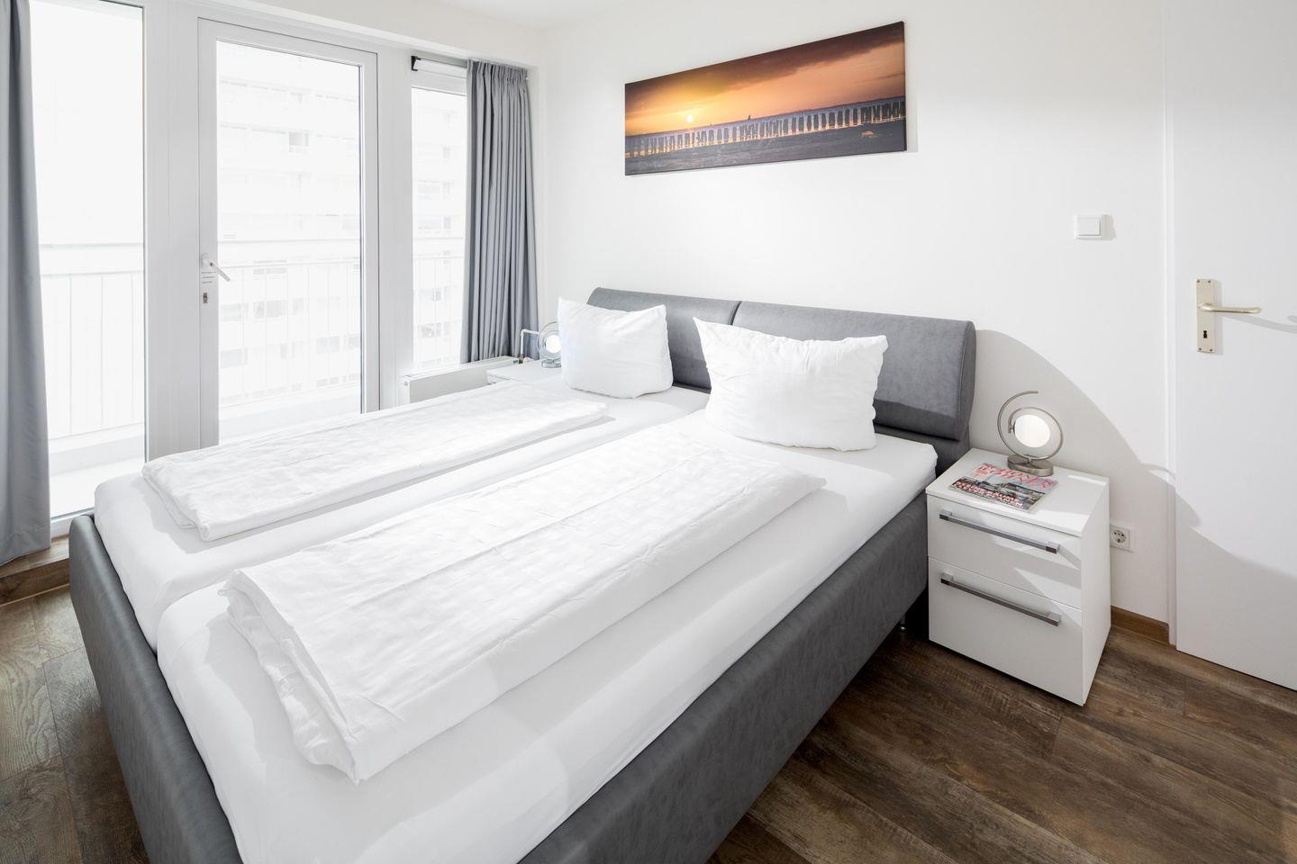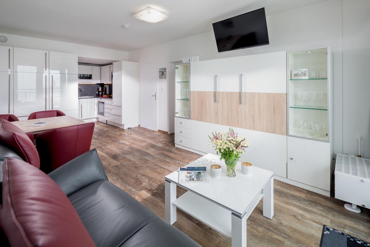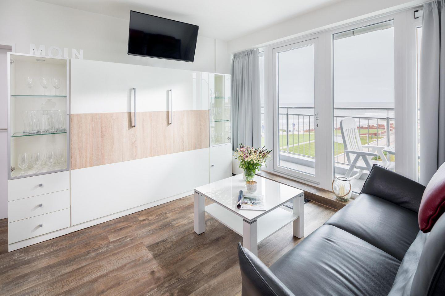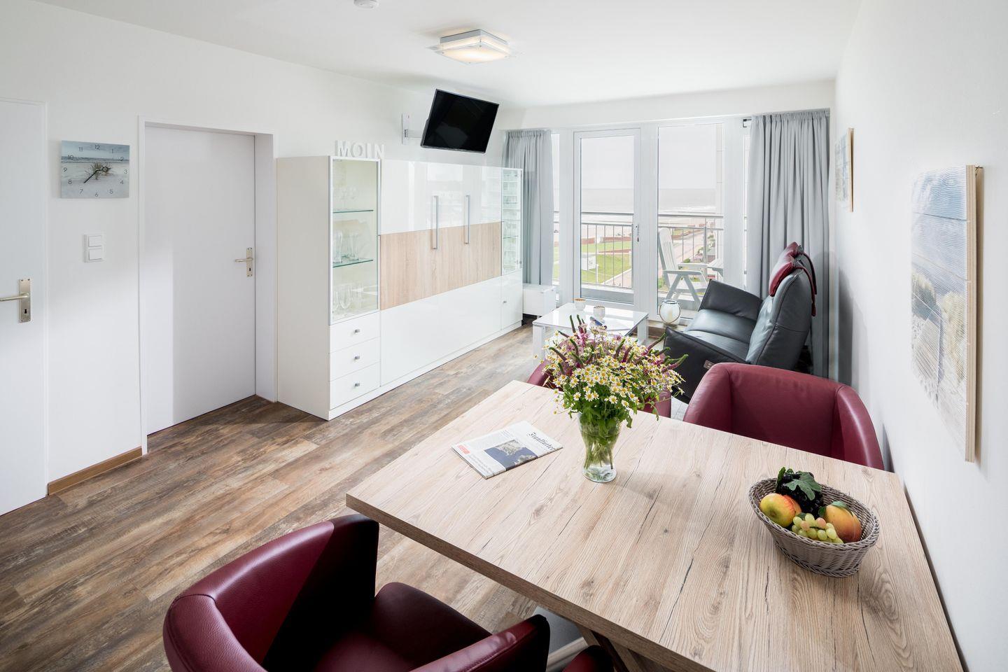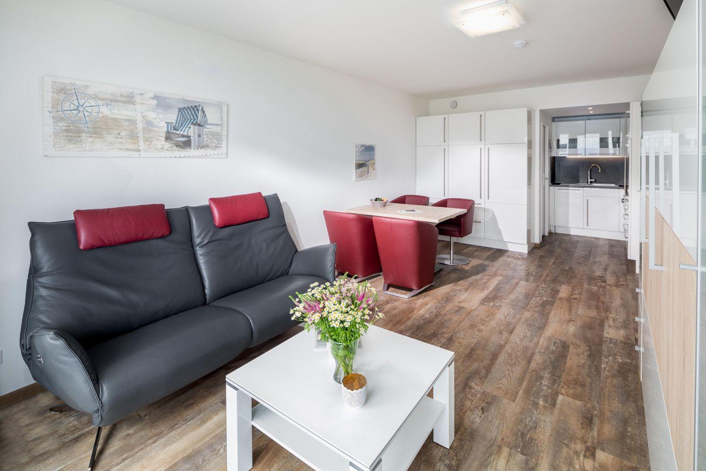Das separate Schlafzimmer verfügt über ein Doppelbett, während im Wohnzimmer zwei Schrankbetten für bis zu zwei weitere Personen zur Verfügung stehen. Die Schrankbetten, die sich tagsüber unauffällig verstauen lassen, sorgen für genug Bewegungsfreiheit innerhalb der Wohnung. Die Küche ist voll ausgestattet. Die Wohnung hat zudem einen Balkon mit seitlichem Blick auf das Meer. Im Apartmenthaus "Kaiserhof" stehen den Bewohnern eine Waschmaschine und ein Wäschetrockner (beide mit Münzeinwurf) zur Verfügung. Zusätzlich steht eine Sauna bereit, die ebenfalls gegen Münzeinwurf nutzbar ist. Es ist zu beachten, dass das Schwimmbad aufgrund eines technischen Defektes geschlossen ist. Fahrräder können vor dem Haus (Nordseite) oder im Fahrradraum abgestellt werden. Hier darf auch der vierbeinige Freund mitkommen, denn die Ferienwohnung heißt auch Hunde herzlich willkommen. Erlaubt ist maximal 1 Hund (Höhe maximal kniehoch). Die Hundewiese befindet sich in der Nähe des Fährhafens (kein Leinenzwang).