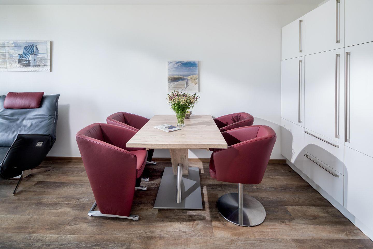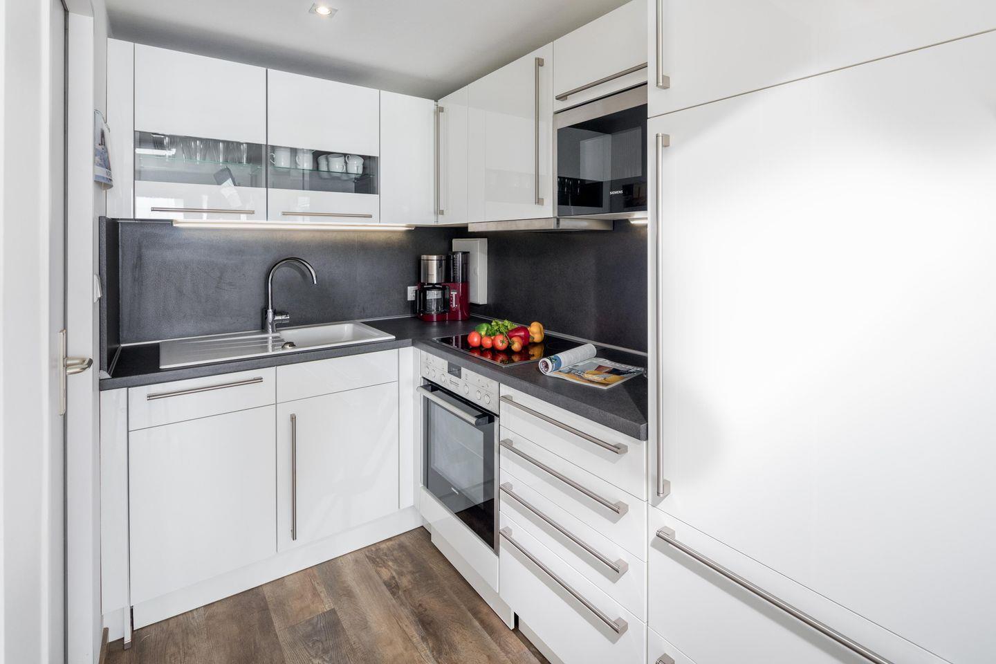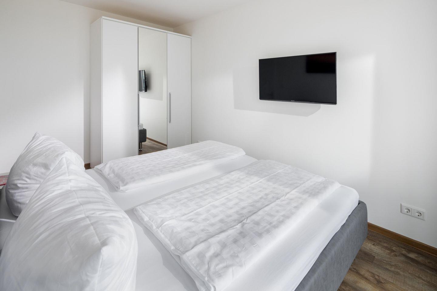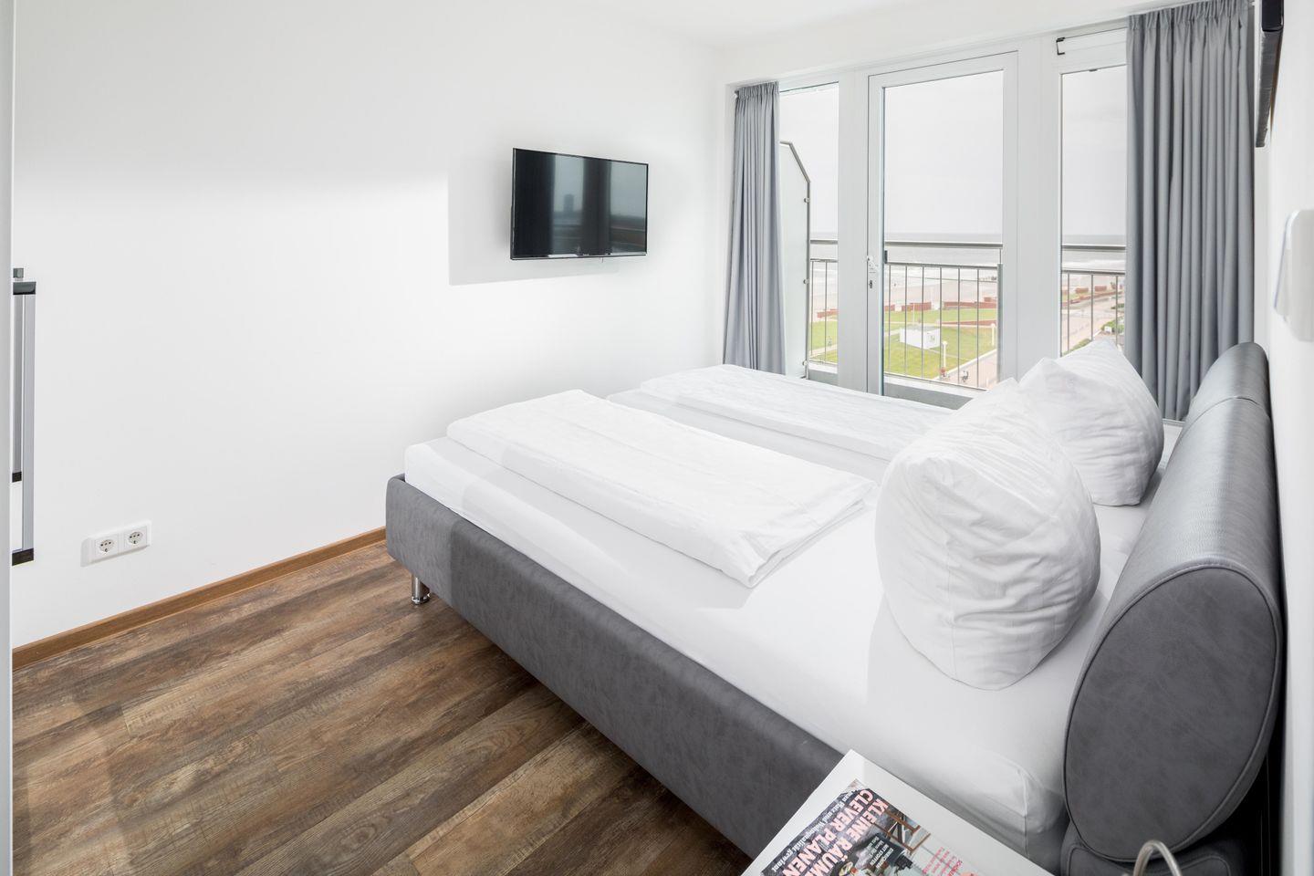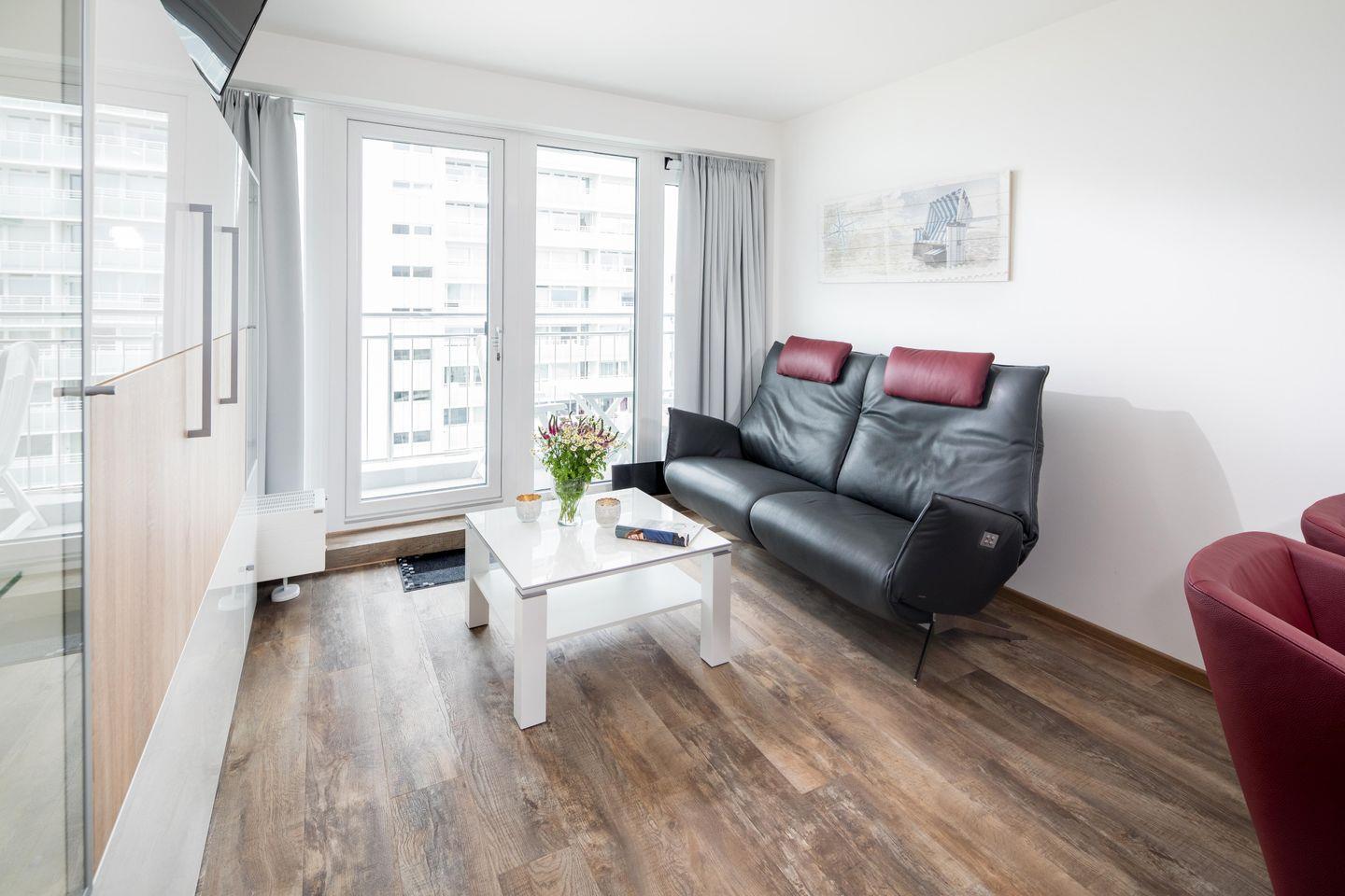Das separate Schlafzimmer verfügt über ein Doppelbett, während im Wohnzimmer zwei Schrankbetten für bis zu zwei weitere Personen zur Verfügung stehen. Die Schrankbetten, die sich tagsüber unauffällig verstauen lassen, sorgen für genug Bewegungsfreiheit innerhalb der Wohnung. Die Küche ist voll ausgestattet. Die Wohnung hat zudem einen Balkon mit seitlichem Blick auf das Meer. Im Apartmenthaus "Kaiserhof" stehen den Bewohnern eine Waschmaschine und ein Wäschetrockner (beide mit Münzeinwurf) zur Verfügung. Zusätzlich steht eine Sauna bereit, die ebenfalls gegen Münzeinwurf nutzbar ist. Es ist zu beachten, dass das Schwimmbad aufgrund eines technischen Defektes geschlossen ist. Fahrräder können vor dem Haus (Nordseite) oder im Fahrradraum abgestellt werden. Hier darf auch der vierbeinige Freund mitkommen, denn die Ferienwohnung heißt auch Hunde herzlich willkommen. Erlaubt ist maximal 1 Hund (Höhe maximal kniehoch). Die Hundewiese befindet sich in der Nähe des Fährhafens (kein Leinenzwang).