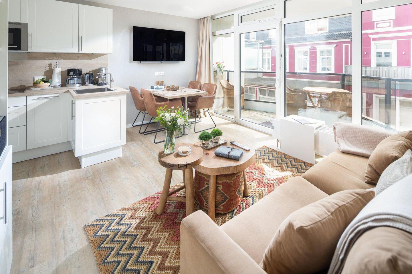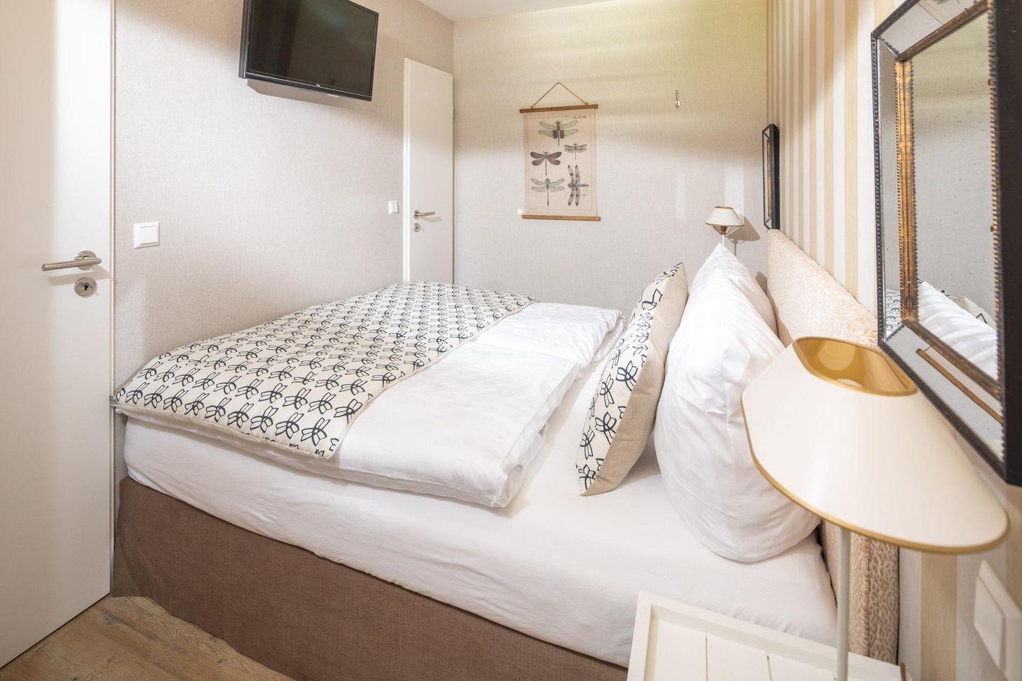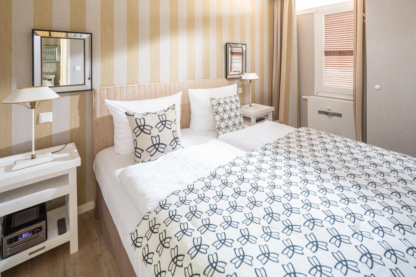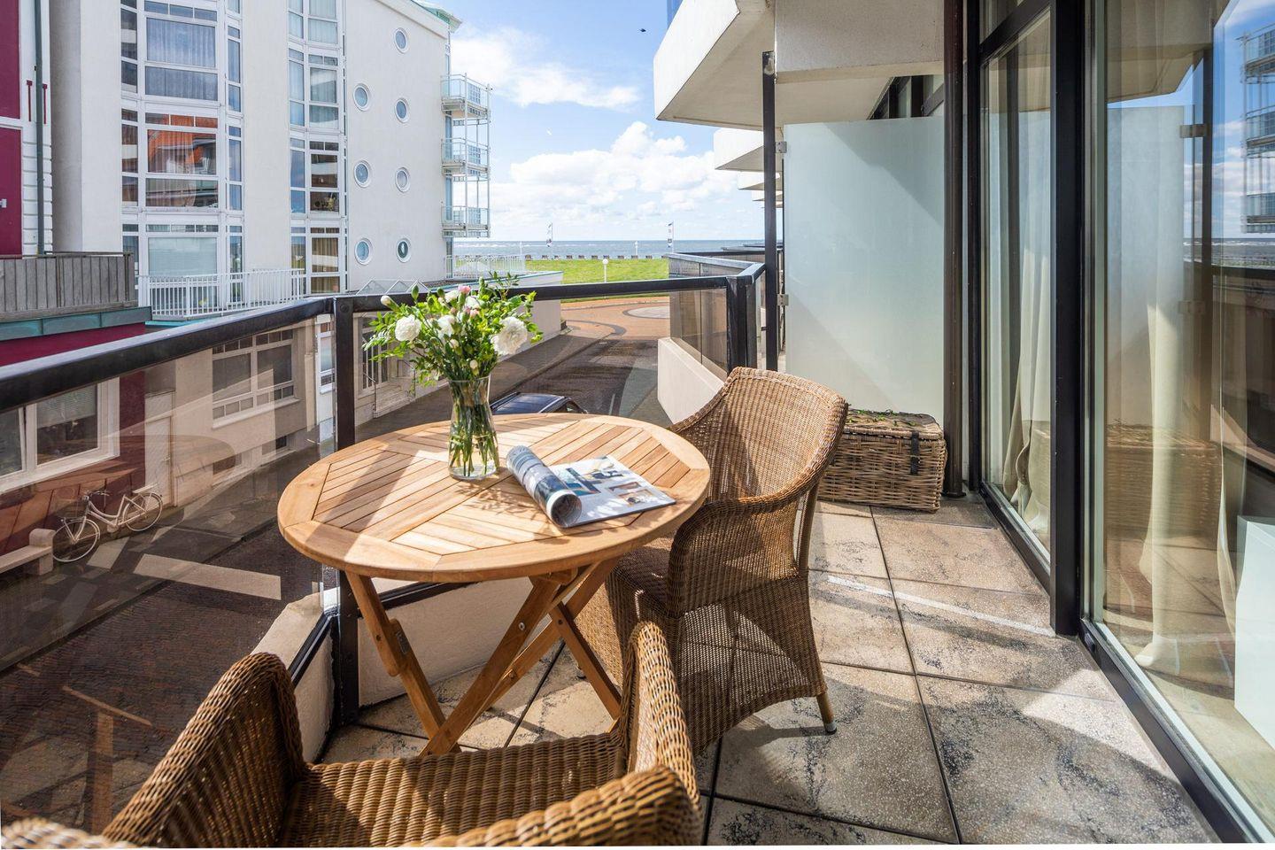 Die Wohnung präsentiert sich modern und hochwertig, da sie 2019 einer umfassenden Renovierung unterzogen wurde. Im kleinen Schlafzimmer erwartet Sie ein Boxspringbett mit einer Breite von 160 cm. Der West-Balkon der Ferienwohnung Europäischer Hof Whg. 41 bietet einen seitlichen Meerblick. Für die Aufbewahrung von Fahrrädern, Sportgeräten und anderen persönlichen Gegenständen steht den Bewohner des Hauses ein abschließbarer Kellerraum zur Verfügung.