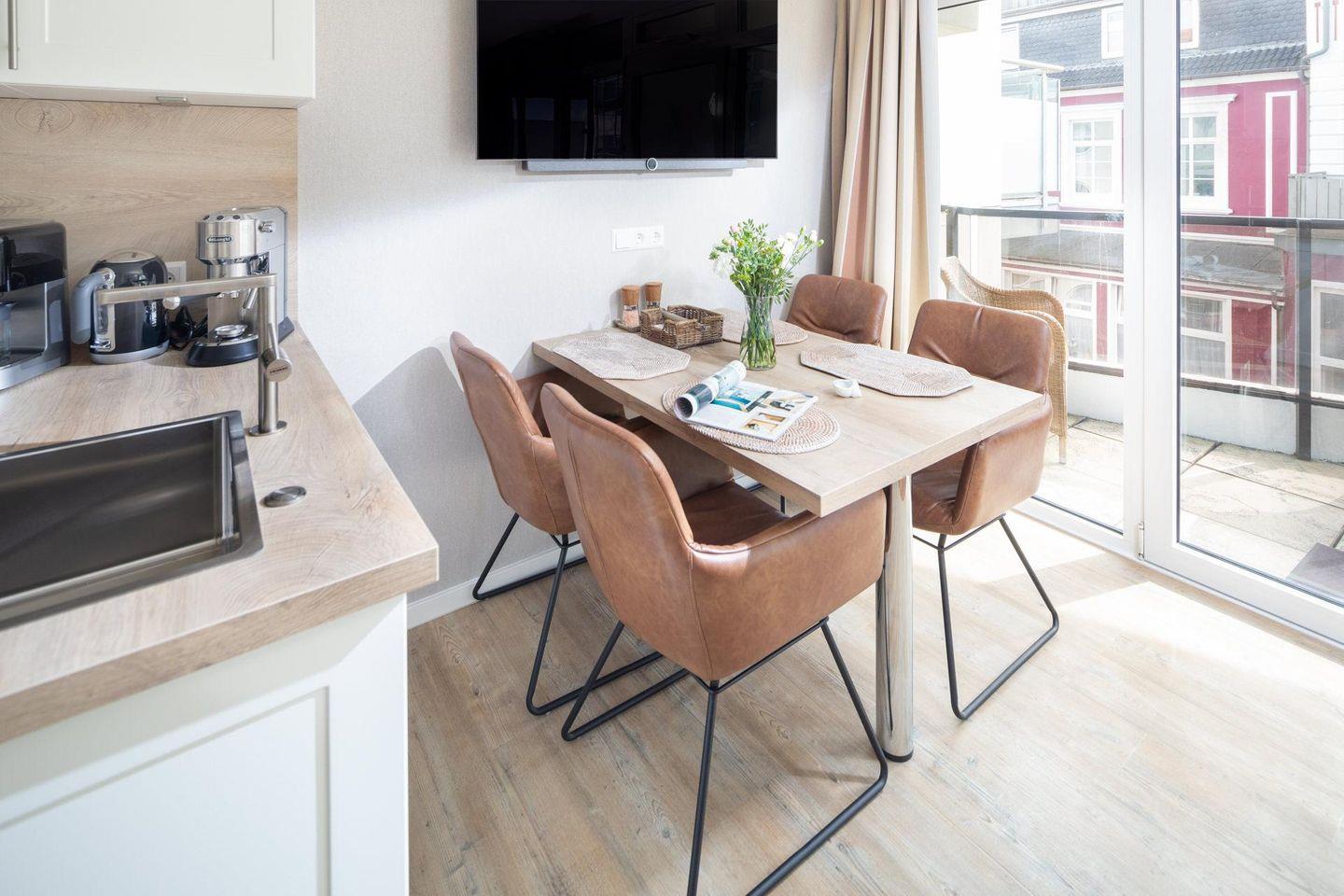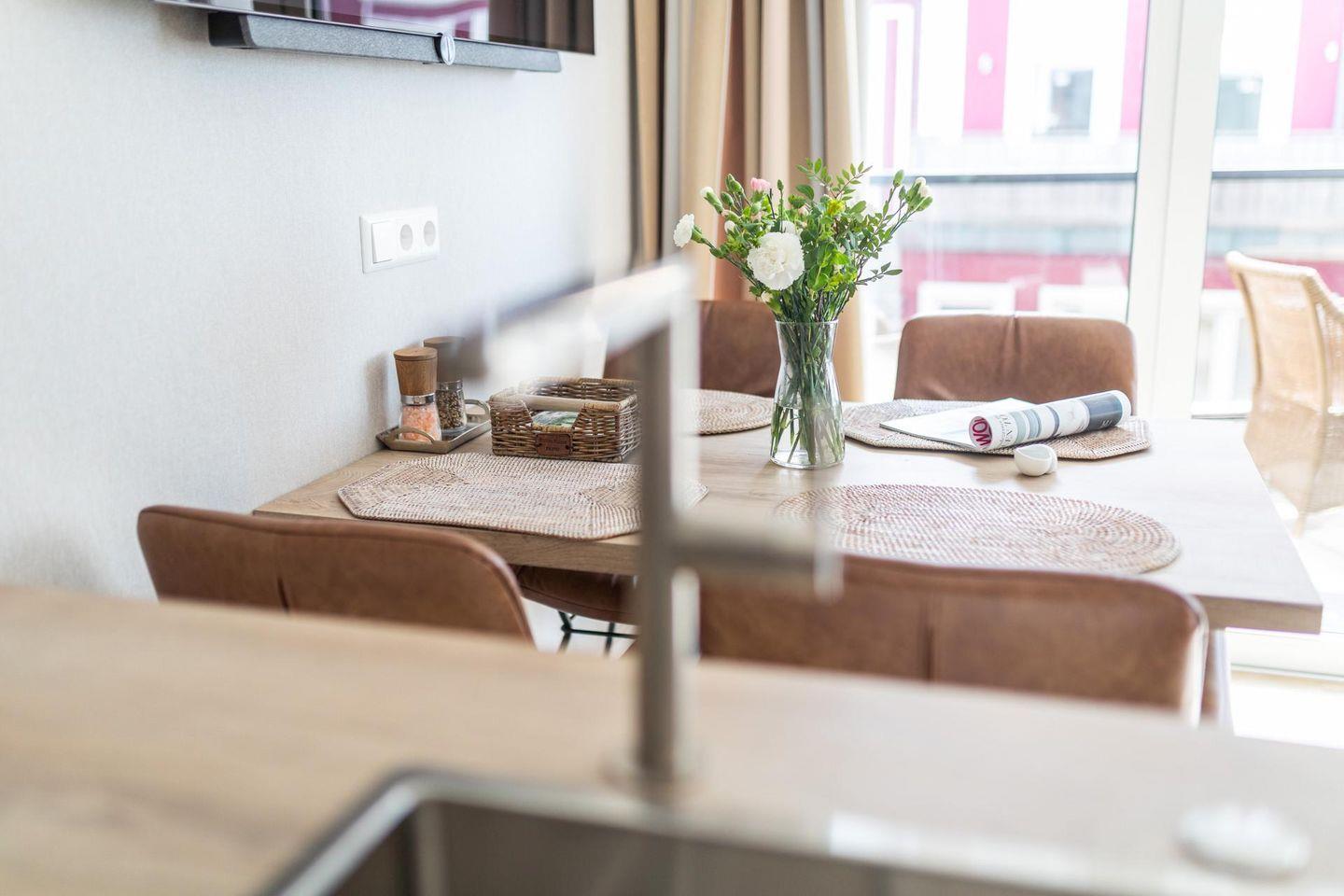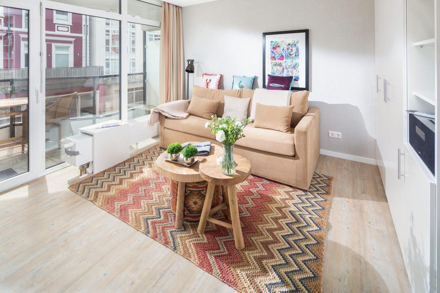 Die Wohnung präsentiert sich modern und hochwertig, da sie 2019 einer umfassenden Renovierung unterzogen wurde. Im kleinen Schlafzimmer erwartet Sie ein Boxspringbett mit einer Breite von 160 cm. Der West-Balkon der Ferienwohnung Europäischer Hof Whg. 41 bietet einen seitlichen Meerblick. Für die Aufbewahrung von Fahrrädern, Sportgeräten und anderen persönlichen Gegenständen steht den Bewohner des Hauses ein abschließbarer Kellerraum zur Verfügung.