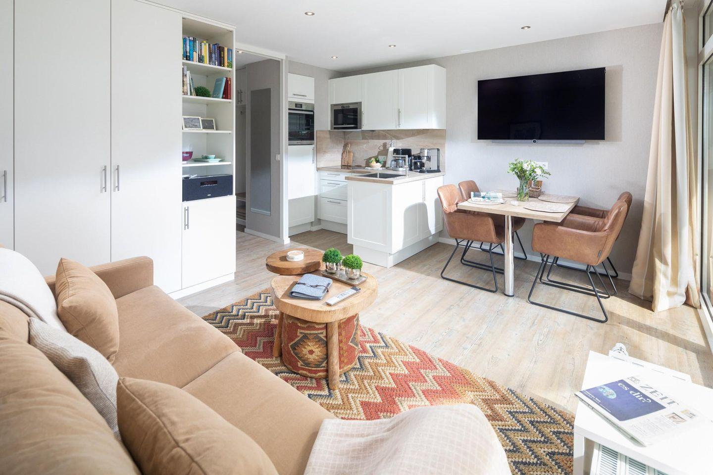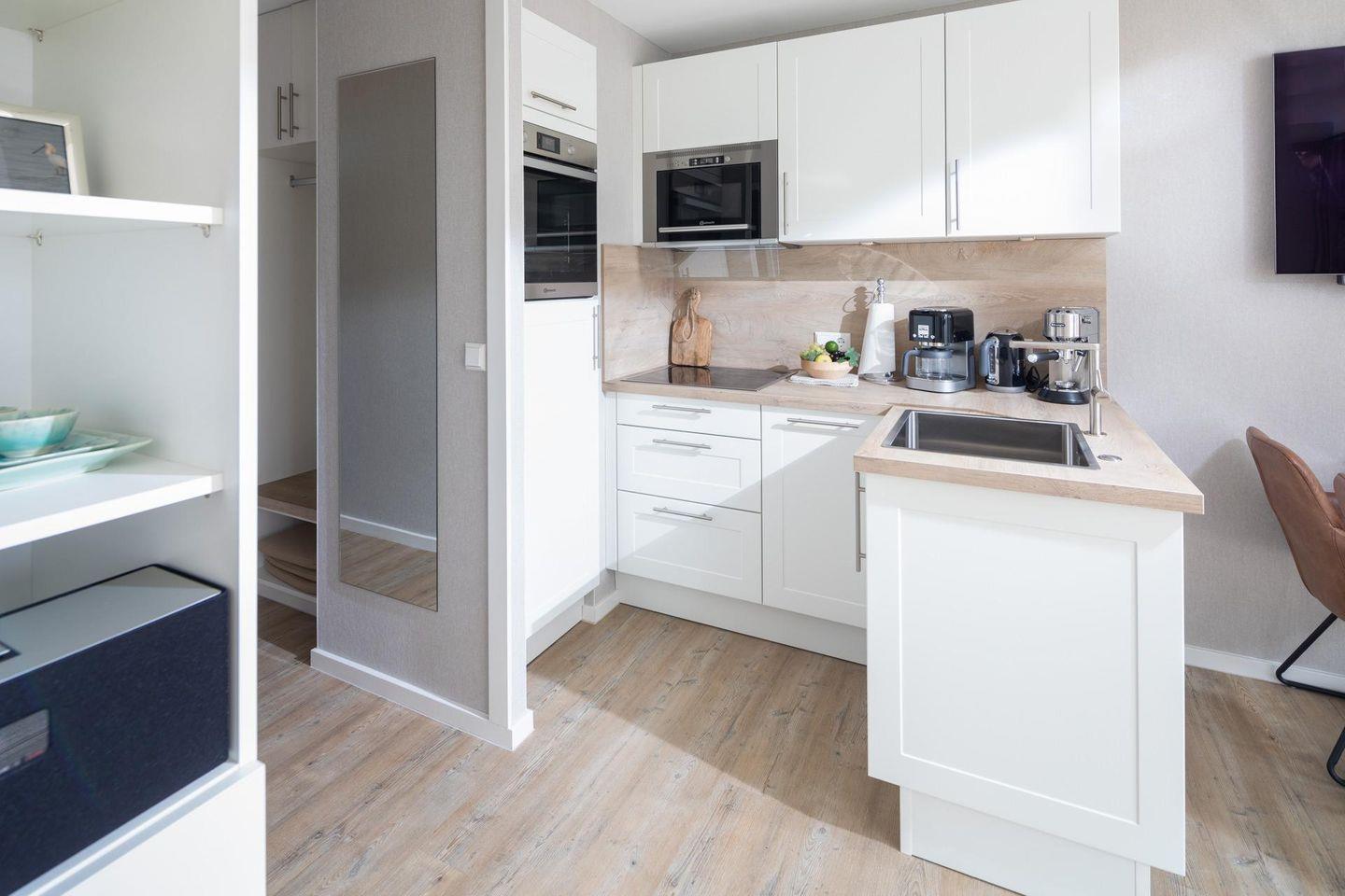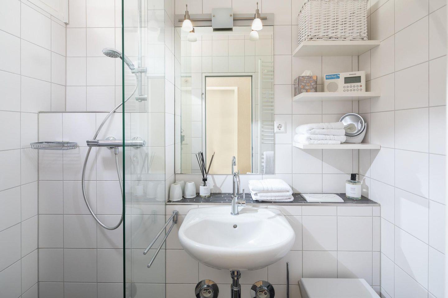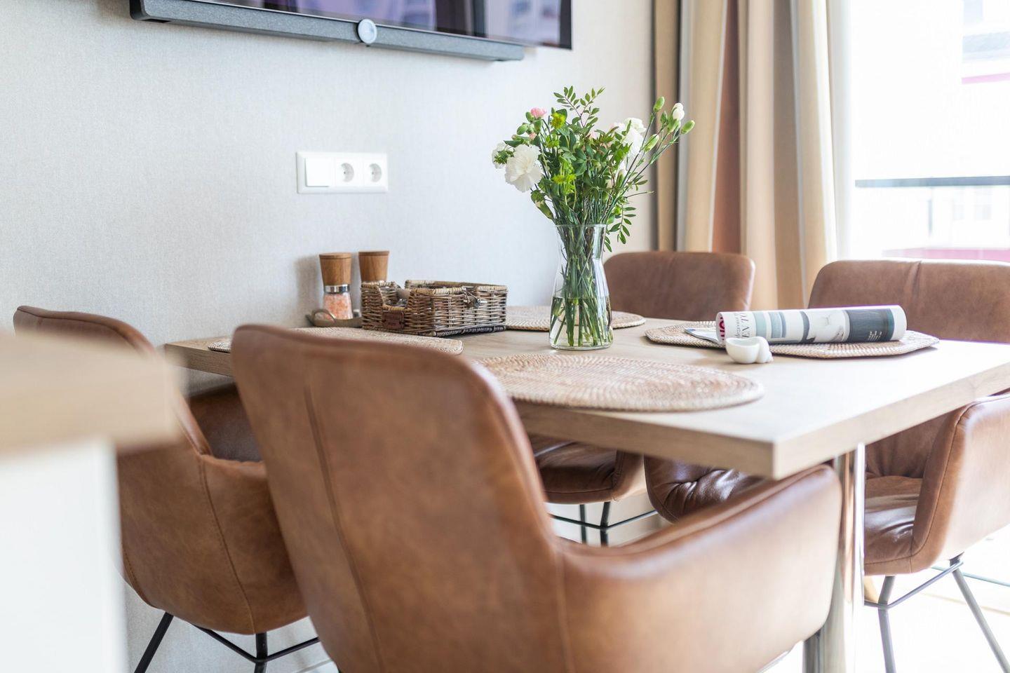 Die Wohnung präsentiert sich modern und hochwertig, da sie 2019 einer umfassenden Renovierung unterzogen wurde. Im kleinen Schlafzimmer erwartet Sie ein Boxspringbett mit einer Breite von 160 cm. Der West-Balkon der Ferienwohnung Europäischer Hof Whg. 41 bietet einen seitlichen Meerblick. Für die Aufbewahrung von Fahrrädern, Sportgeräten und anderen persönlichen Gegenständen steht den Bewohner des Hauses ein abschließbarer Kellerraum zur Verfügung.