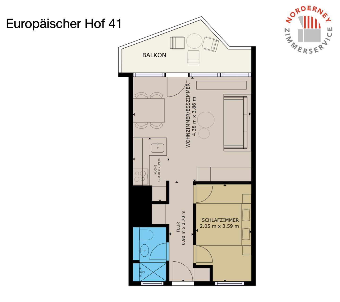 Die Ferienwohnung Nr. 41 im Europäischen Hof liegt in der Kaiserstrasse und bietet einen seitlichen Blick auf das Meer. Die Wohnung befindet sich im 1. Obergeschoss. Im Europäischen Hof gibt es einen Fahrstuhl. Der Strand ist ca. 50m entfernt. Durch diese Lage vereint die Wohnung die Nähe zum Strand und zum Inselkern.