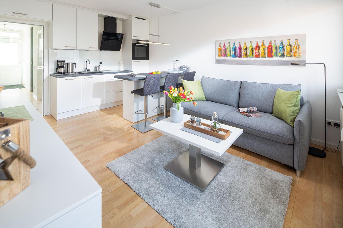 Bei der Einrichtung der Wohnung wurde Wert auf helle und natürliche Farben gelegt. Das Schlafzimmer ist mit einem Doppelbett ausgestattet und es wurde mit einem zusätzlichen Fernseher eingerichtet. Der Wohn- und Essbereich ist vollumfänglich ausgestattet. Die Wohnung verfügt über einen nach Osten ausgerichteten Balkon. Ein Highlight des Hauses "Iderhoff" ist der beheizte Swimming-Pool, der den Gästen zur Verfügung steht. Es wird jedoch darauf hingewiesen, dass die Nutzung des Schwimmbades den bekannten Hygienevorschriften unterliegt, und es können kurzfristige Änderungen auftreten. Eine Waschmaschine und ein Wäschetrockner stehen den Gästen im Haus zur gemeinschaftlichen Nutzung gegen Münzeinwurf zur Verfügung. Haustiere sind hier nicht erlaubt.