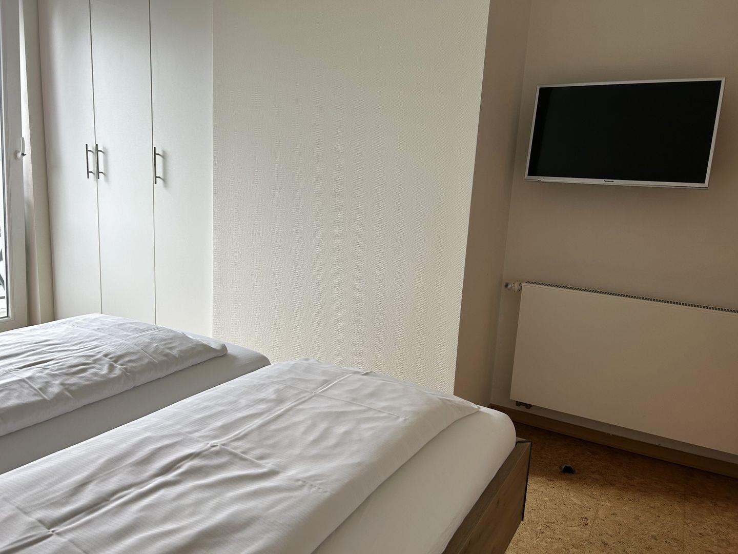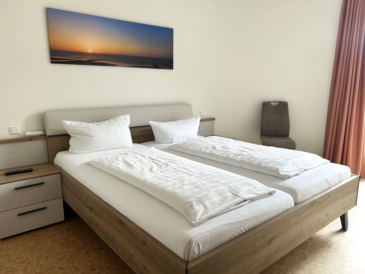 Das schöne Appartement in der 1. Etage verfügt über zwei separate Schlafzimmer mit je einem Doppelbett (TV), Gäste-WC, Wohn-Schlafraum (Schlafsofa) mit Küchenzeile (4-Plattenherd, Spülmaschine, Backofen), Essecke, Diele, Dusche/WC, Kabel-TV und Telefon. Beide Schlafzimmer haben einen Zugang zum Balkon Richtung Hof.