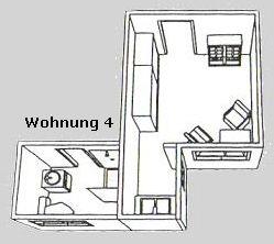 Das Single-Appartement in der 1. Etage verfügt über einen Wohn-Schlafraum (Schrankbett 140*200) mit Pantry-Küche und Kabel-TV (kein Telefon). Dusche/WC befindet sich außerhalb des Appartements auf halber Treppe, ist jedoch zur alleinigen Nutzung. NICHTRAUCHERWOHNUNG!!!