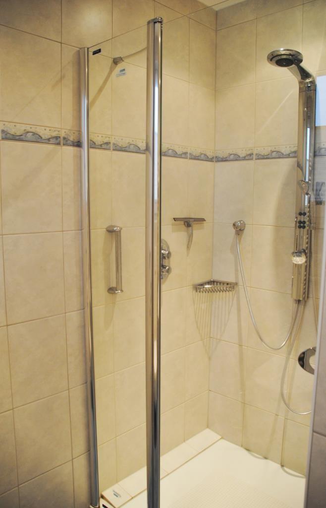 Erholsame Nächte bieten die beiden Schlafzimmer mit je einem Boxspringdoppelbett, welche komplett verdunkelbar sind. An eines der Schlafzimmer grenzt ein eigenes Bad mit Eckbadewanne, Dusche, Fön und WC. Ein weiteres Badezimmer mit ebenerdiger Dusche, Fön und WC ist ebenso vorhanden und von der Diele aus zu betreten. Die Duschen sind ebenerdig.