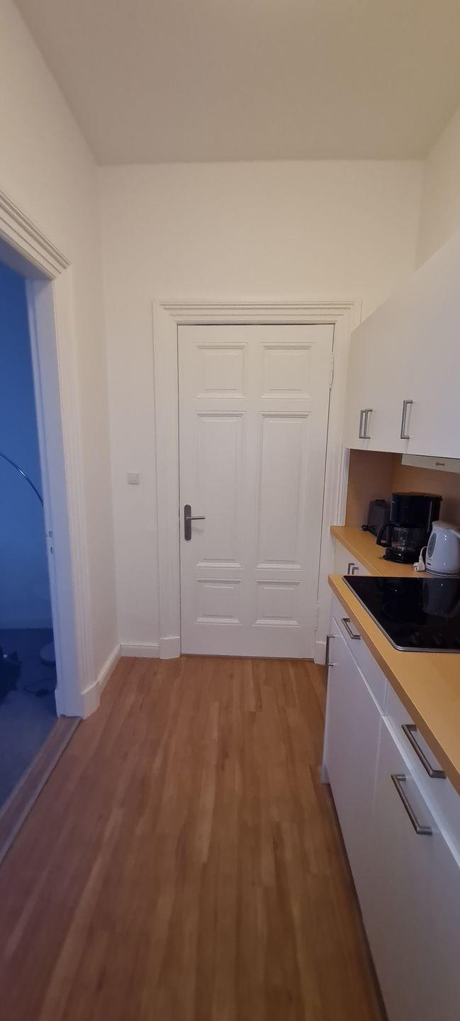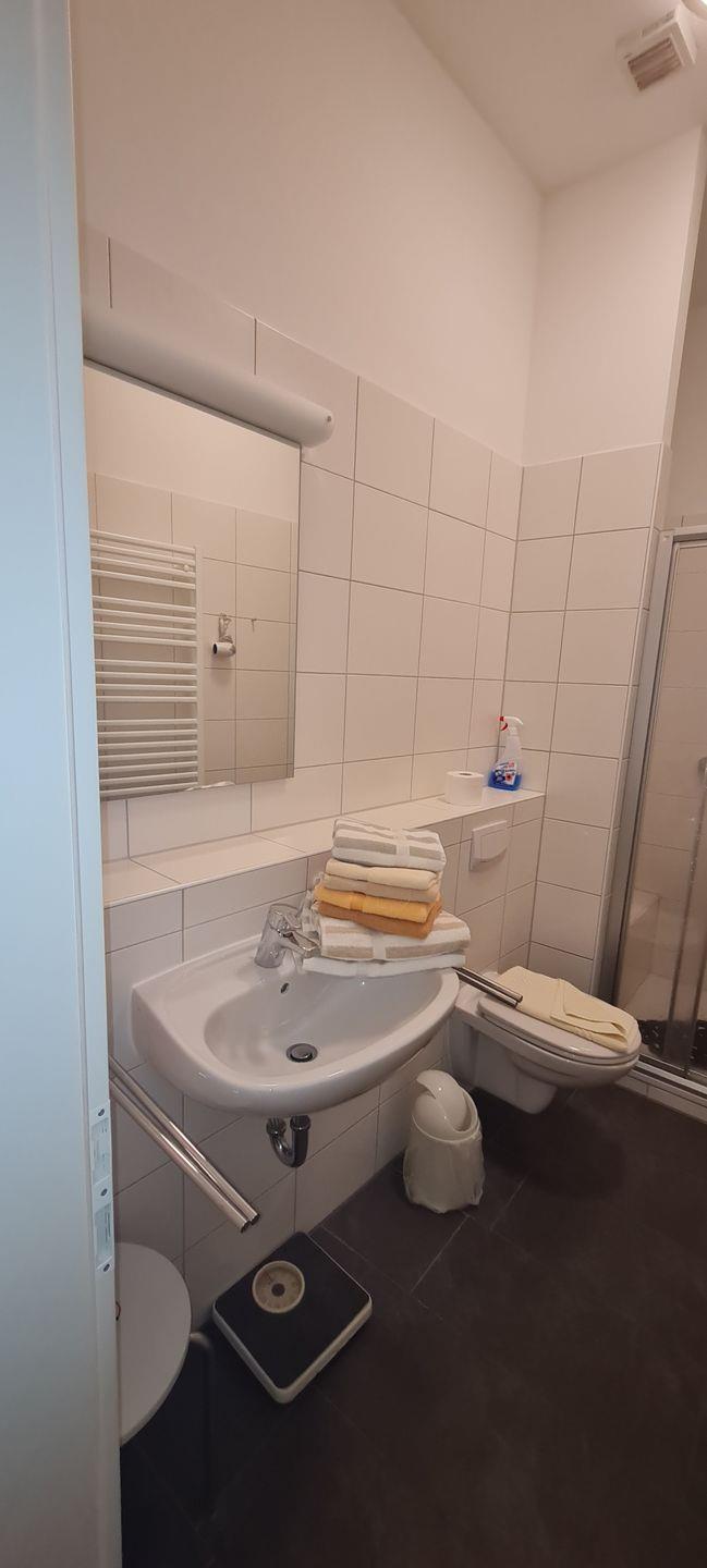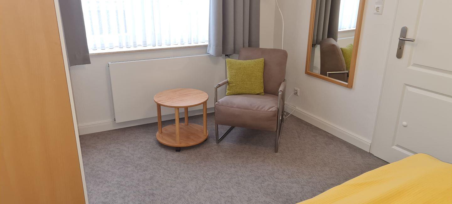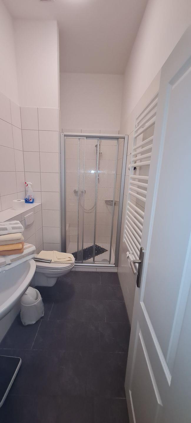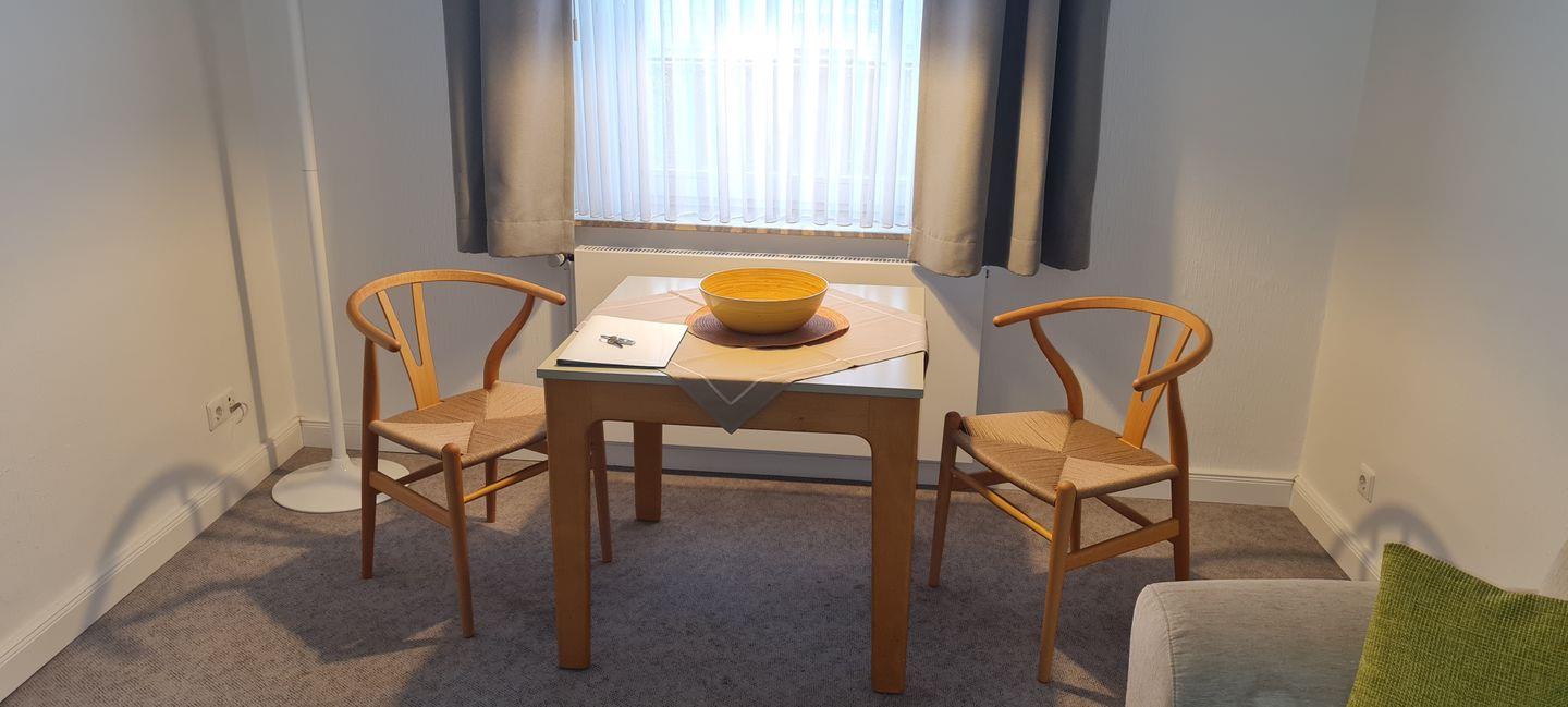 Das 2-Raum-Appartement in der 1. Etage verfügt über ein Wohnzimmer (TV) mit Essecke, einer Küchenzeile (Spülmaschine, 4-Platten-Ceranfeld). Ein Schlafzimmer mit Doppelbett und Dusche/WC sind vorhanden. Ein Parkplatz kann bei Verfügbarkeit für 2,50 € pro Tag hinzugemietet werden. WLAN vorhanden.