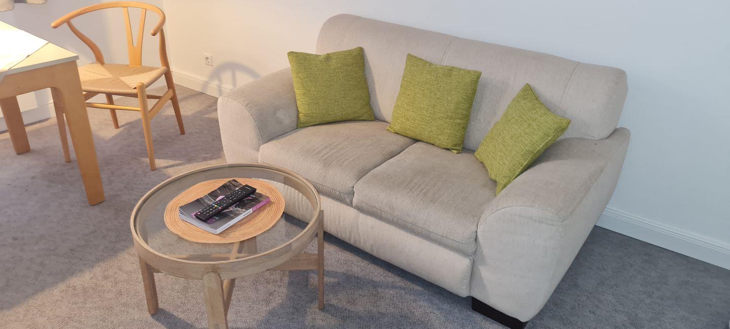 Das 2-Raum-Appartement in der 1. Etage verfügt über ein Wohnzimmer (TV) mit Essecke, einer Küchenzeile (Spülmaschine, 4-Platten-Ceranfeld). Ein Schlafzimmer mit Doppelbett und Dusche/WC sind vorhanden. Ein Parkplatz kann bei Verfügbarkeit für 2,50 € pro Tag hinzugemietet werden. WLAN.