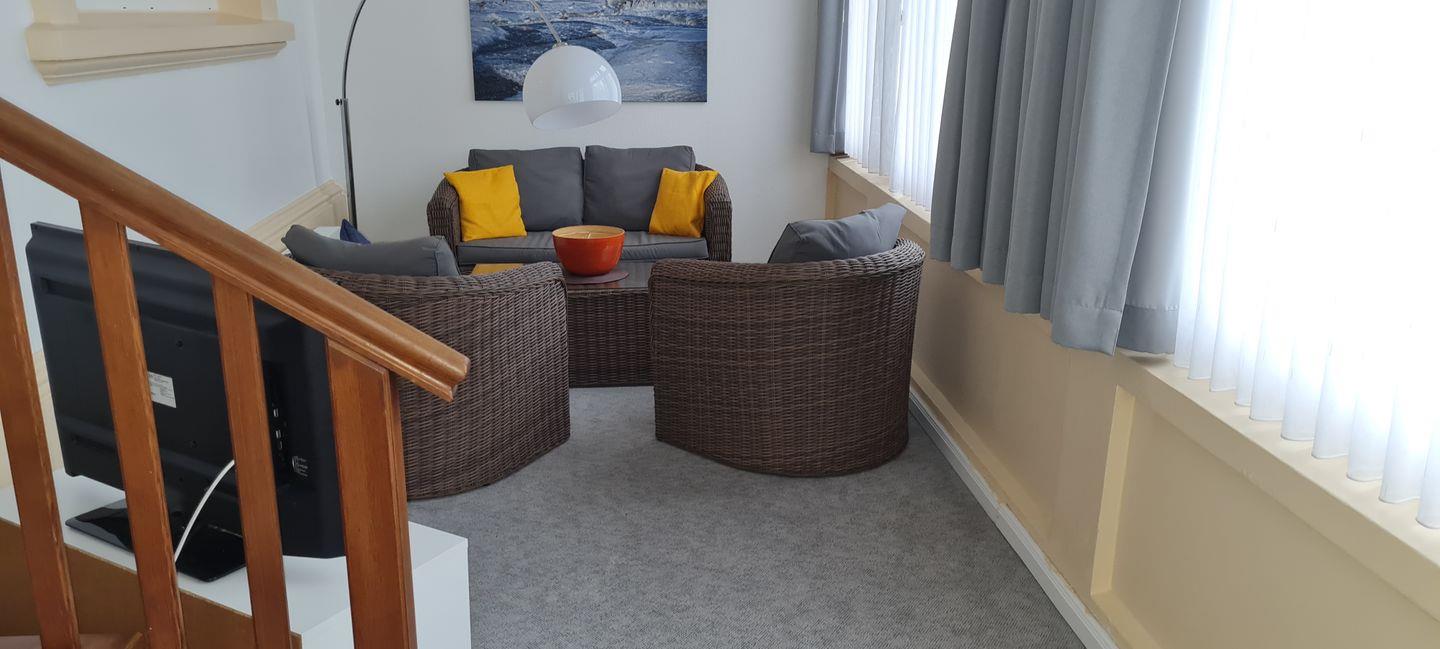 Das 3-Raum-Appartement im Hochparterre verfügt über einen Wohn- und Essbereich in der Veranda, eine Kochküche sowie zwei Schlafzimmer. Eines der Schlafzimmer bietet ein Doppelschrankbett und ist direkt der erste Raum, den man in der Wohnung betritt (es gibt keinen Flur/Diele). Von ihm gehen auch das Badezimmer und die kleine Küche ab. Von der Küche aus hat man Zugang zum zweiten Schlafzimmer mit zwei Einzelbetten und zu der Veranda (Stufen), in der sich Wohn- und Essbereich befinden.