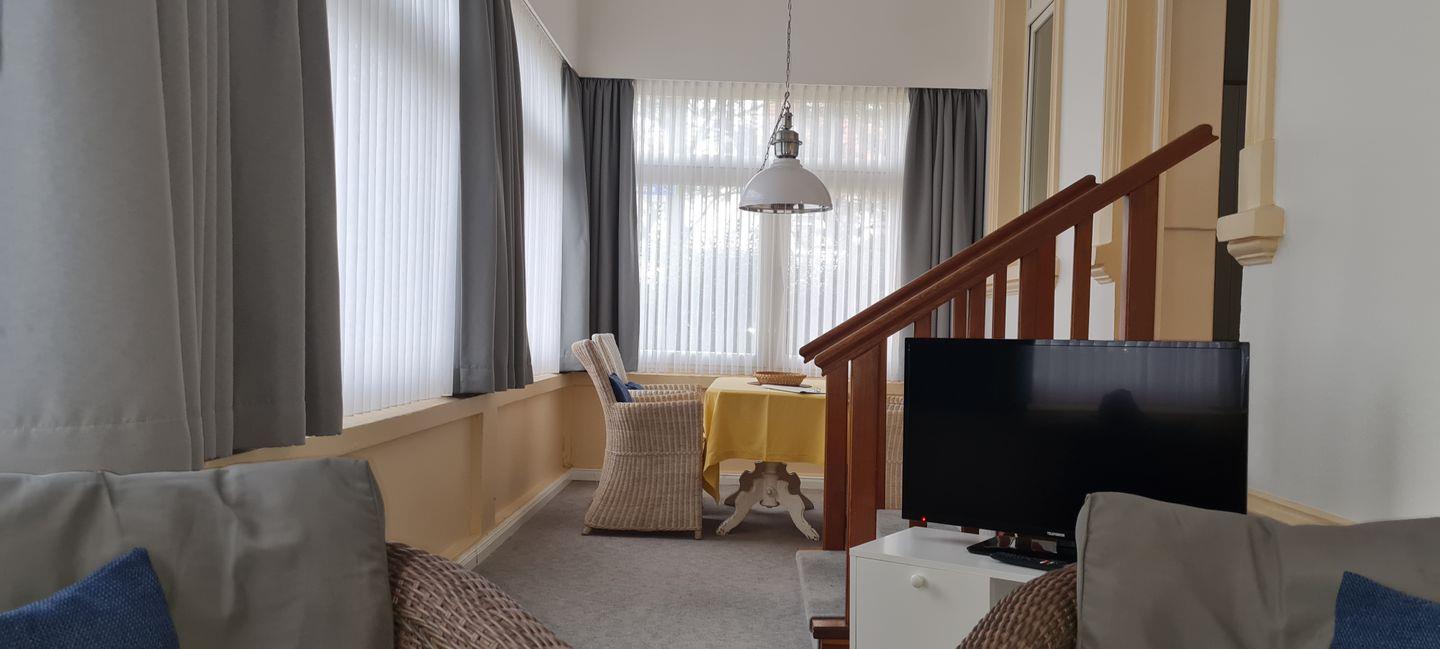Das 3-Raum-Appartement im Hochparterre verfügt über einen Wohn- und Essbereich in der Veranda, eine Kochküche sowie zwei Schlafzimmer. Eines der Schlafzimmer bietet ein Doppelschrankbett und ist direkt der erste Raum, den man in der