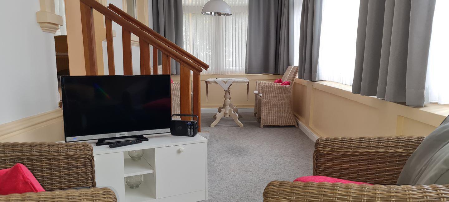 Das 3-Raum-Appartement im Hochparterre verfügt über einen Wohn- und Essbereich in der Veranda, eine Kochküche sowie zwei Schlafzimmer. Eines der Schlafzimmer bietet ein Doppelschrankbett und ist direkt der erste Raum, den man in der Wohnung betritt (es gibt keinen Flur/Diele). Von ihm geht auch das Badezimmer und die kleine Küche ab. Von der Küche aus hat man Zugang zum zweiten Schlafzimmer mit zwei Einzelbetten und zu der Veranda (Stufen), in der sich Wohn- und Essbereich befinden.