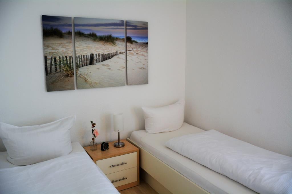 Die renovierte 2-Raum-Ferienwohnung befindet sich im 1. Obergeschoss und besteht aus einem Schlafzimmer mit zwei Einzelbetten, einem Wohnraum (TV)mit Zugang zum Balkon, einer kleinen Küchenzeile (ausgestattet mit 2-Platten-Herd, Mikrowelle und kleinem Gefrierfach), Diele und Duschbad mit separatem WC (erneuert 2017). Es handelt sich um eine Nichtraucher-Wohnung.