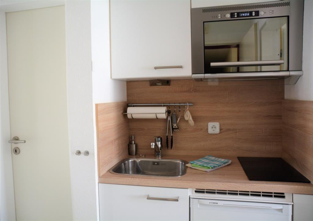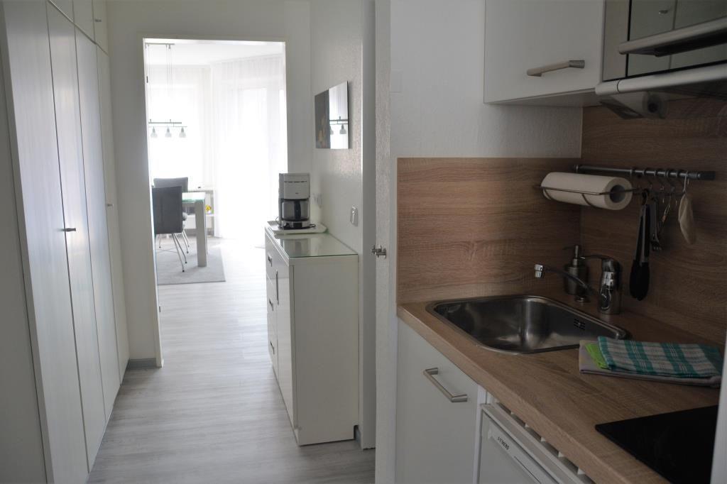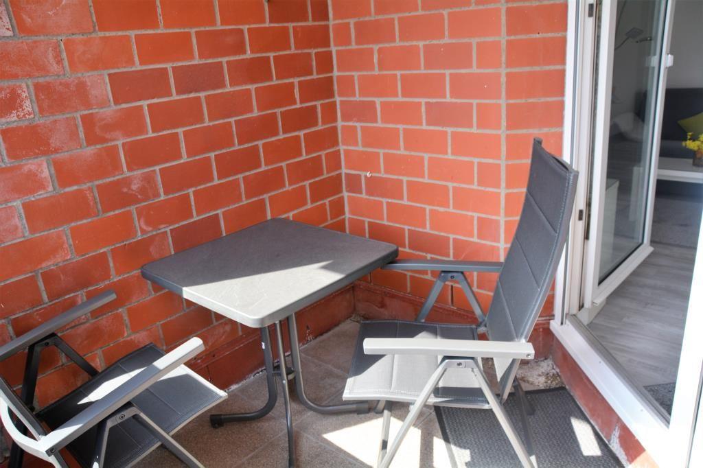Die renovierte 2-Raum-Ferienwohnung befindet sich im 1. Obergeschoss und besteht aus einem Schlafzimmer mit zwei Einzelbetten, einem Wohnraum (TV) mit Zugang zum Balkon, einer kleinen Küchenzeile (ausgestattet mit 2-Platten-Herd, Mikrowelle und kleinem Gefrierfach), Diele und Duschbad mit separatem WC (erneuert 2017). Es handelt sich um eine Nichtraucher-Wohnung.