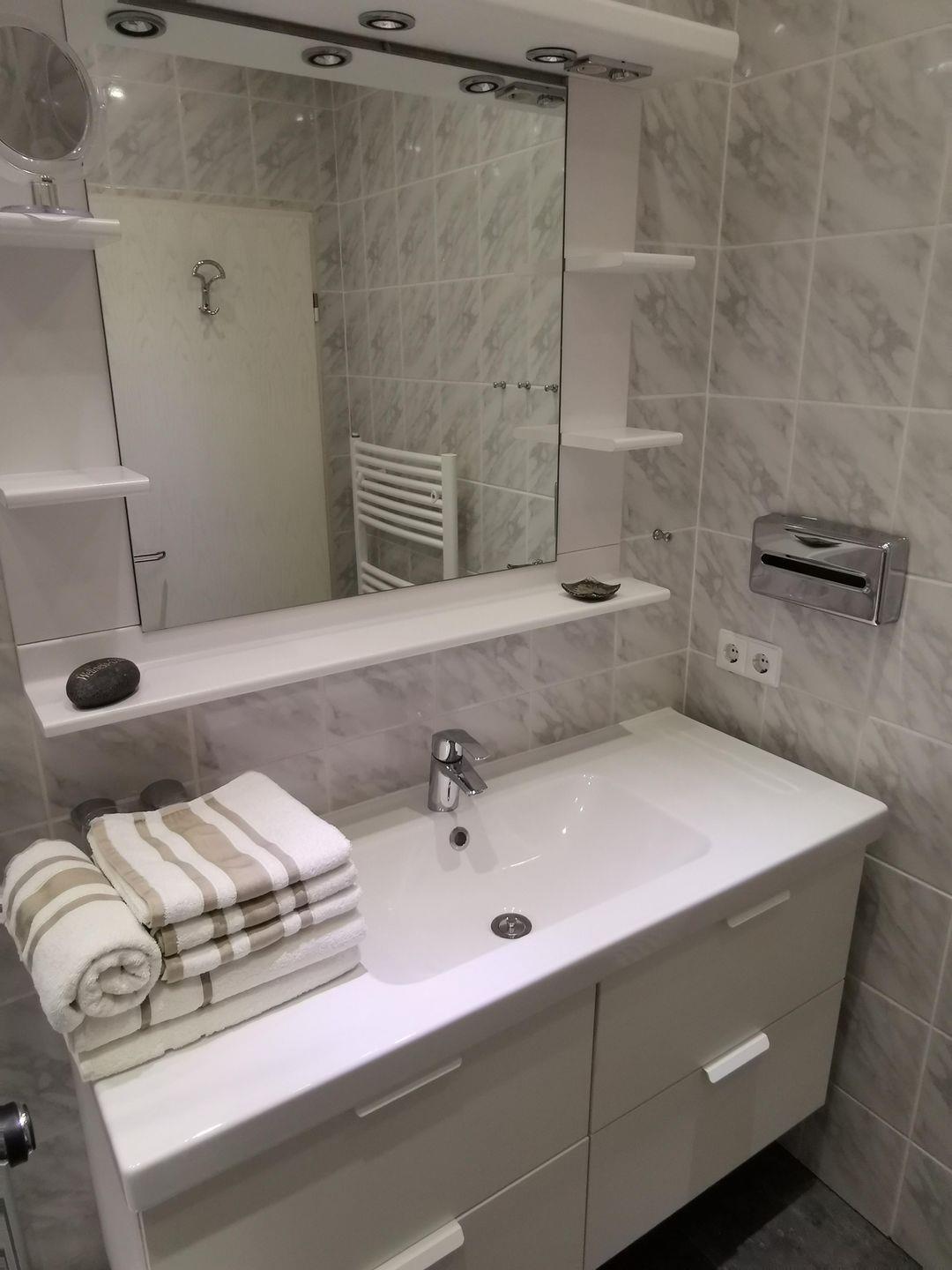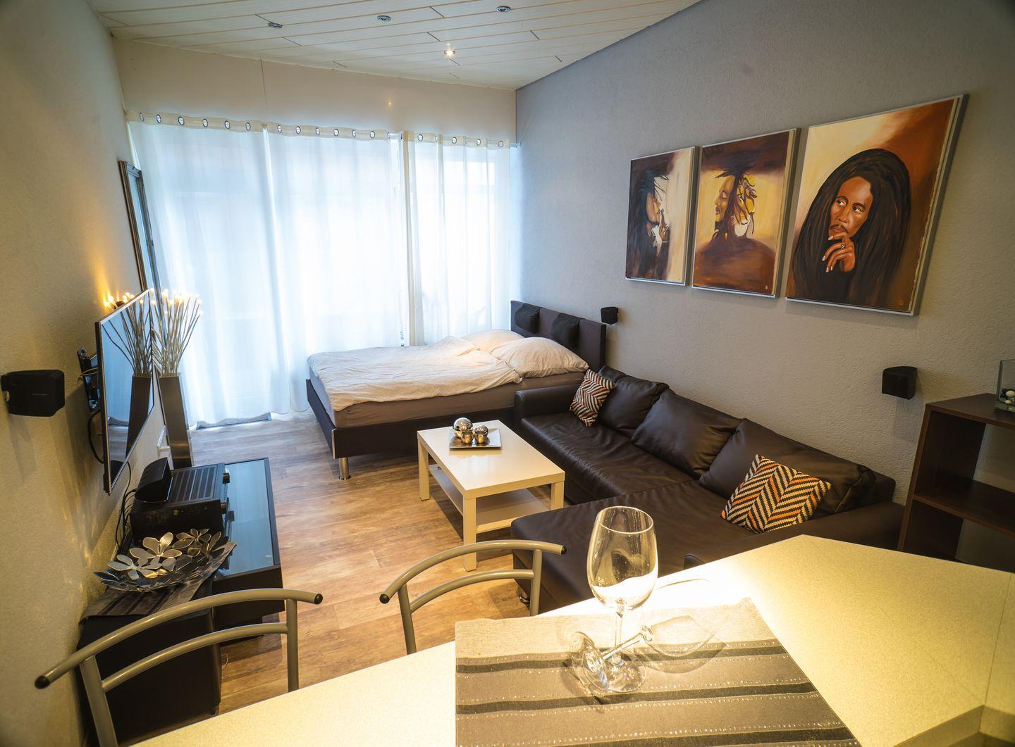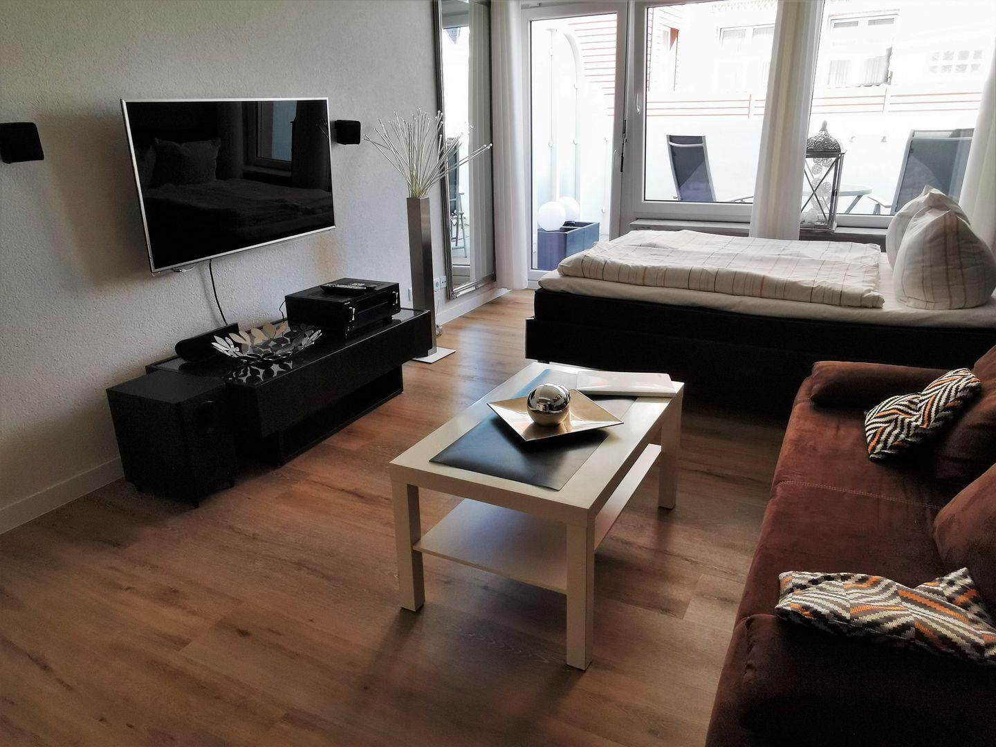 Das moderne 1-Raum Appartement im Erdgeschoss verfügt über einen Wohn-/Schlafraum (TV) mit Doppelbett (140x200cm). Der Raum verfügt zudem über eine Küchenzeile (4-Plattenherd, Kaffeemaschine, Spülmaschine) mit integriertem Esstisch. Das Bad besteht aus Dusche/WC. Eine Terrasse sowie kostenfreie Schwimmbadnutzung sind gegeben! Münzsauna im Haus. Eingang Damenpfad.