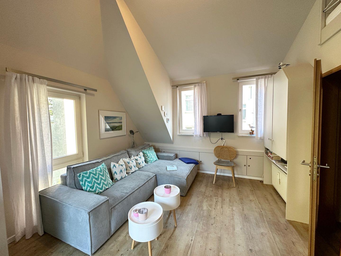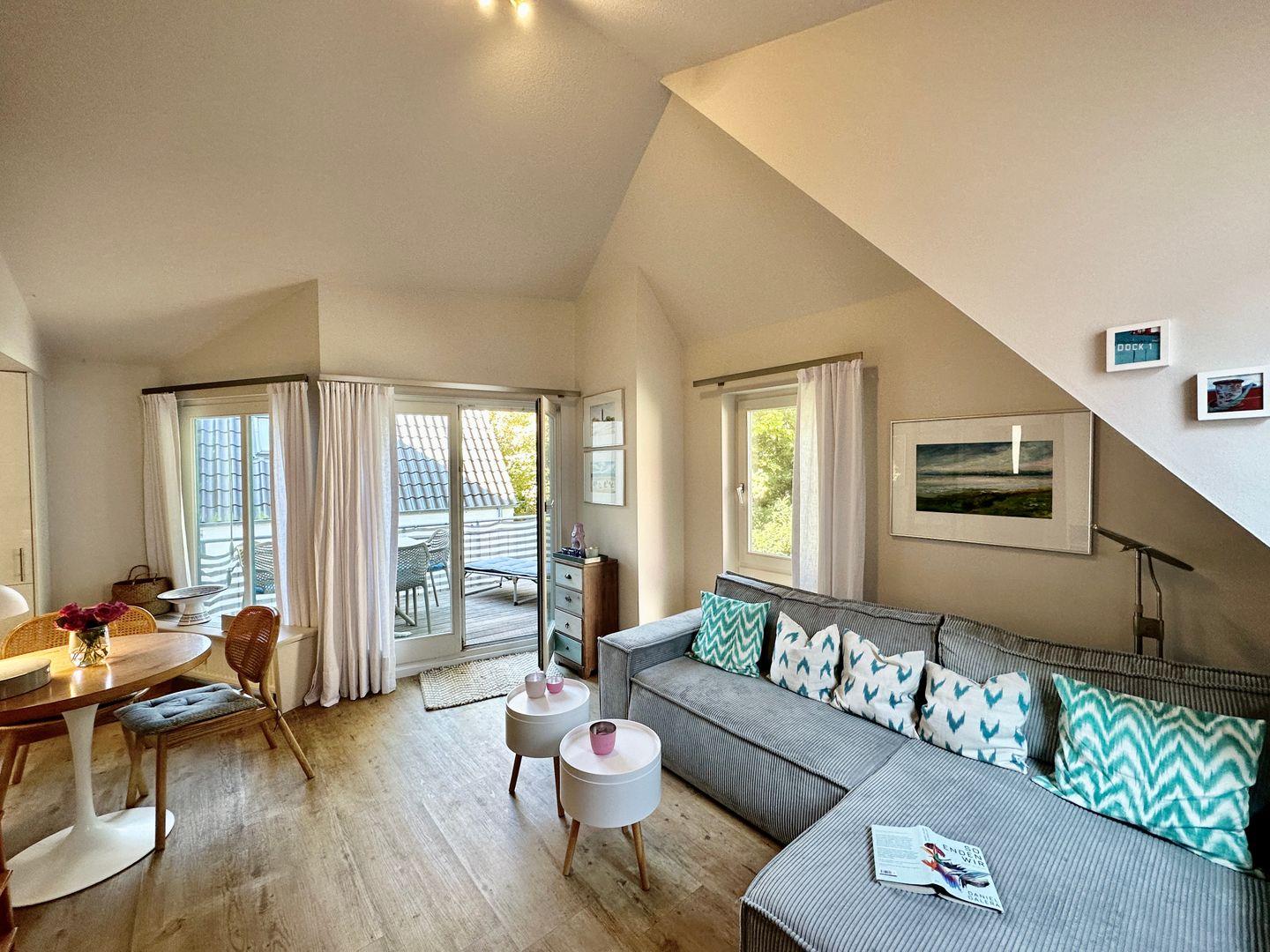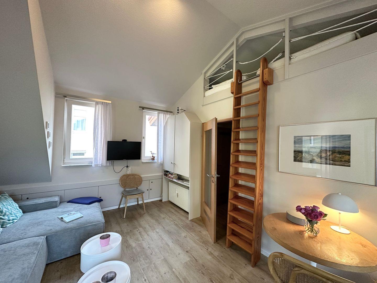 Die Wohnung befindet sich im ersten Obergeschoss und besteht aus einem Wohnraum mit integrierter Küche (Backofen, Spülmaschine, 4-Platten-Herd), einem separaten Schlafraum, Duschbad mit WC und Balkon. Vom Wohnzimmer haben Sie mittels Leiter Zugang zum ausgebauten Spitzboden (offen) mit zwei weiteren Schlafplätzen à 1,20m x 2,00m. Nichtraucherwohnung. WLAN.