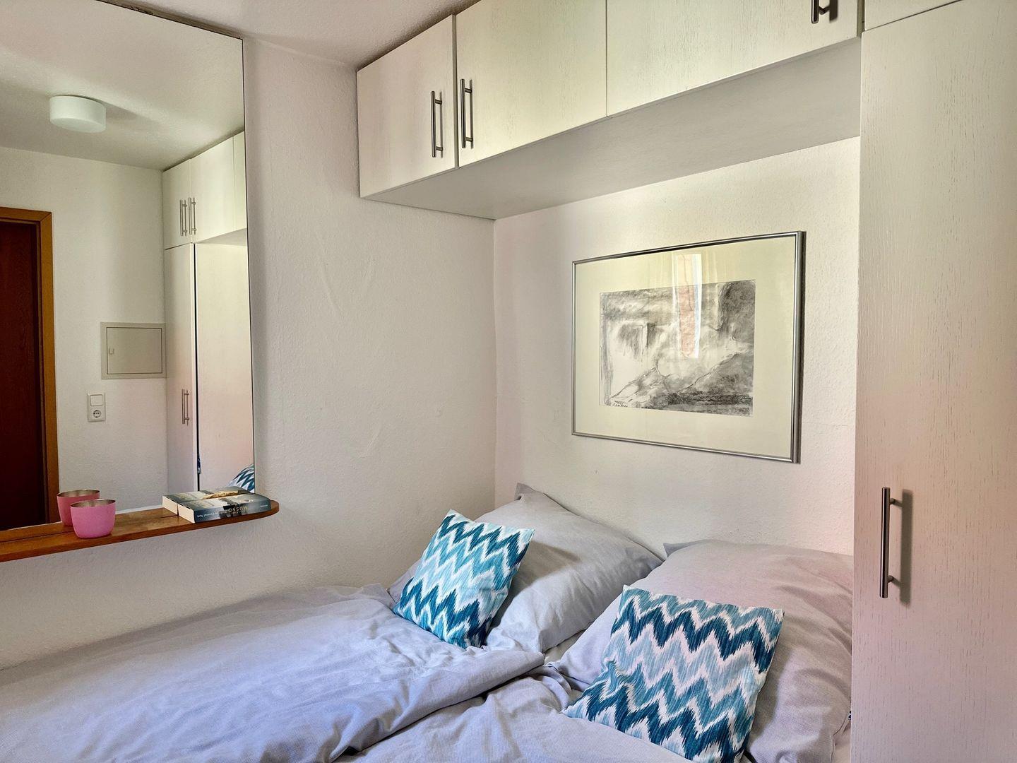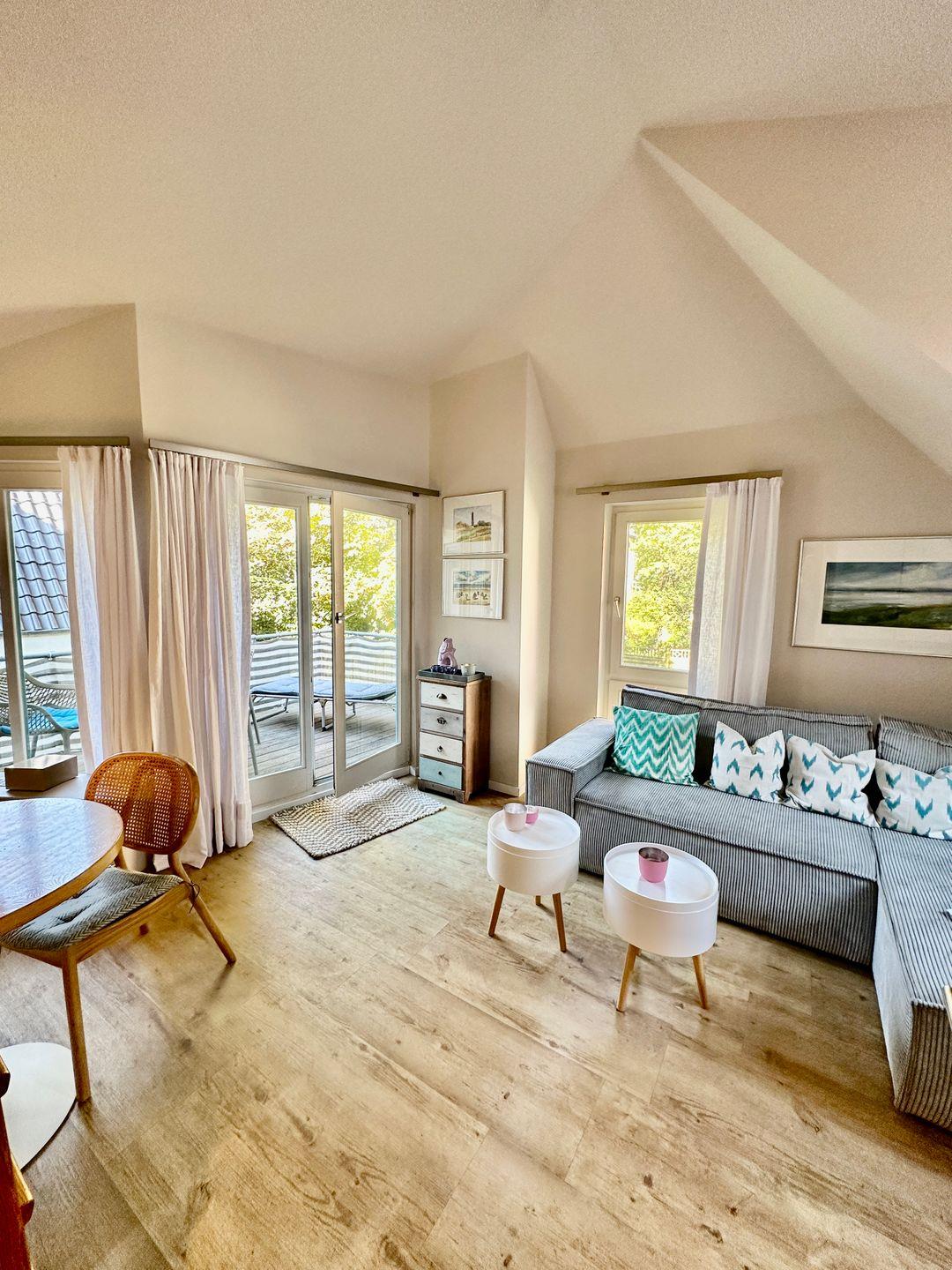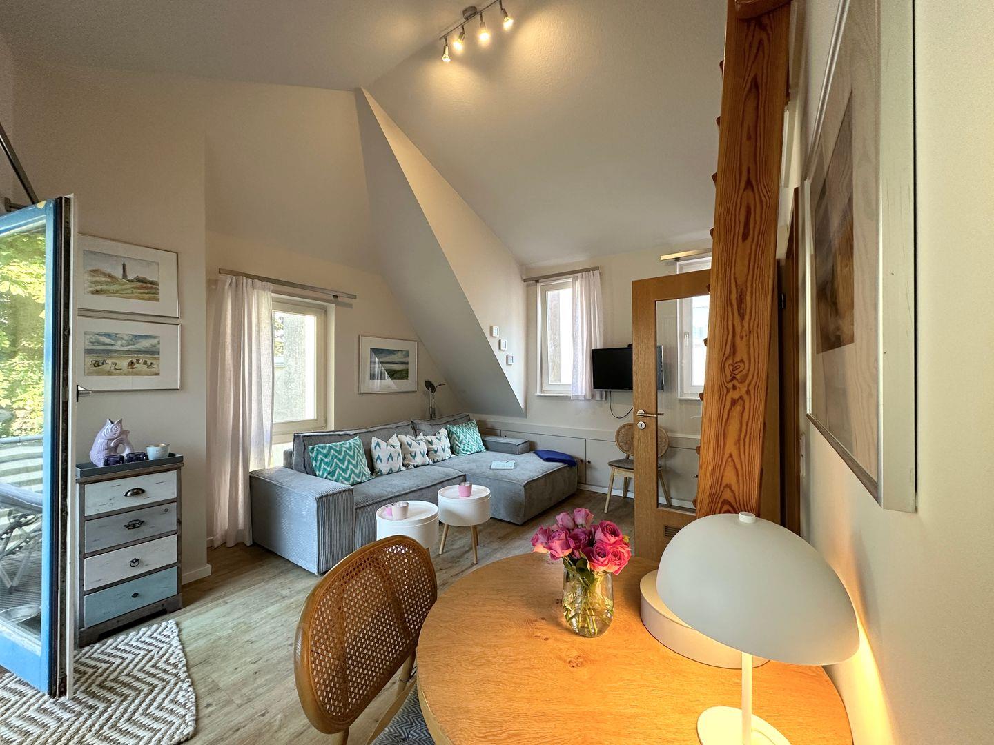 Die Wohnung befindet sich im ersten Obergeschoss und besteht aus einem Wohnraum mit integrierter Küche (Backofen, Spülmaschine, 4-Platten-Herd), einem separaten Schlafraum, Duschbad mit WC und Balkon. Vom Wohnzimmer haben Sie mittels Leiter Zugang zum ausgebauten Spitzboden (offen) mit zwei weiteren Schlafplätzen à 1,20m x 2,00m. Nichtraucherwohnung. WLAN.