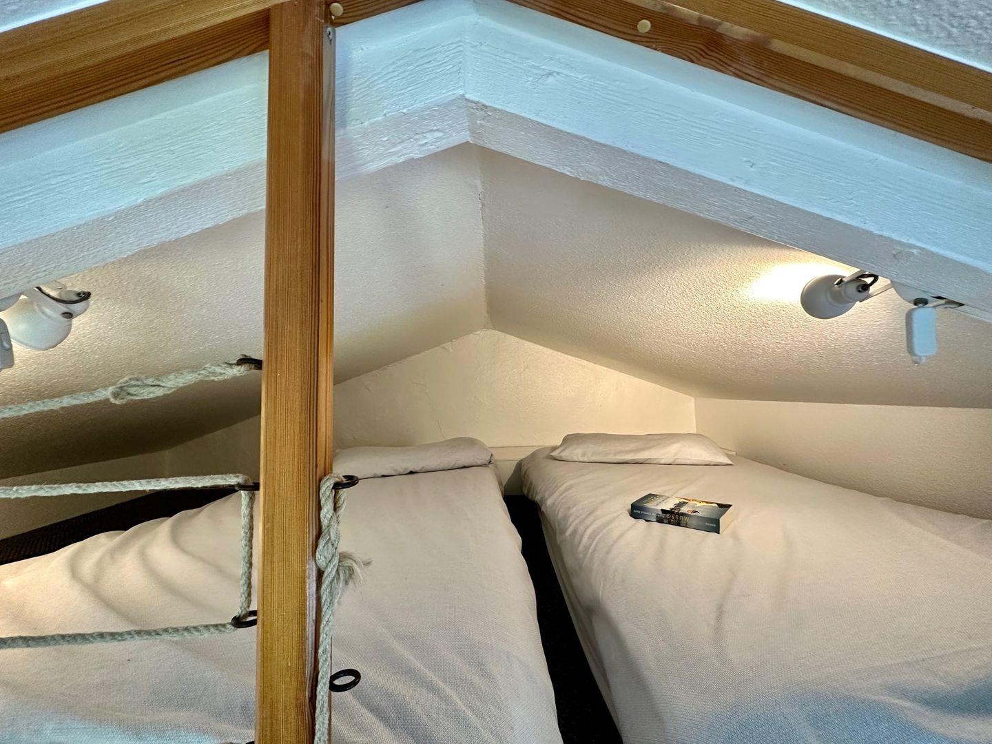 Im separaten Schlafraum ist ein Doppelbett mit 2 Schlafmöglichkeiten vorhanden. Der Spitzboden (Galerie) bietet 2 weitere Schlafplätze (1,20 m x 2,00 m) und ist über eine Leiter zu erreichen. Haustiere erlaubt.