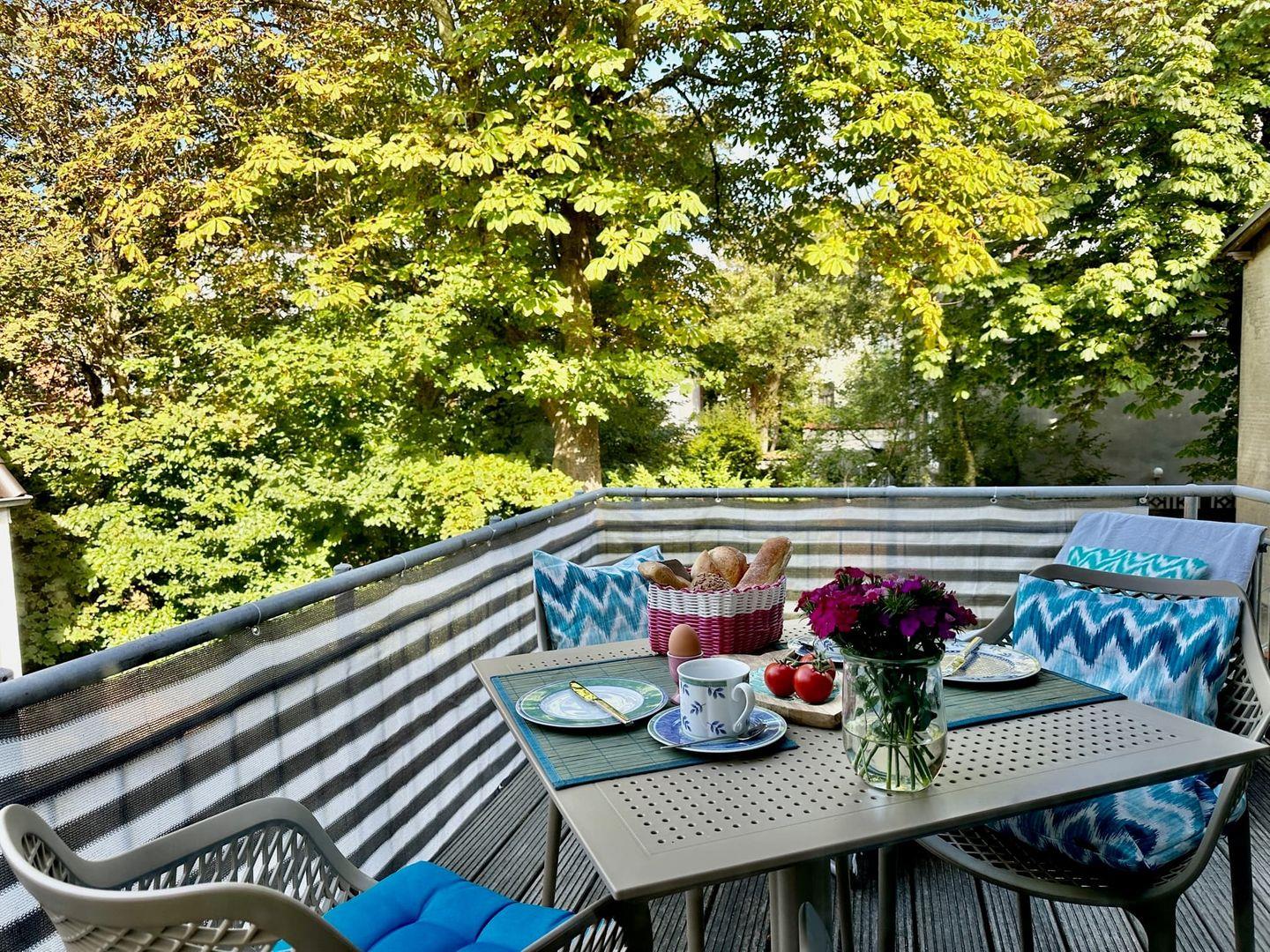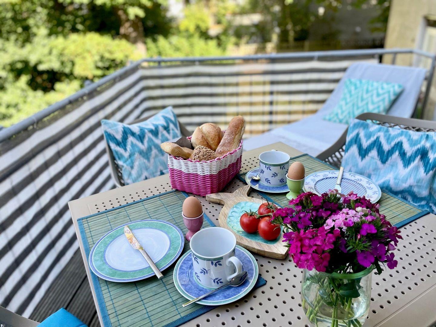 Die Wohnung befindet sich im 1. Obergeschoss mit Blick in eine Gartenlandschaft. Das Morgenfrühstück und der Nachmittagstee können auf dem