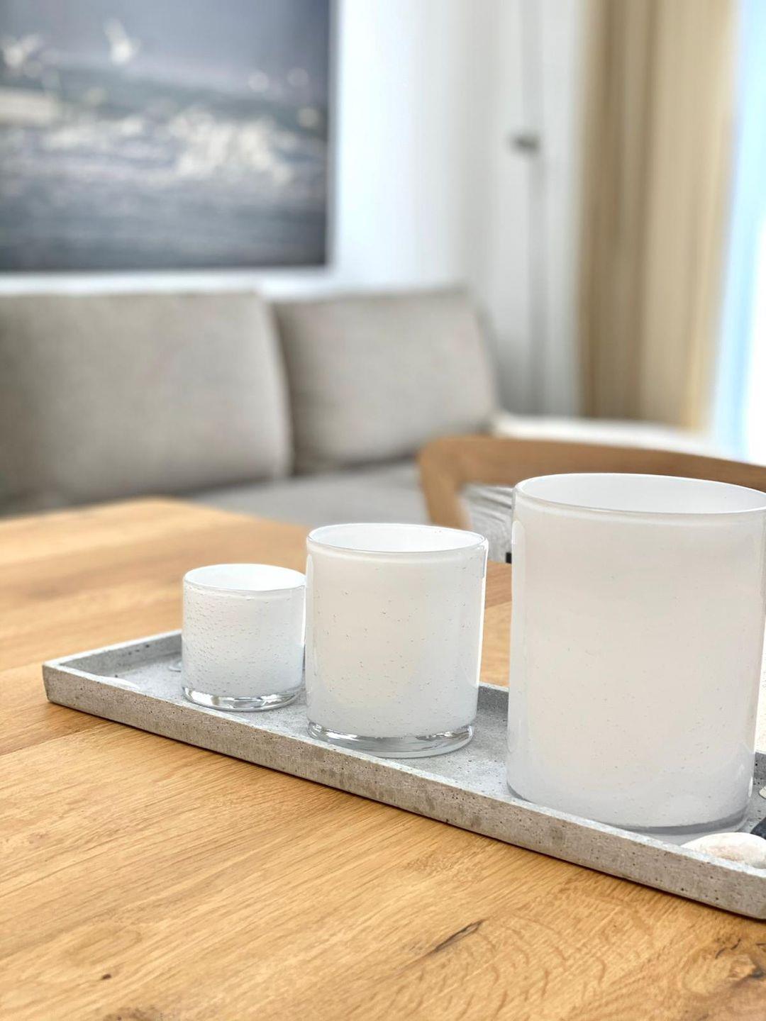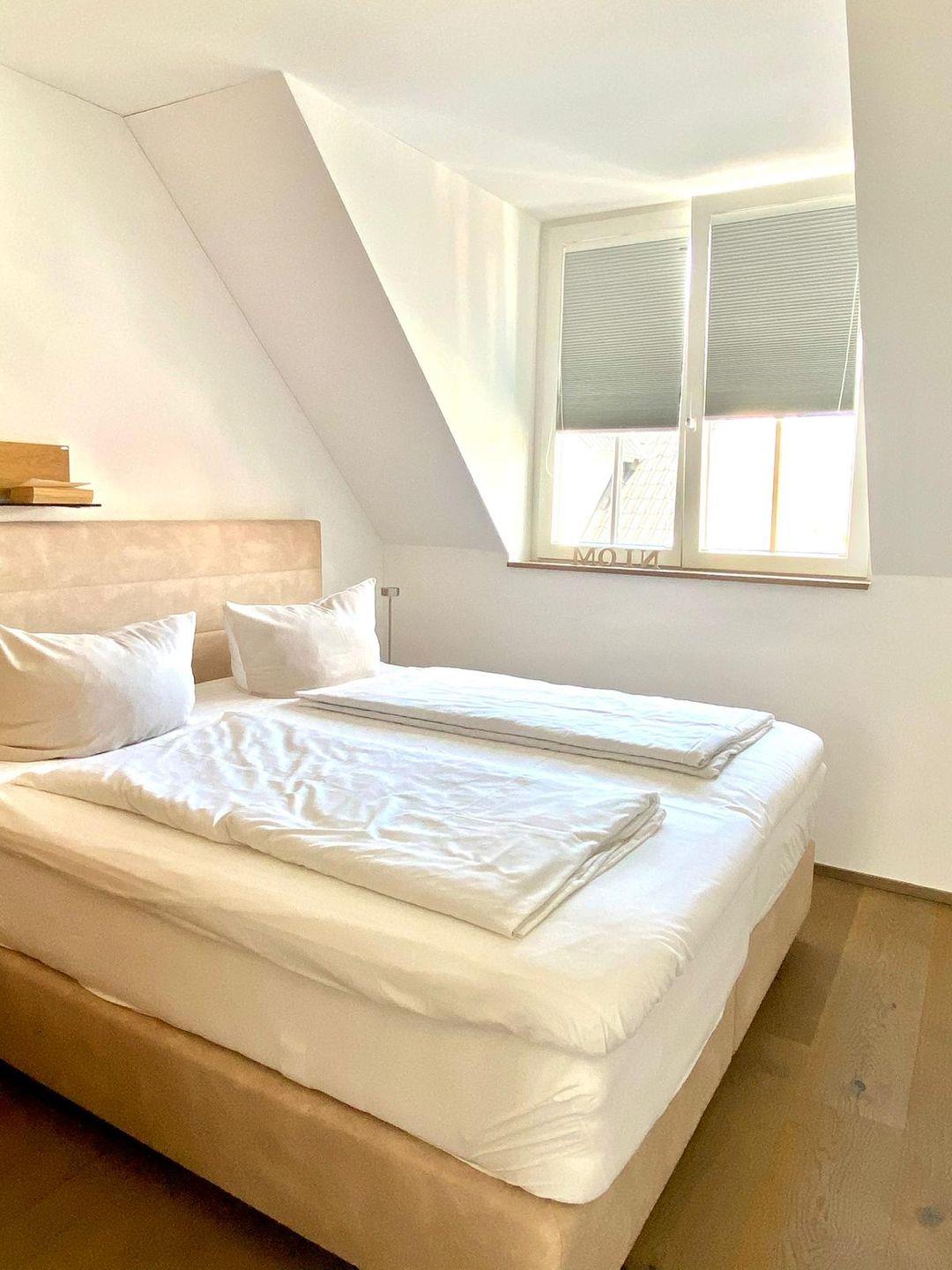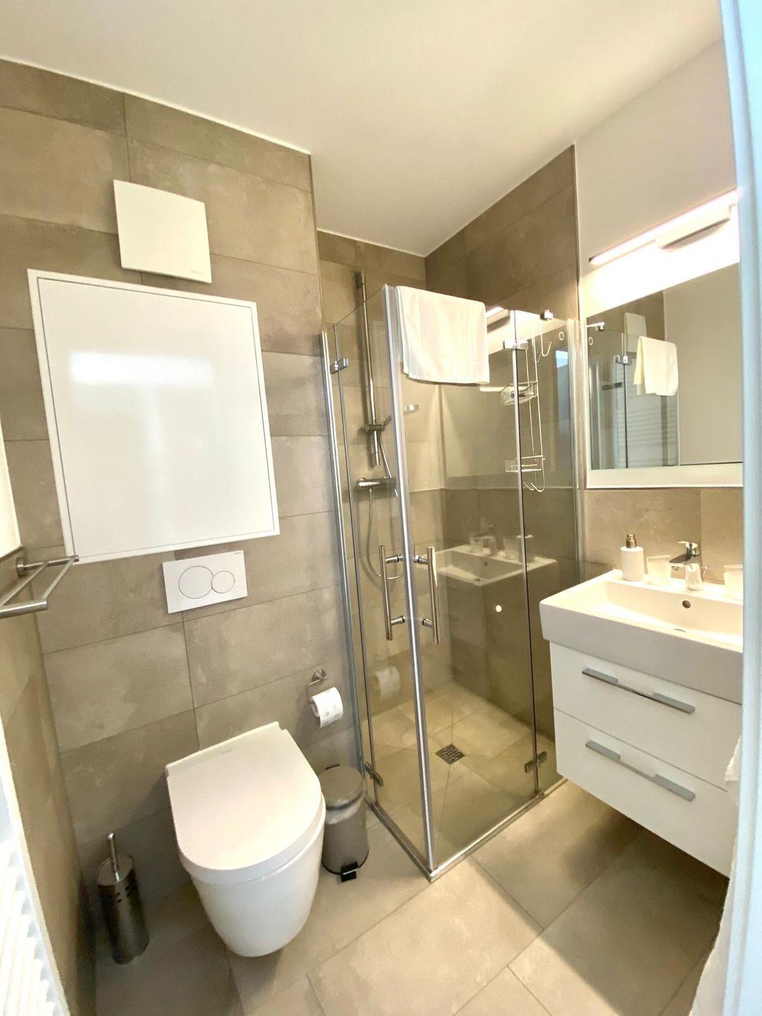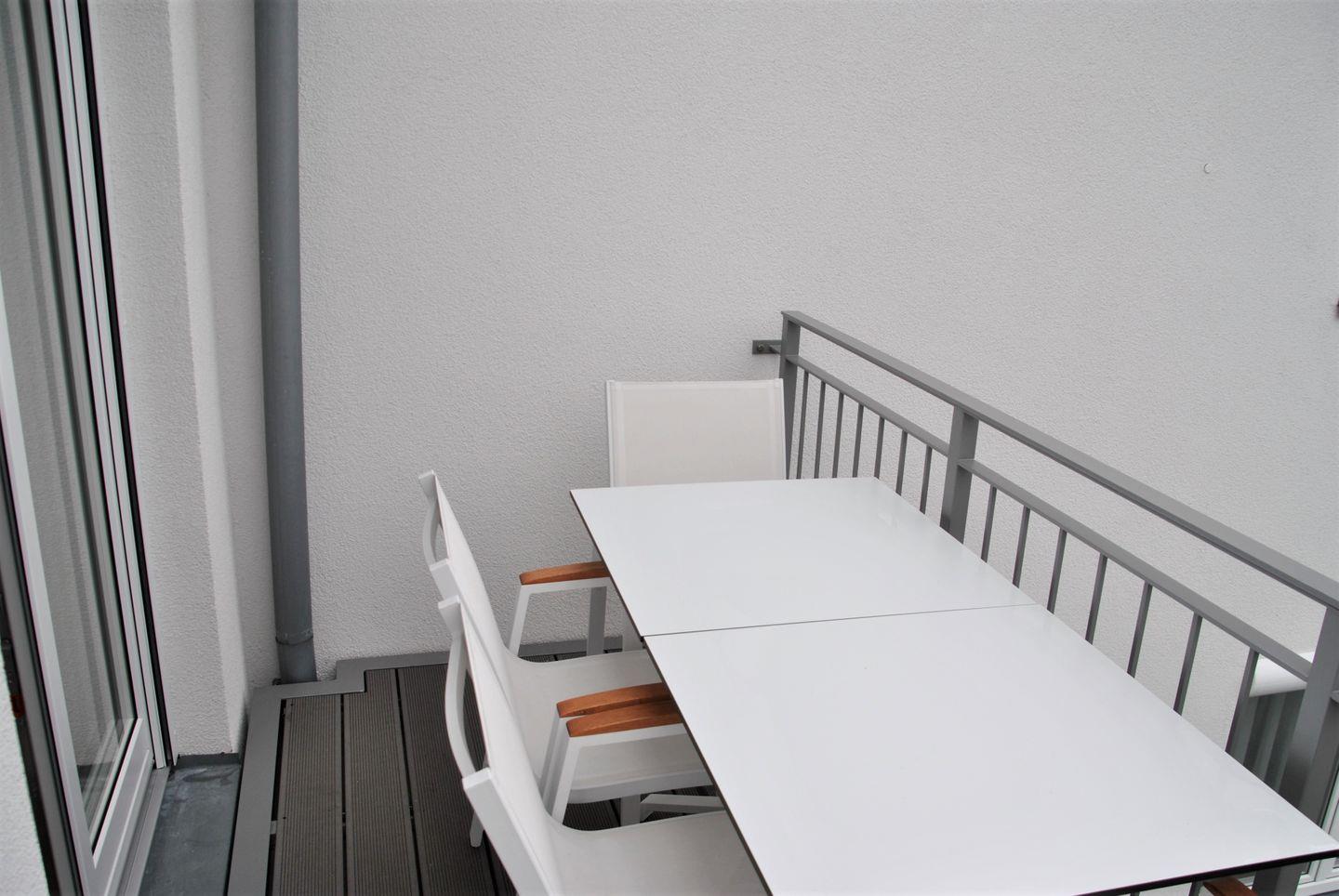 Das Neubau-Appartement in der 2. Etage verfügt über einen Wohnraum mit Essbereich (TV) und Küchenzeile (Kaffeemaschine, Backofen, Cerankochfeld), ein Schlafzimmer mit Boxspringbett sowie Fernseher und ein Badezimmer mit Dusche/WC. Vom Wohn- und Schlafraum haben Sie Zugang zu einem Balkon.
