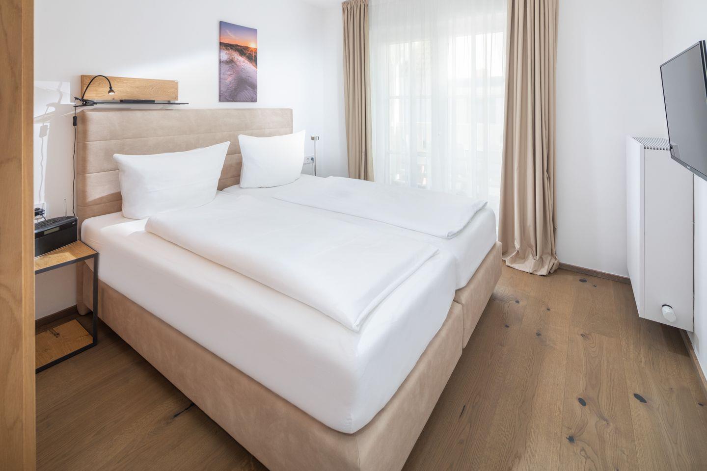 Essbereich (TV) und Küchenzeile, ein Schlafzimmer mit Boxspringbett samt TV und