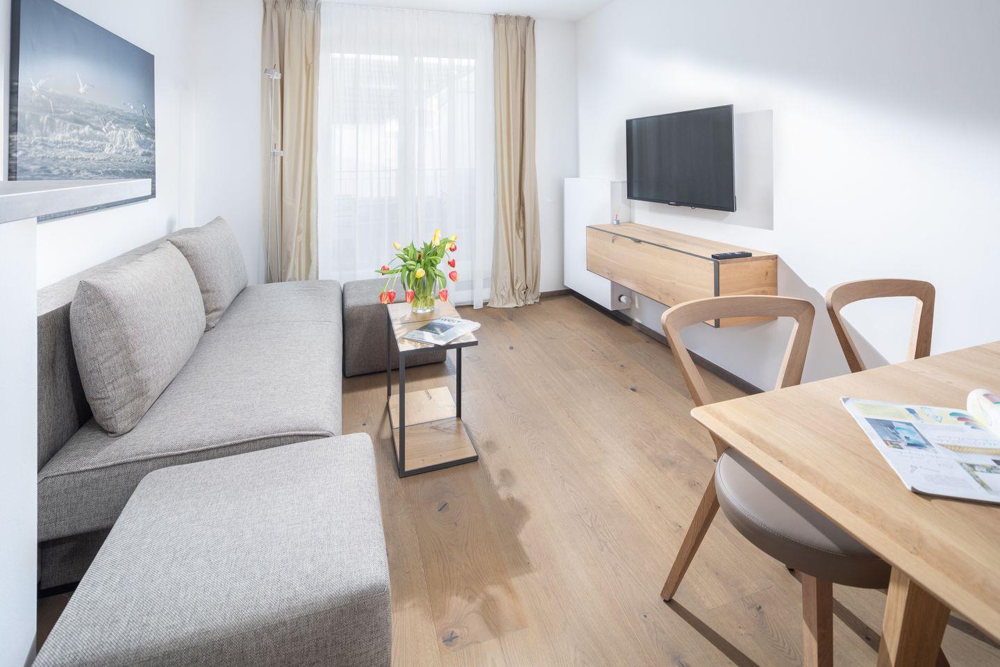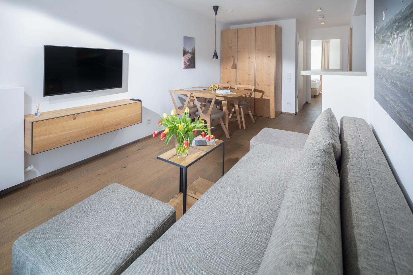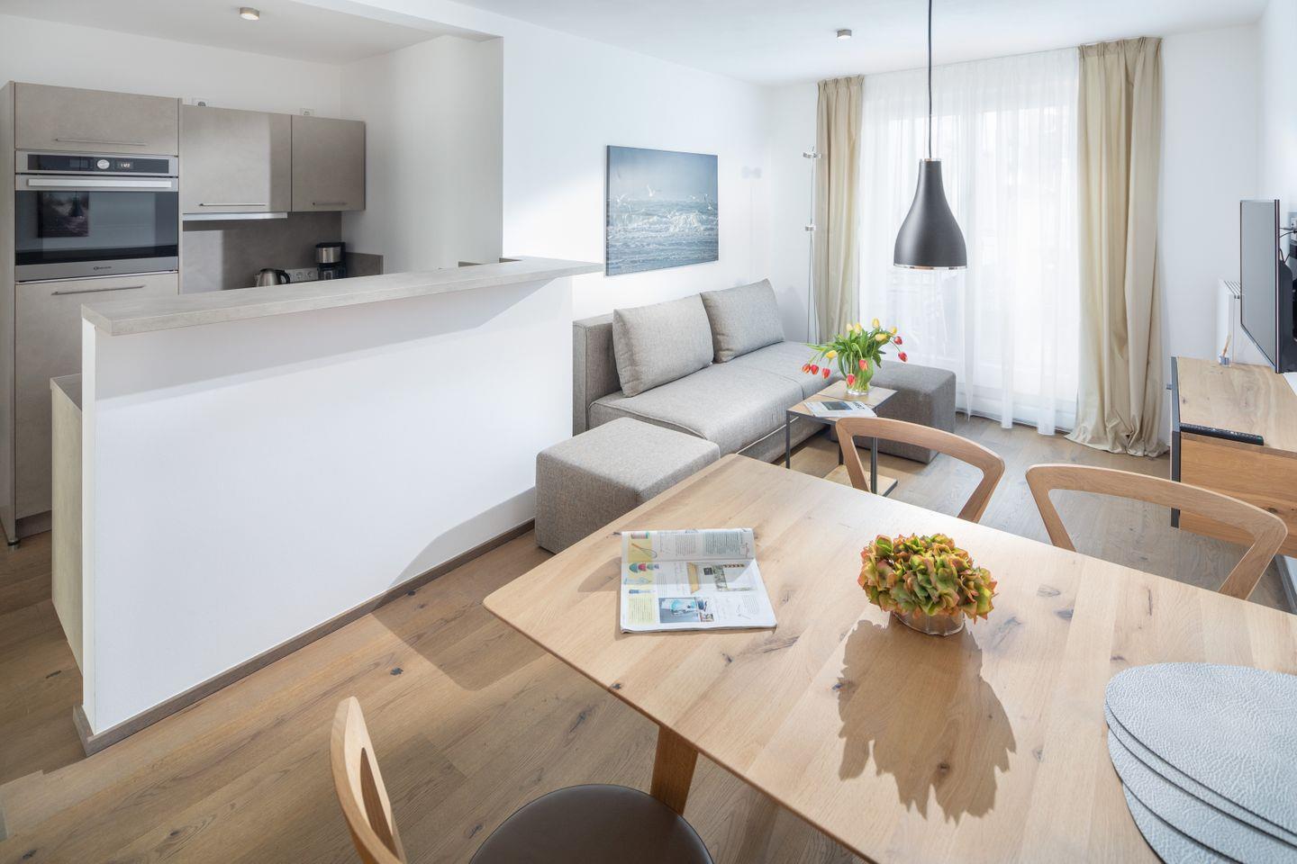Das Neubau-Appartement in der 1. Etage verfügt über einen Wohnraum mit
