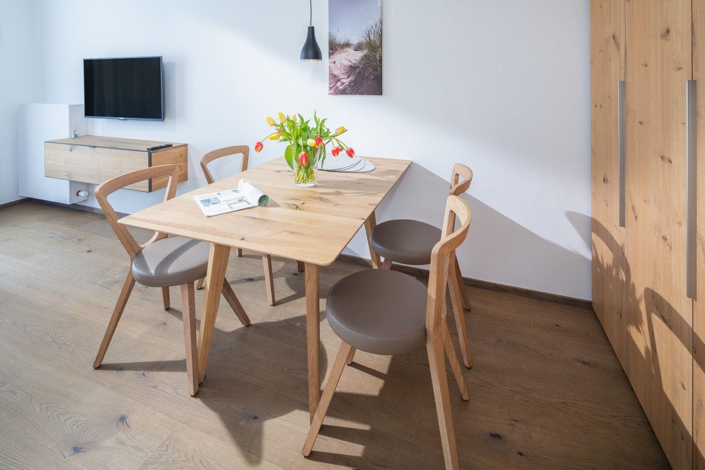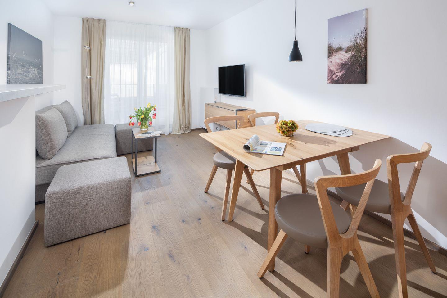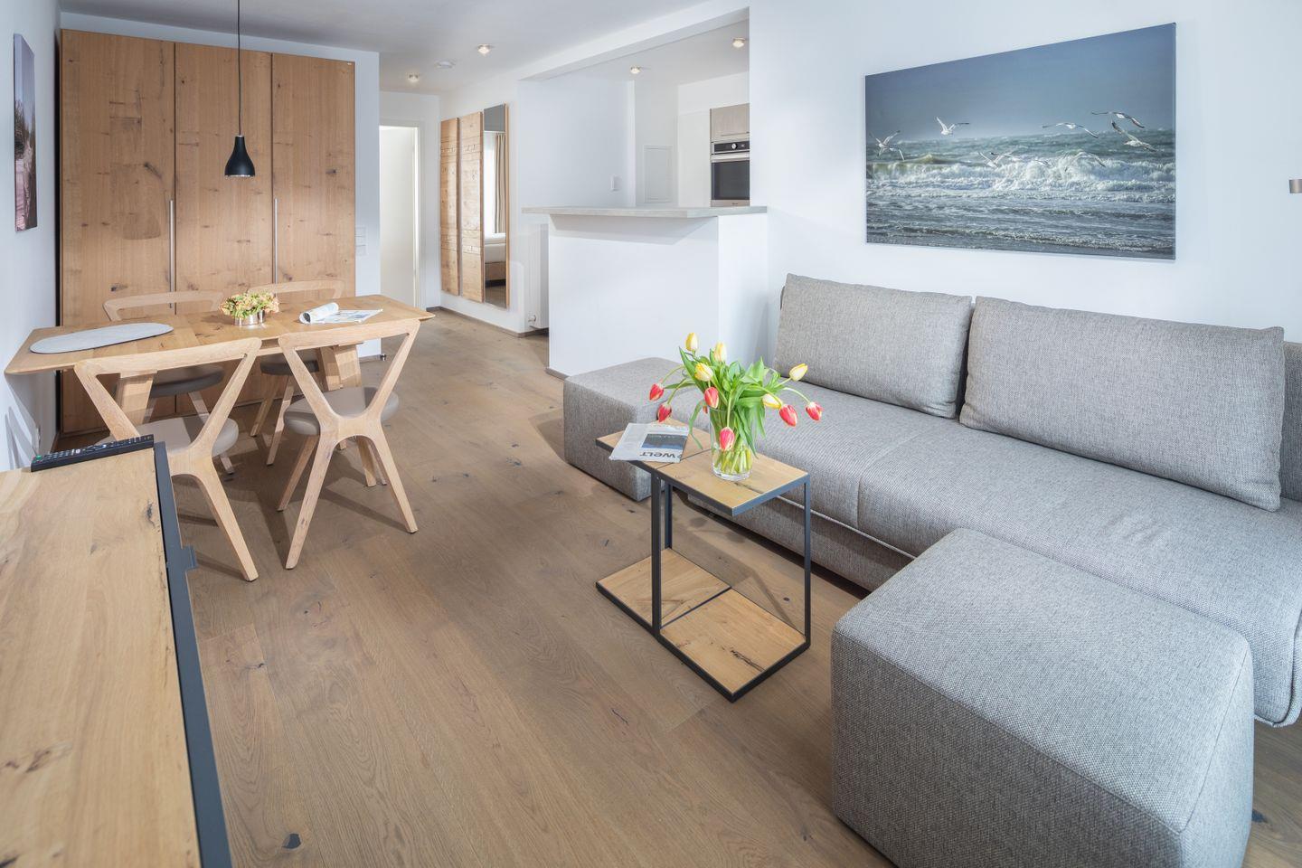 Das Neubau-Appartement in der 1. Etage verfügt über einen Wohnraum mit