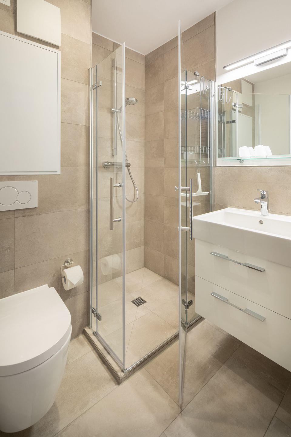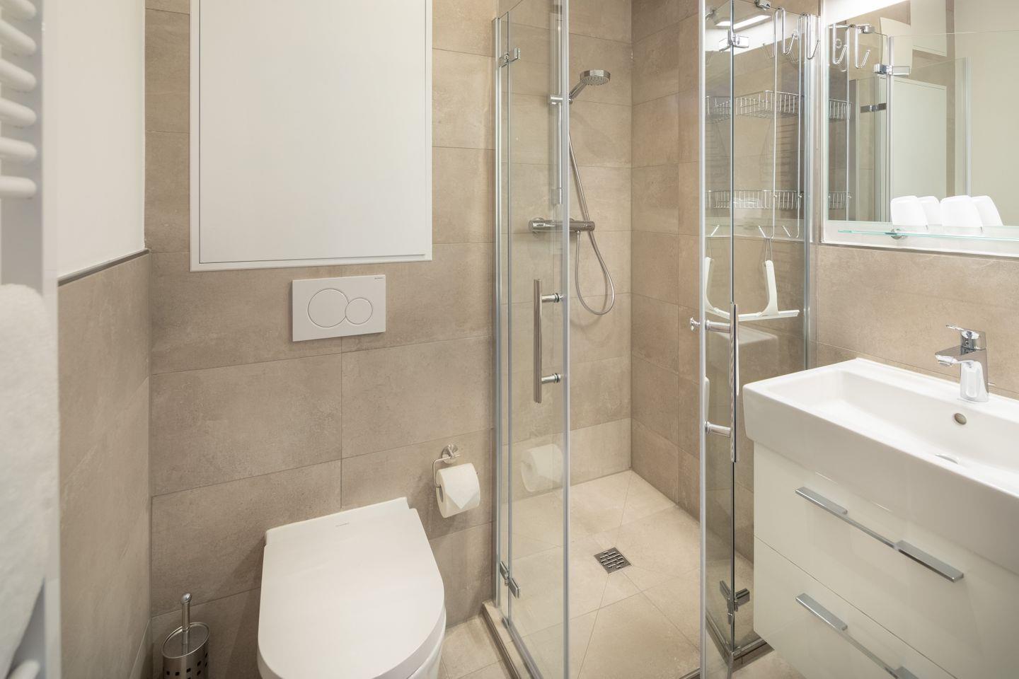 ein Badezimmer mit Dusche/WC. Vom Wohnraum haben Sie Zugang zu einem Balkon und