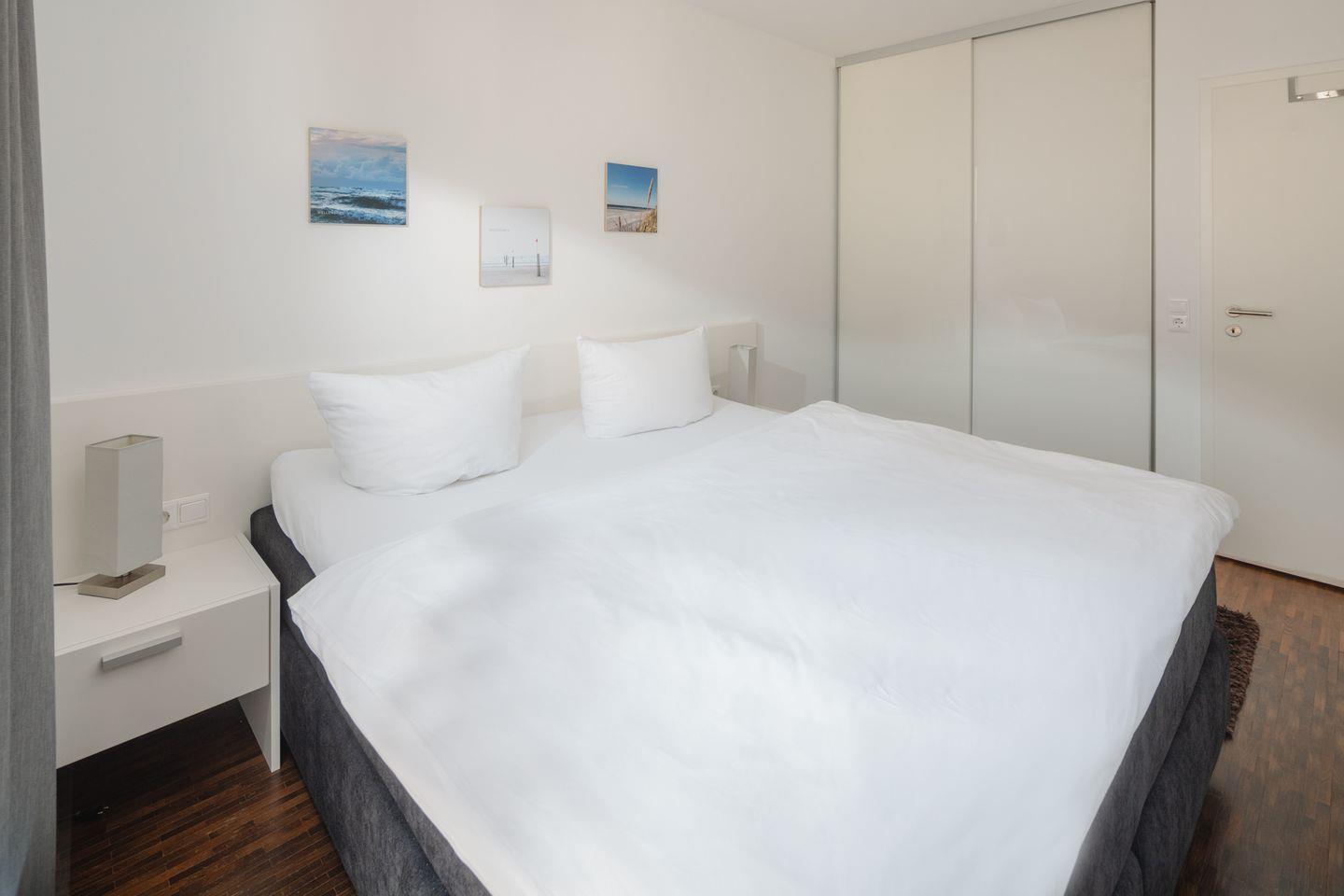 Im Erdgeschoss finden Sie zwei gemütliche Schlafzimmer. Das erste Schlafzimmer ist mit einem großzügigen Doppelbett der Größe 180x200cm ausgestattet, um Ihnen erholsame Nächte zu bescheren. Das zweite Schlafzimmer bietet mit einem Boxspringbett (180x200cm) und einem Schrankbett (90x200cm) flexible Schlafmöglichkeiten für bis zu drei Personen.