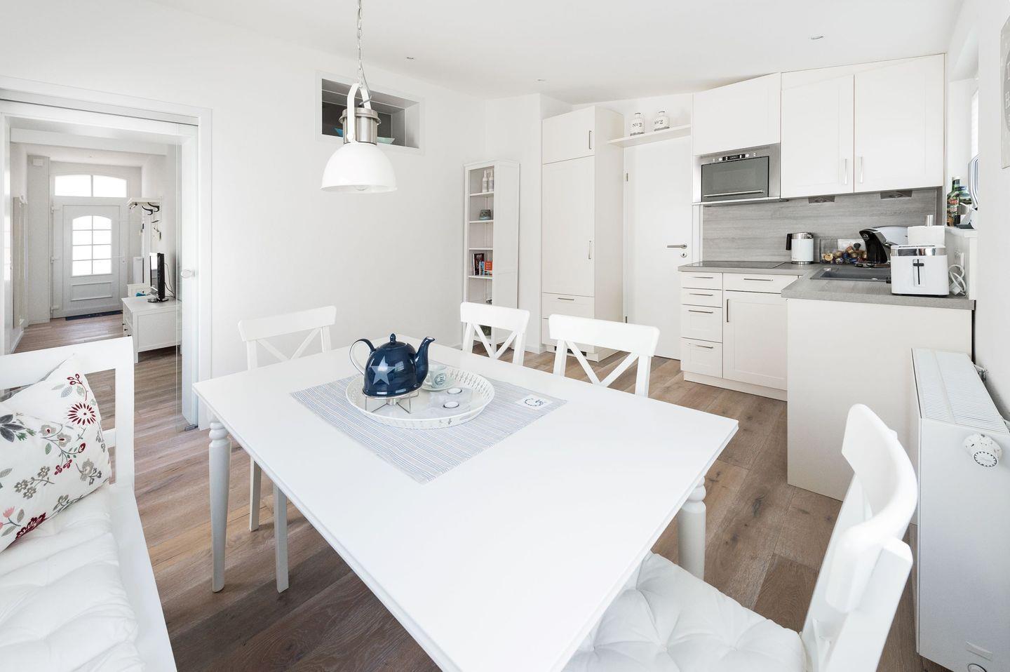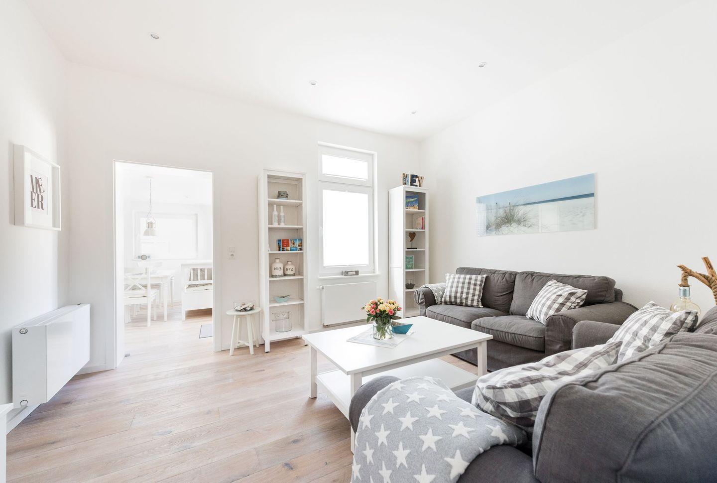 Die freundliche 3-Raum-Ferienwohnung im Erdgeschoss verfügt über ein separates Schlafzimmer mit Doppelbett, ein separates Schlafzimmer mit Doppelbett (nicht von beiden Seiten zugänglich - an der Wand stehend!), großzügigen Wohnraum (TV) mit Küchenzeile (Spülmaschine) und Essbereich sowie Badezimmer mit Dusche/ WC (Waschmaschine/ Trockner vorhanden). Von der Küche gelangen Sie auf die Terrasse mit angrenzendem kleinen Garten. Hier kann auch in aller Ruhe und abseits des trubeligen Strandes die Sonne genossen werden. Gäste-WC vorhanden. WLAN. NICHTRAUCHERWOHNUNG!