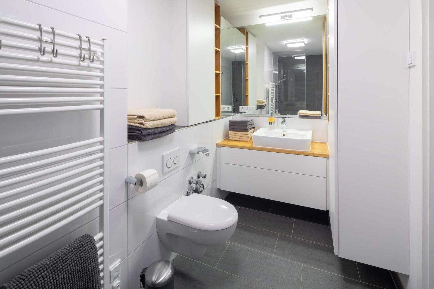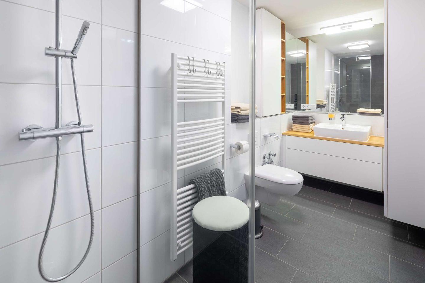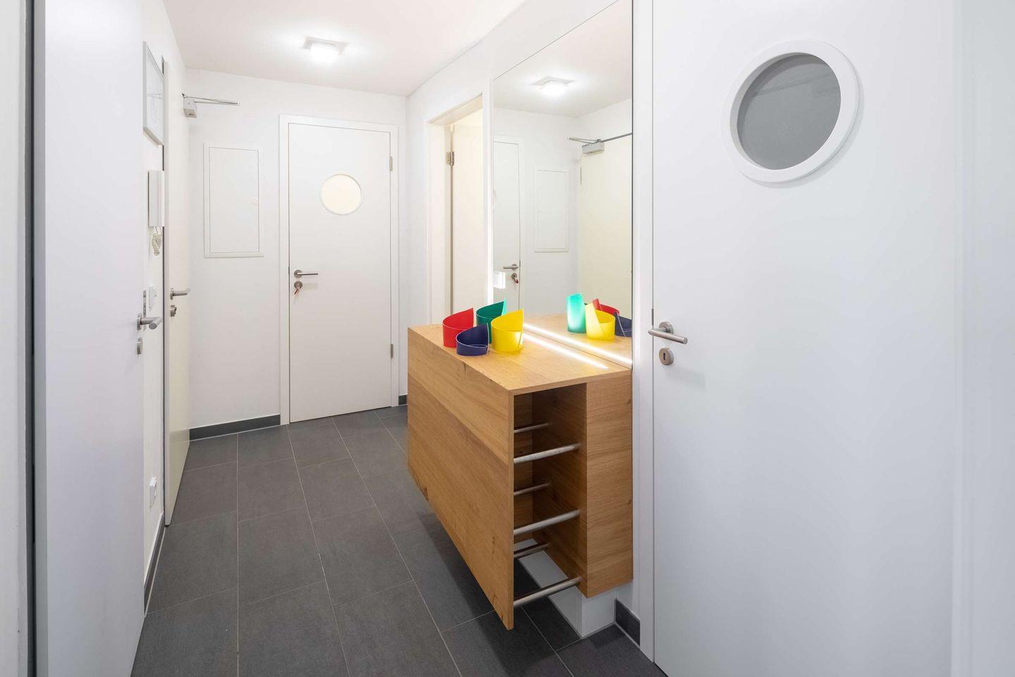 Die Wohnung ist bequem über einen Liftzugang direkt in den Wohnbereich erreichbar, was besonders komfortabel ist. Sie betreten die Wohnung durch einen großzügigen Garderobenbereich, der ausreichend Platz für Ihre persönlichen Dinge bietet. Insgesamt verfügt die Wohnung über zwei Schlafzimmer, beide ausgestattet mit einem eigenen TV für individuelle Unterhaltung.