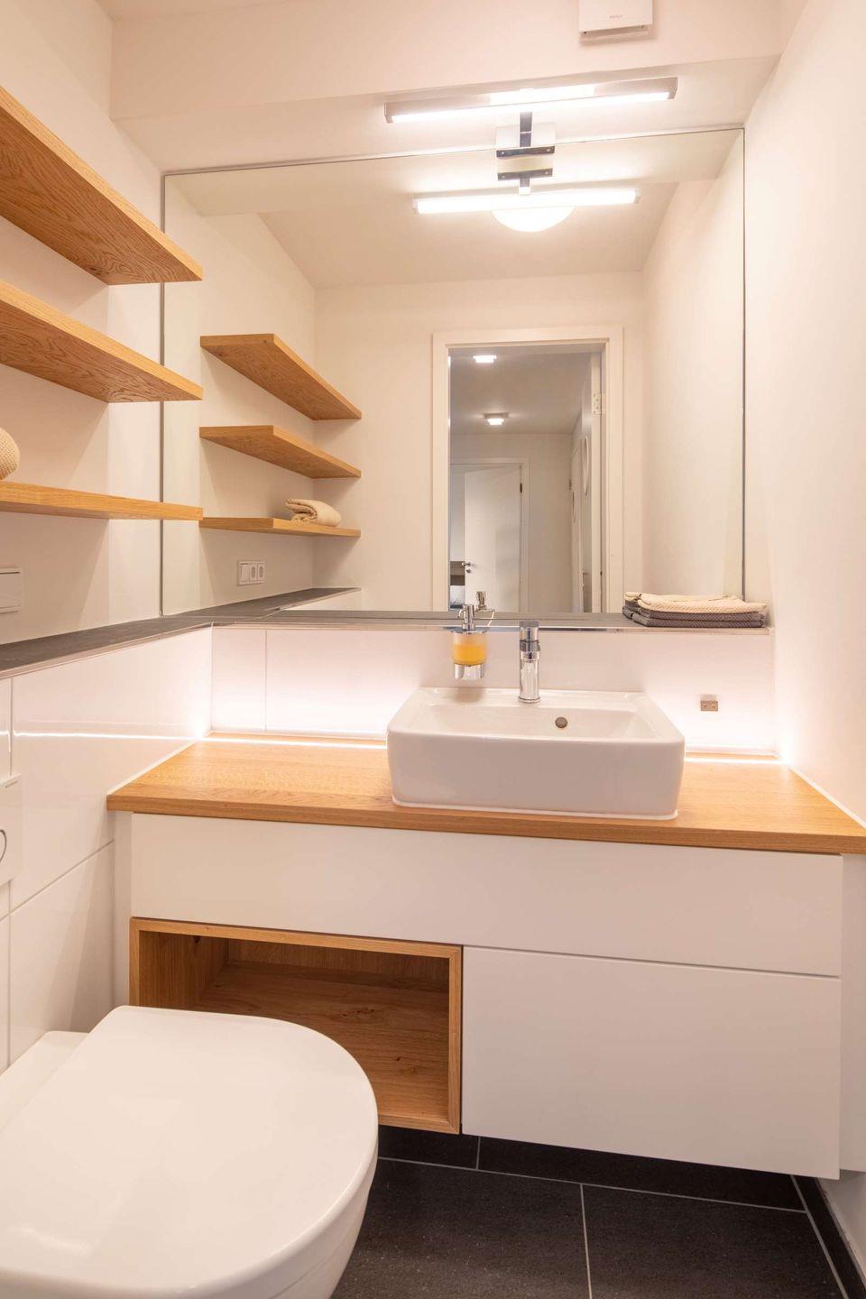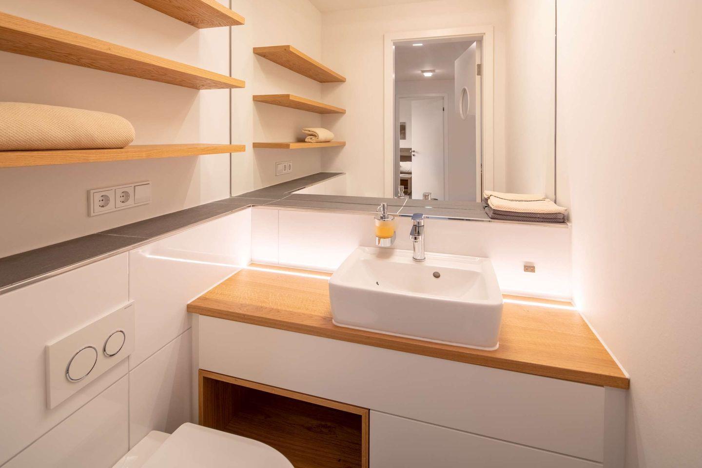 In der darunter liegenden Etage, die sowohl durch die Treppe in der Wohnung als auch durch den Lift zu erreichen ist, befinden sich das Hauptschlafzimmer, das Badezimmer, die Garderobe und das Gäste-WC auf dem Flur.