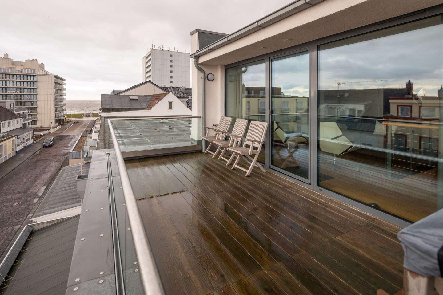 Die Ferienwohnung Bowendeck befindet sich im Schippers Huus, in der Bismarckstraße 7 auf Norderney. Sie bietet mit einen Liftzugang direkt in den Wohnbereich, einen großzügigen Garderobenbereich, zwei Schlafzimmer mit TV, ein Wohnraum mit Schlafcouch, eine offene Wohnküche, ein Badezimmer mit ebenerdiger Dusche und ein separates Gäste-WC.Der Wohnung erstreckt sich über zwei Etagen. In der oberen Etage (4), befindet sich Wohnzimmer mit Küche, sowie ein Schlafzimmer und der Zugang zum großen Balkon mit Meerblick und weitem Blick über die Dächer der Innenstadt – und dazu goldene Sonnenuntergänge für Ihre Entspannung auf Deck. In der darunter liegenden Etage, die sowohl durch die Treppe in der Wohnung, also auch durch den Lift zu erreichen ist, befindet sich das Hauptschlafzimmer, das Badezimmer, sowie die Garderobe und das Gäste WC (auf dem Flur).