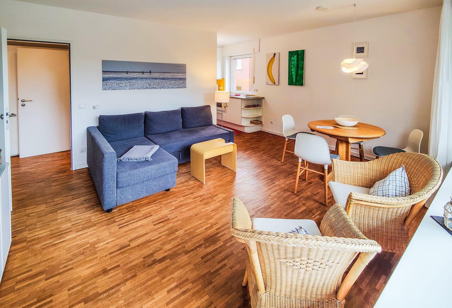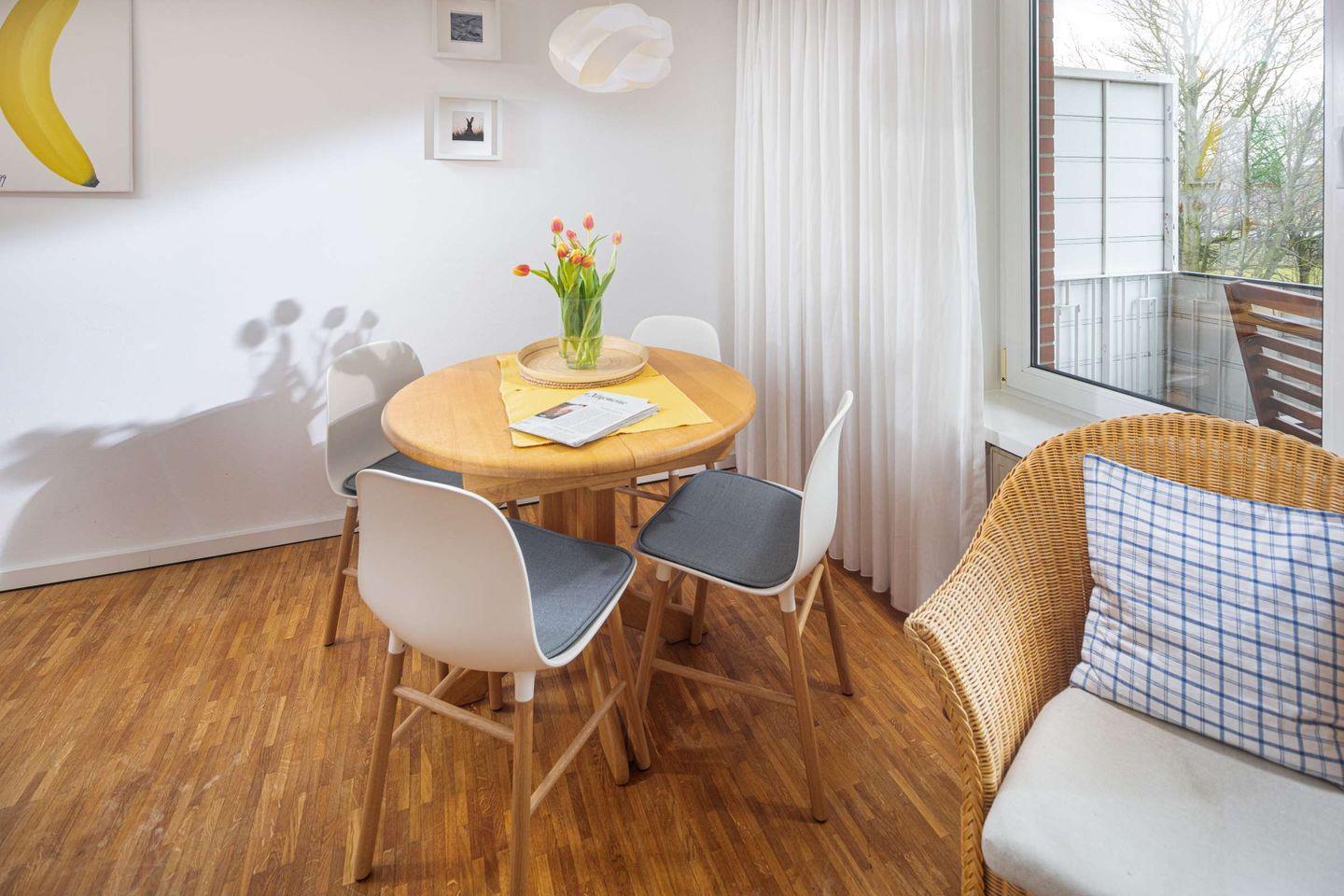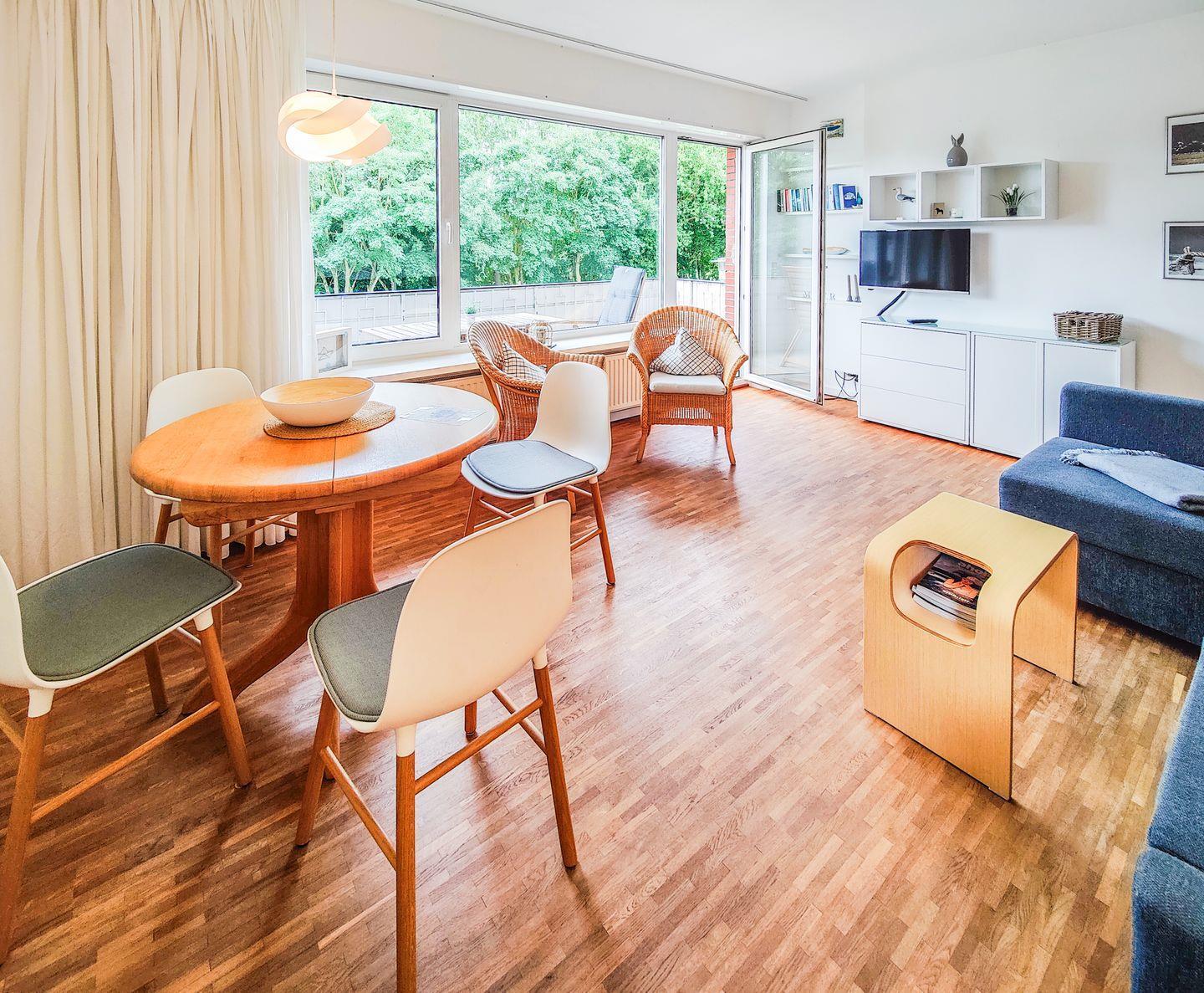 Der möblierte Süd-Balkon mit Markise lädt dazu ein, sonnige Tage im Freien zu genießen. Das lichtdurchflutete Wohn-Esszimmer verfügt über ein komfortables Schlafsofa, auf dem eine dritte Person untergebracht werden kann. Hier können Sie entspannte Stunden verbringen und den Blick nach draußen genießen.