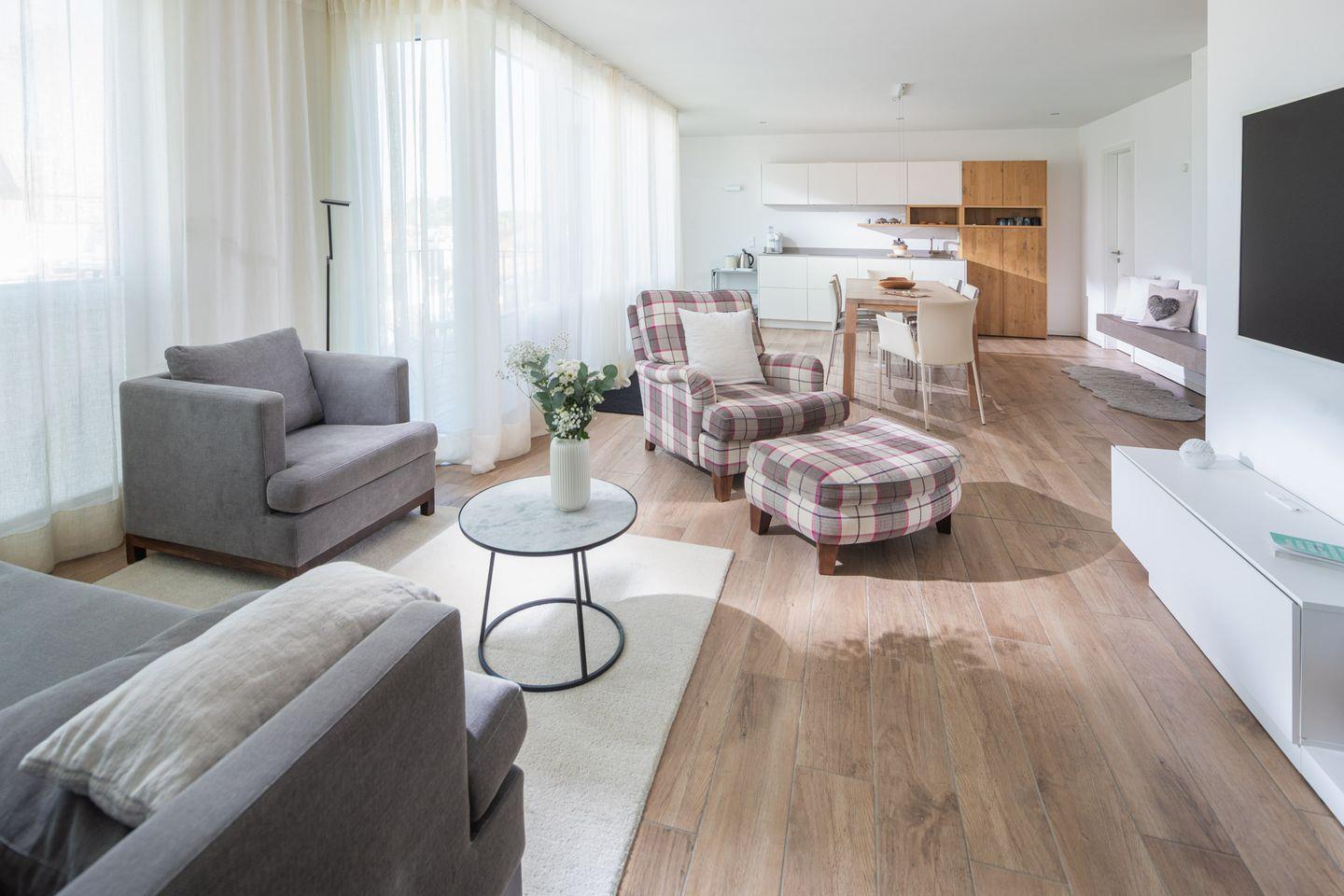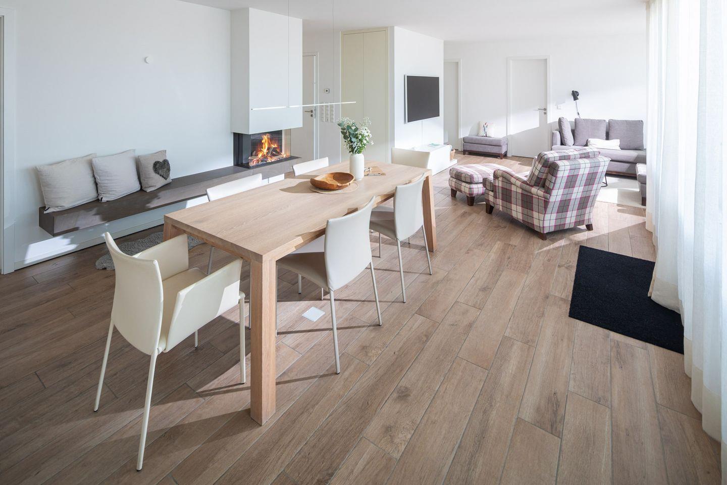 Das Wohnzimmer überzeugt mit einer hochwertigen, voll ausgestatteten Küche, einem gemütlichen Kamin sowie einem großen Smart-TV – ideal für entspannte Abende. Auch in beiden Schlafzimmern stehen Smart-TVs zur Verfügung.