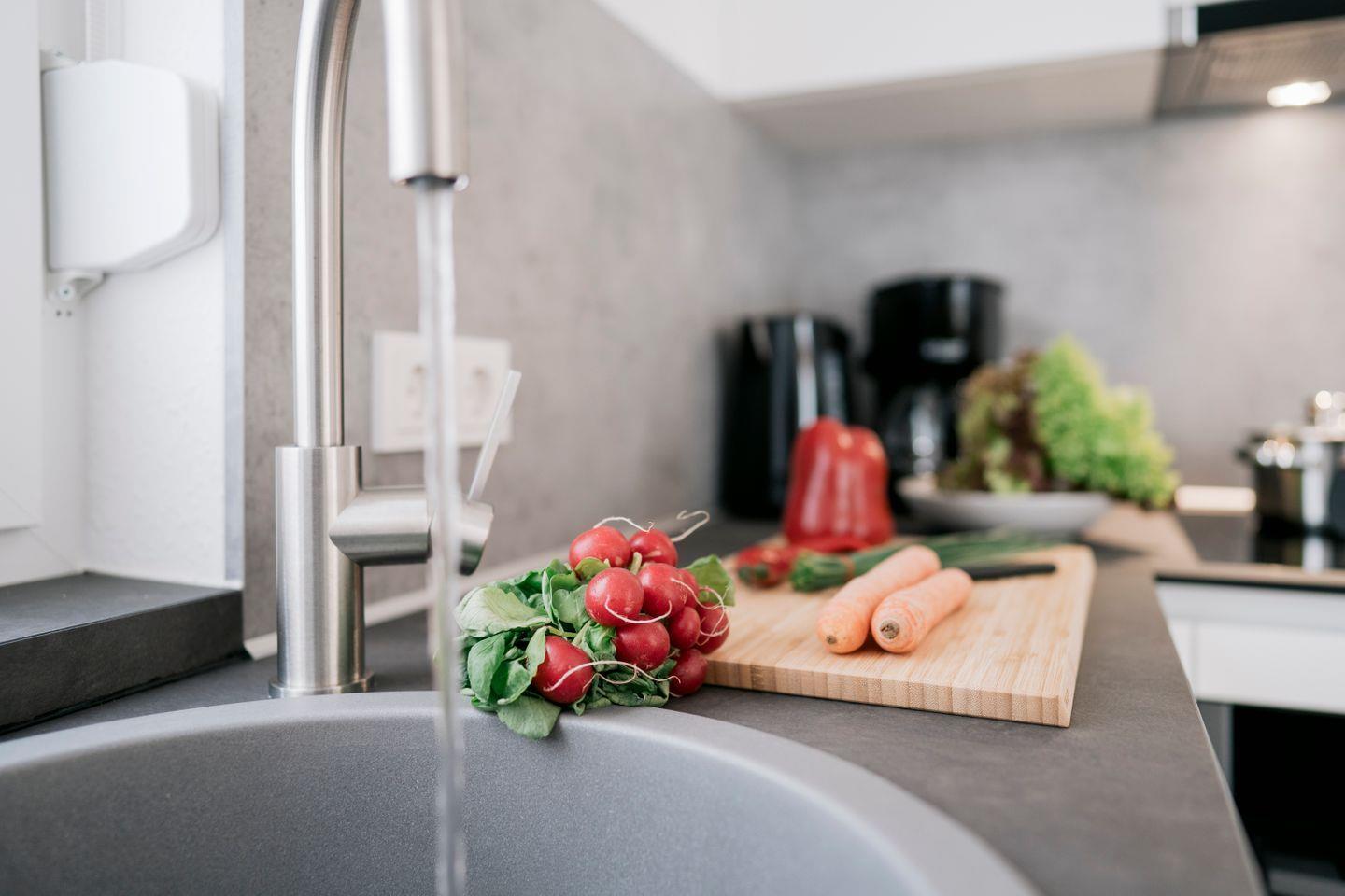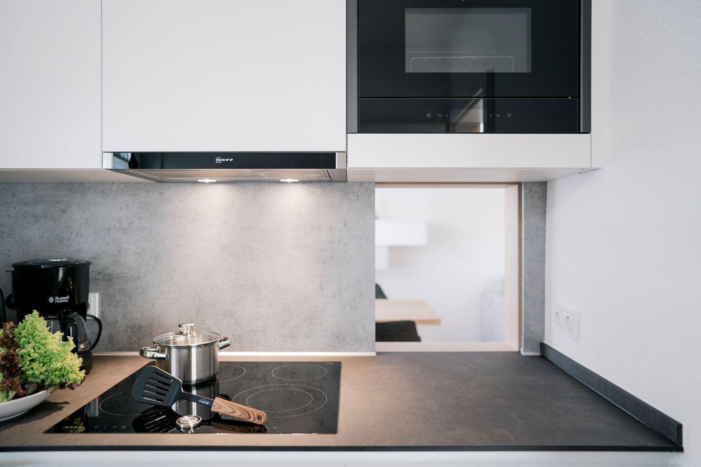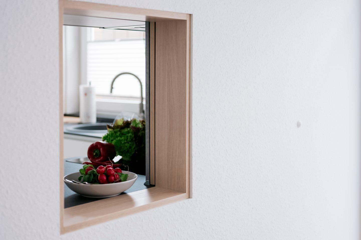 Die voll ausgestattete Küche lässt keine Wünsche offen: Induktions-Kochfeld, Backofen, Mikrowelle, Kühlschrank mit Gefrierfach, Geschirrspüler, Dunstabzugshaube mit Außenabzug, Toaster, Wasserkocher und Kaffeemaschine stehen bereit. Eine praktische Durchreiche verbindet Küche und Essbereich auf besonders komfortable Weise.