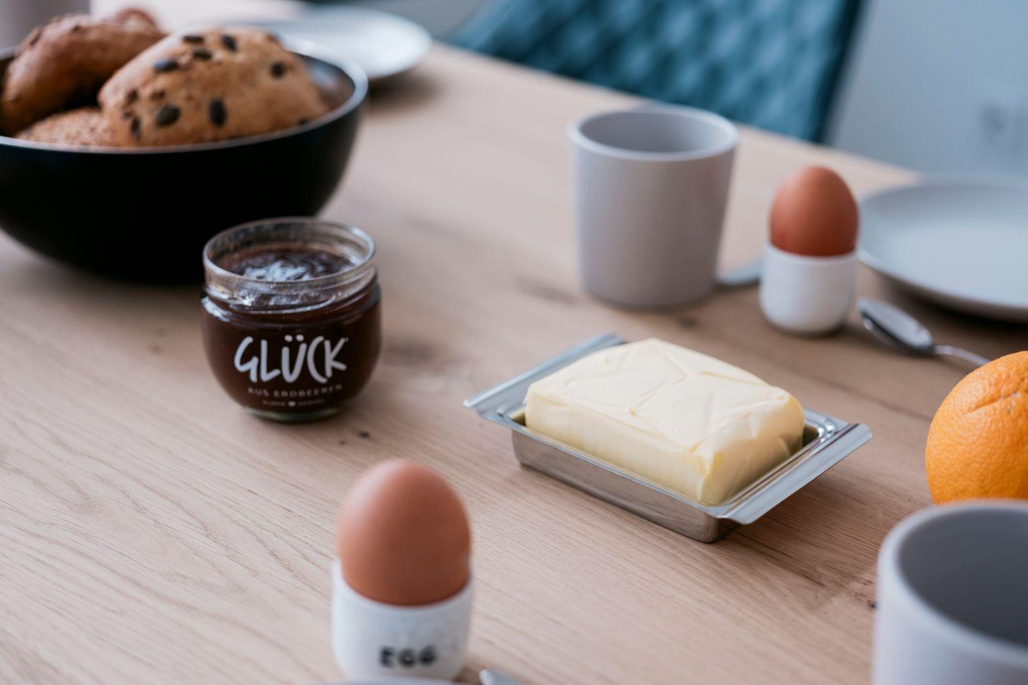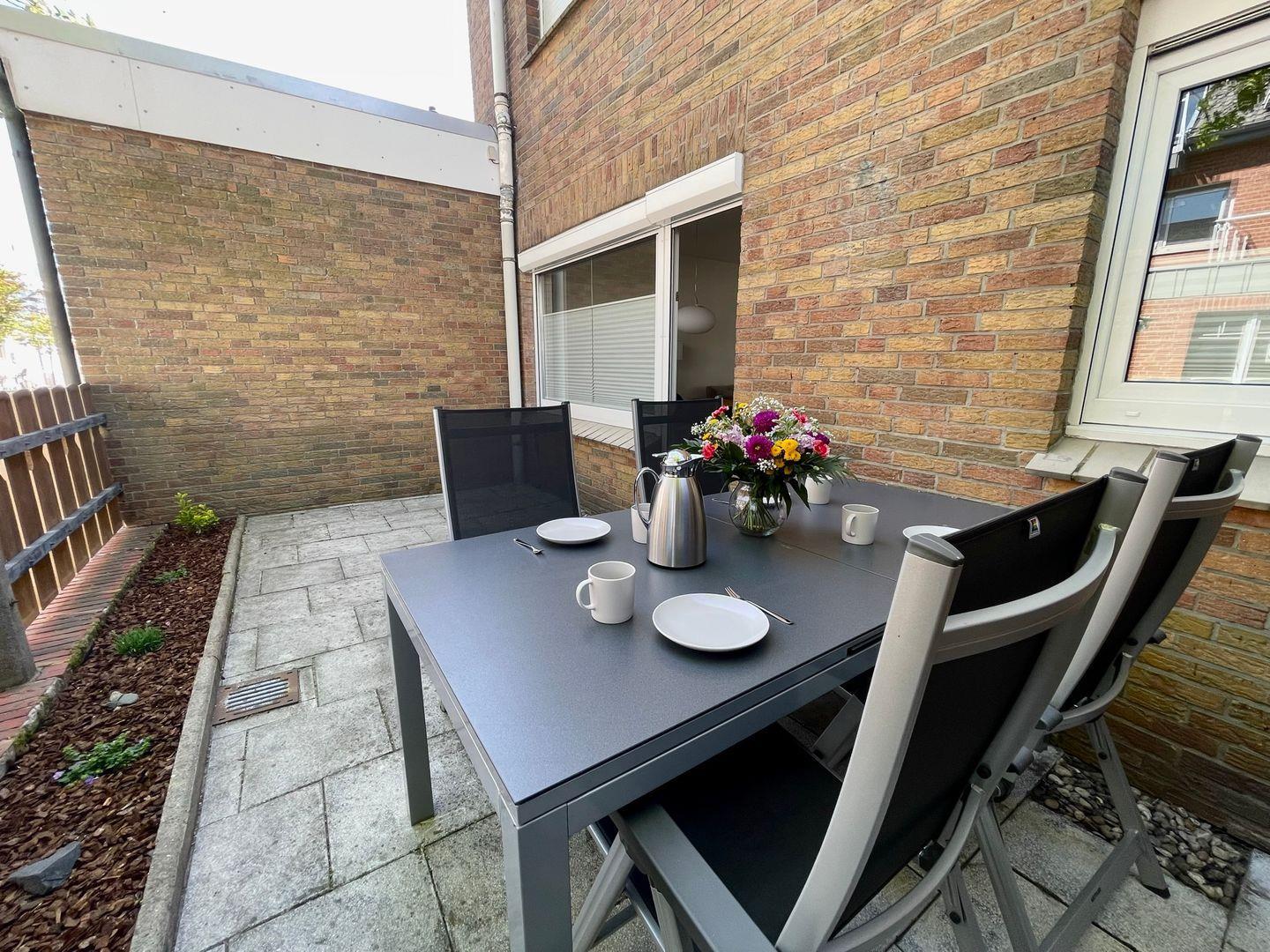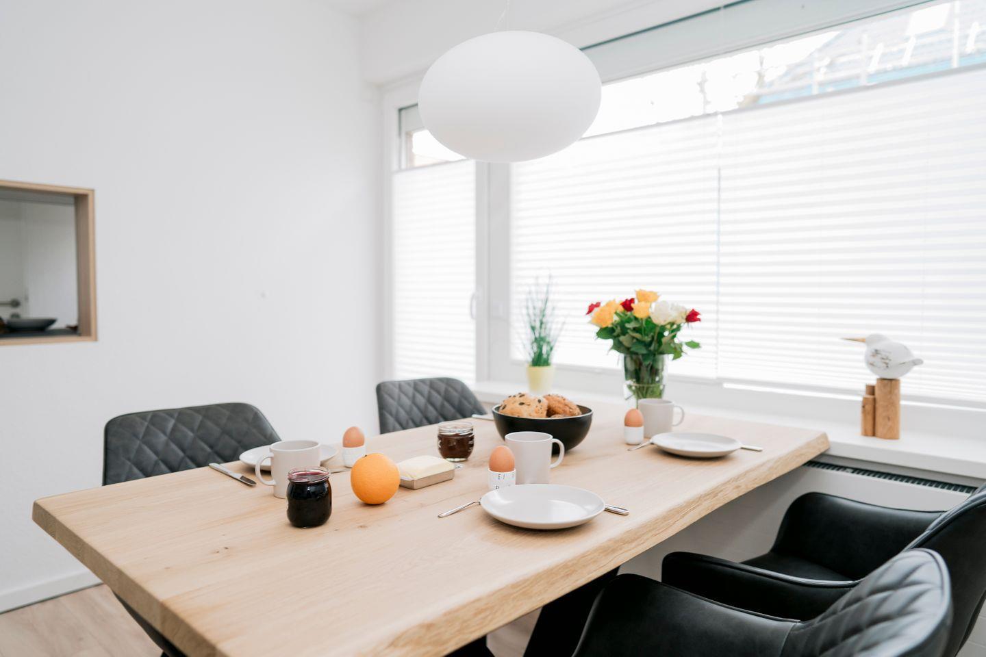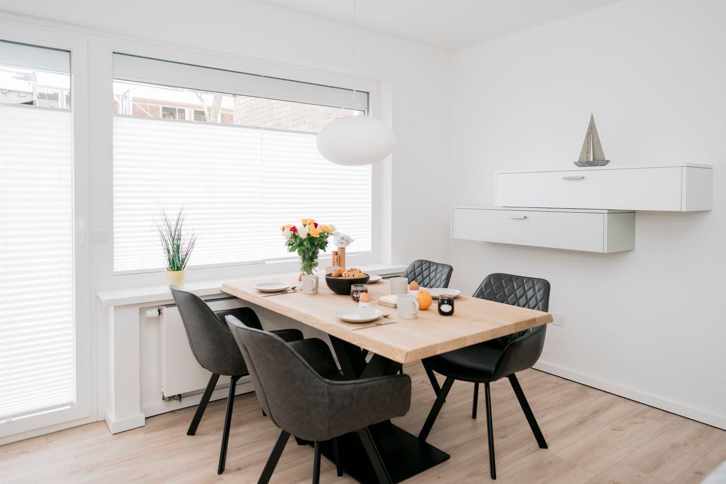 Im Erdgeschoss erwartet Sie ein lichtdurchfluteter Wohn- und Essbereich mit einem stilvoll eingerichteten Essplatz, an dem es sich nicht nur hervorragend speisen, sondern auch verweilen lässt. Die angrenzende Terrasse ist direkt vom Essbereich aus zugänglich und bietet reichlich Platz zum Sonnen, Essen im Freien oder Entspannen. Hochwertige Gartenmöbel stehen hierfür bereit.